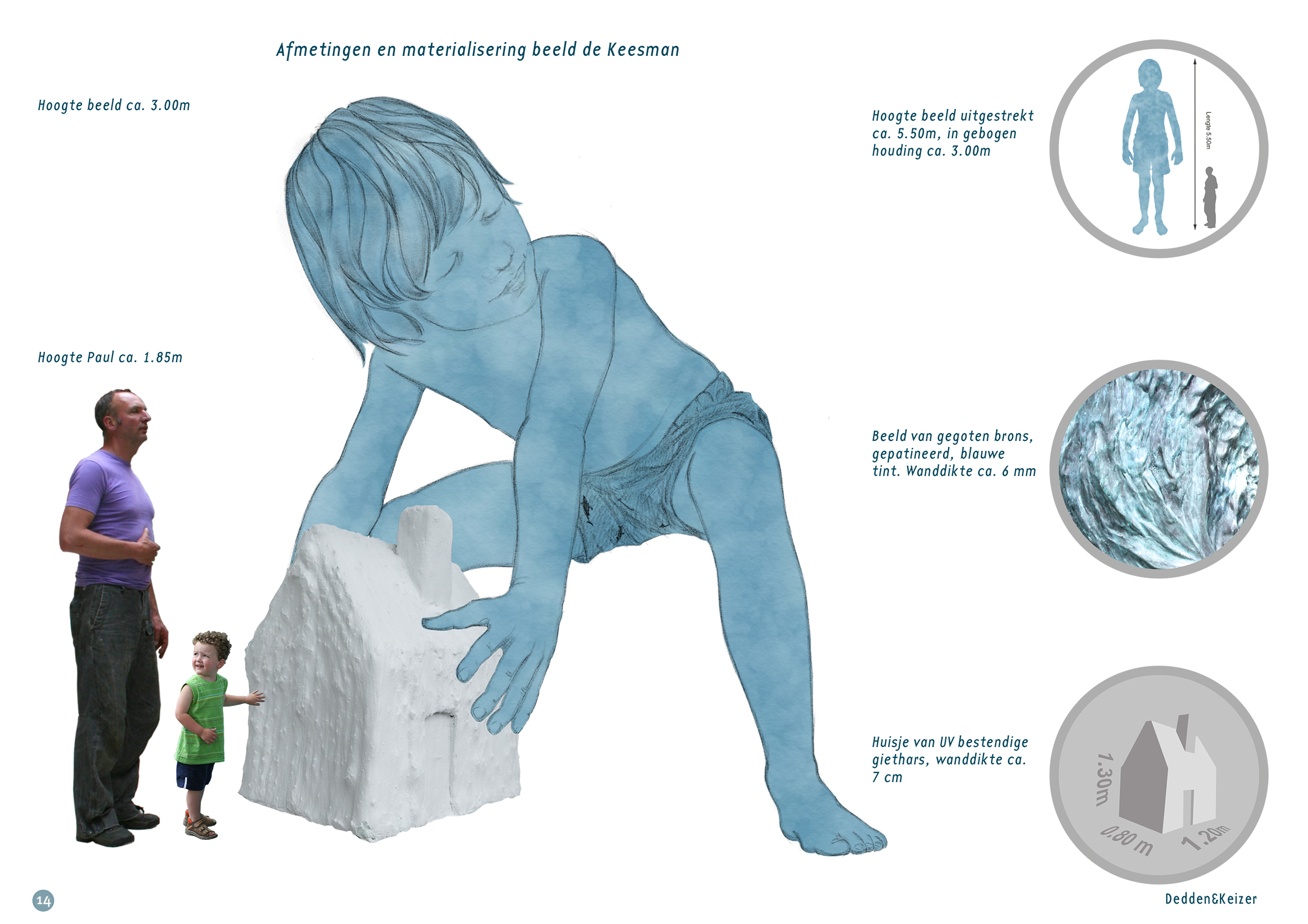 Bij ‘De Keesman’ staat in de groenstrook aan de rand van de weg (vanaf de rotonde richting de nieuwe woningen) een tamelijk forse bronzen sculptuur. Een ‘Gulliver’-achtige reus in het lijf van een achtjarige jongen. Ook al heeft de jongen het formaat van een reus, zijn lichaam blijft die kenmerkende jeugdige bevalligheid houden. Dat is vooral ook zichtbaar omdat ie alleen een vrolijke zwembroek aanheeft. De jongen is diep door de knieën gebogen, zijn armen zijn naar voren gestrekt en hij heeft z’n hoofd iets schuin naar opzij gericht. Zijn ogen zijn gesloten. Hij gaat helemaal op in datgene waar hij mee bezig is. In z’n handen heeft hij een huisje vast, een woninkje dat nog net niet op de grond staat. En ja, in de handen van dit reuzen kind lijkt het absoluut een speelgoedhuisje.