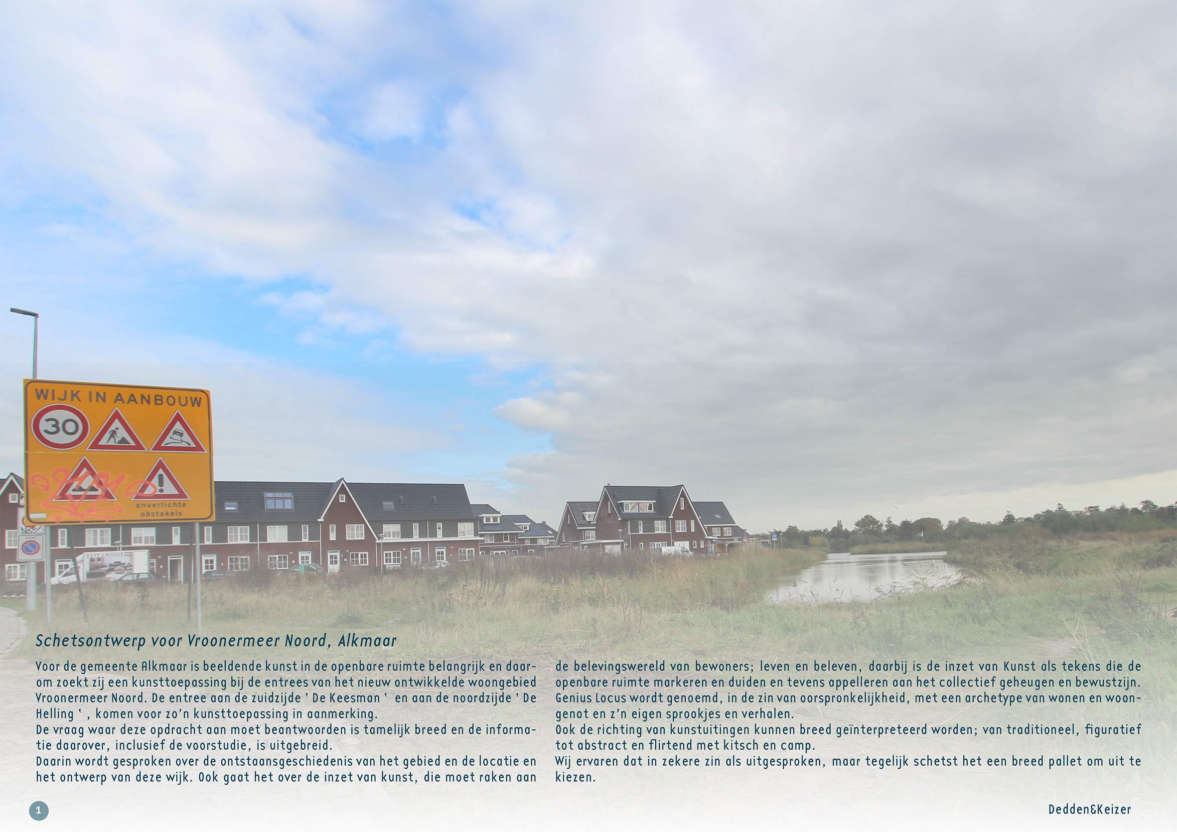 Voor de gemeente Alkmaar is beeldende kunst in de openbare ruimte belangrijk en daarom zoekt zij een kunsttoepassing bij de entrees van het nieuw ontwikkelde woongebied Vroonermeer Noord. De entree aan de zuidzijde ‘ De Keesman ‘ en aan de noordzijde ‘ De Helling ‘ , komen voor zo’n kunsttoepassing in aanmerking. De vraag waar deze opdracht aan moet beantwoorden is tamelijk breed en de informatie daarover, inclusief de voorstudie, is uitgebreid. Daarin wordt gesproken over de ontstaansgeschiedenis van het gebied en de locatie en het ontwerp van deze wijk. Ook gaat het over de inzet van kunst, die moet raken aan de belevingswereld van bewoners; leven en beleven. Daarbij is de inzet van Kunst als tekens die de openbare ruimte markeren en duiden. En tevens appelleren aan het collectief geheugen en bewustzijn.