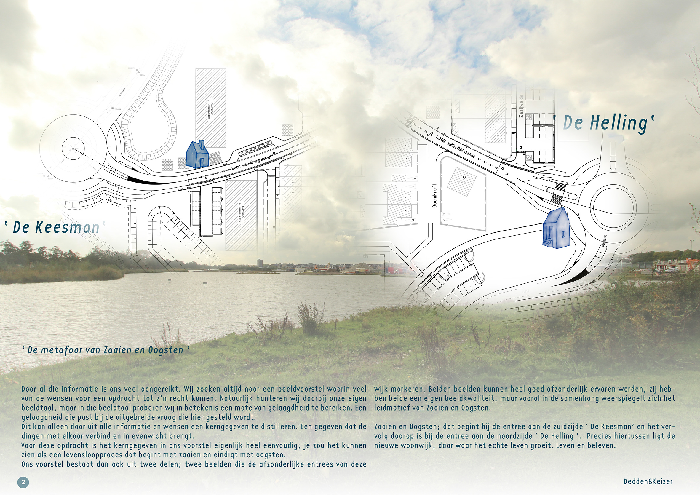 Ons voorstel bestaat dan ook uit twee delen; twee beelden die de afzonderlijke entrees van deze wijk markeren. Beiden beelden kunnen heel goed afzonderlijk ervaren worden, zij hebben beide een eigen beeldkwaliteit, maar vooral in de samenhang weerspiegelt zich het leidmotief van Zaaien en Oogsten. Zaaien en Oogsten; dat begint bij de entree aan de zuidzijde ‘ De Keesman’ en het vervolg daarop is bij de entree aan de noordzijde ‘ De Helling ‘. Precies hiertussen ligt de nieuwe woonwijk, daar waar het echte leven groeit. Leven en beleven.