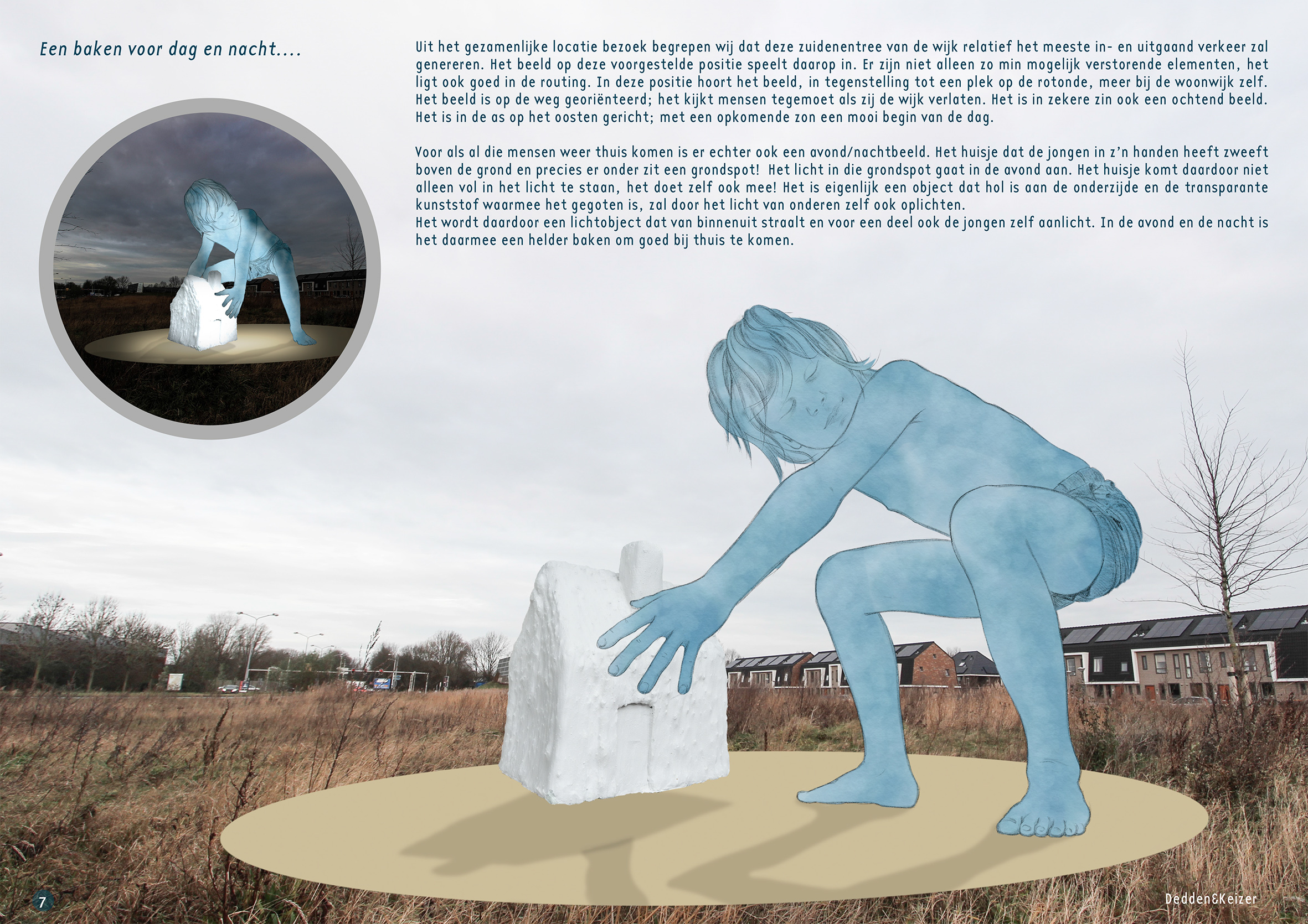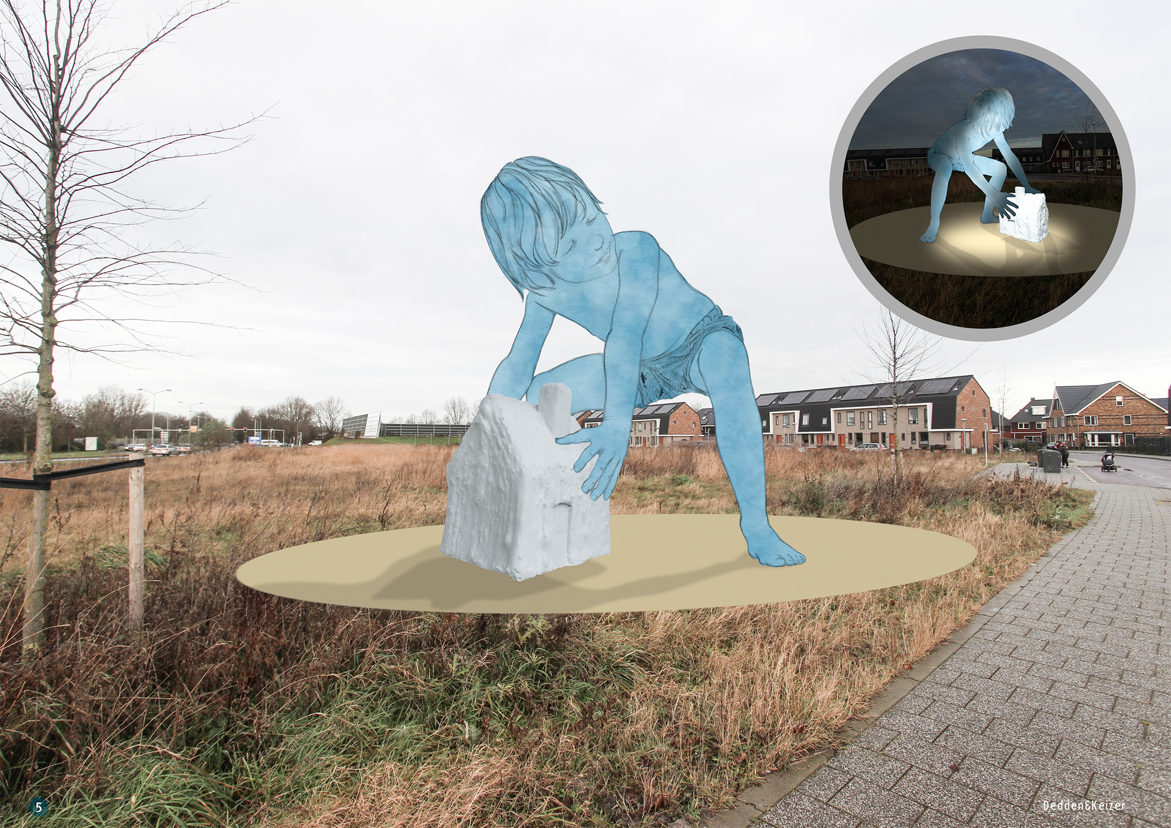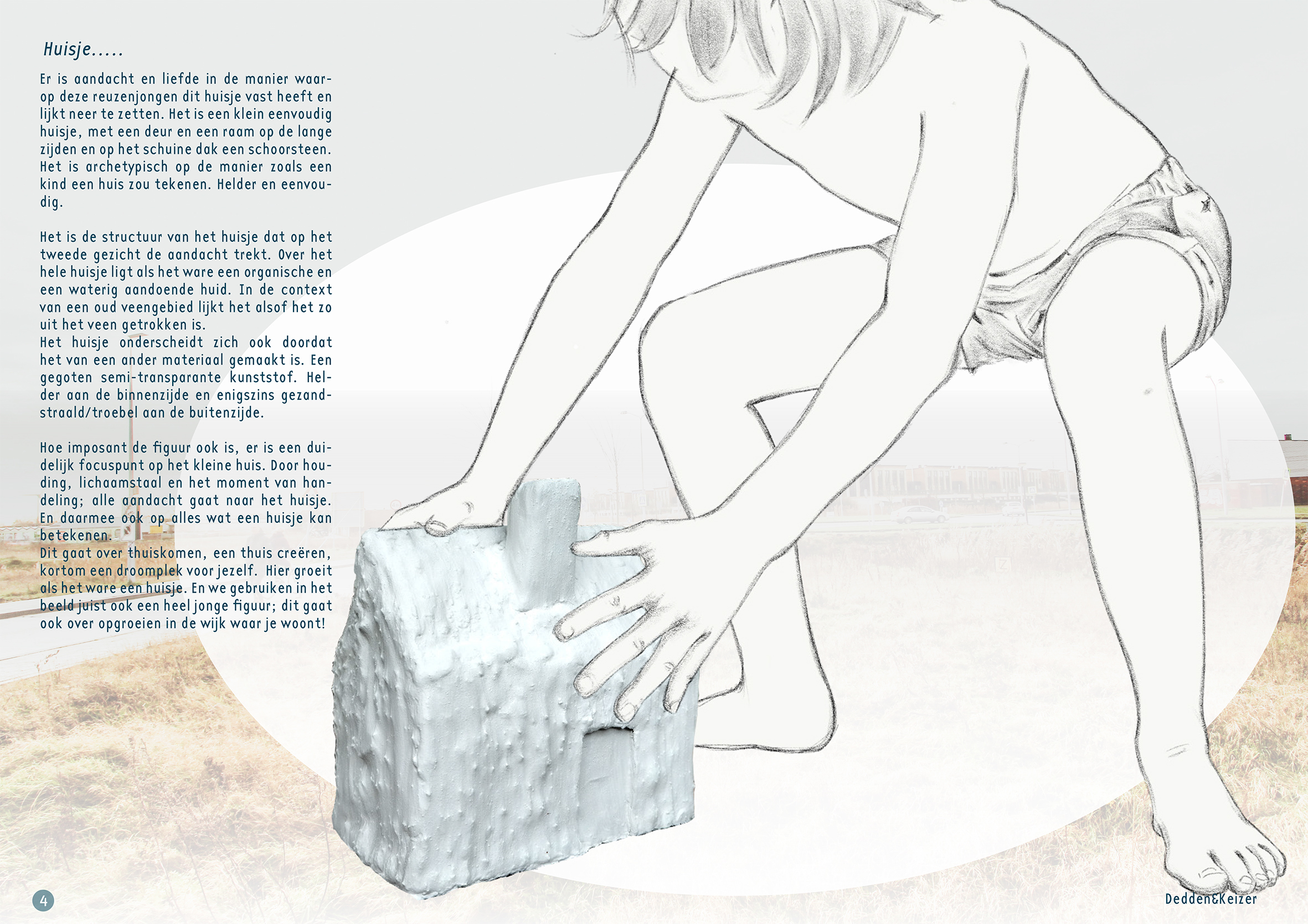 Er is aandacht en liefde in de manier waarop deze reuzenjongen dit huisje vast heeft en lijkt neer te zetten. Het is een klein eenvoudig huisje, met een deur en een raam op de lange zijden en op het schuine dak een schoorsteen. Het is archetypisch op de manier zoals een kind een huis zou tekenen. Helder en eenvoudig. Het is de structuur van het huisje dat op het tweede gezicht de aandacht trekt. Over het hele huisje ligt als het ware een organische en een waterig aandoende huid. In de context van een oud veengebied lijkt het alsof het zo uit het veen getrokken is. Het huisje onderscheidt zich ook doordat het van een ander materiaal gemaakt is. Een gegoten semi-transparante kunststof. Helder aan de binnenzijde en enigszins gezandstraald/troebel aan de buitenzijde. Hoe imposant de figuur ook is, er is een duidelijk focuspunt op het kleine huis. Door houding, lichaamstaal en het moment van handeling; alle aandacht gaat naar het huisje. En daarmee ook op alles wat een huisje kan betekenen. Dit gaat over thuiskomen, een thuis creëren, kortom een droomplek voor jezelf. Hier groeit als het ware een huisje. En we gebruiken in het beeld juist ook een heel jonge figuur; dit gaat ook over opgroeien in de wijk waar je woont!