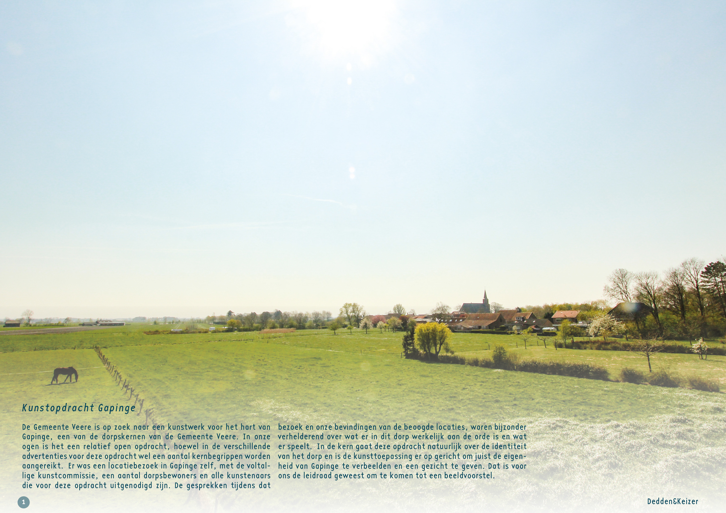 De Gemeente Veere is op zoek naar een kunstwerk voor in het hart van Gapinge,. Eén van de dorpskernen van de Gemeente Veere. In onze ogen is het een relatief open opdracht, hoewel in de verschillende advertenties voor deze opdracht wel een aantal kernbegrippen worden aangereikt.  Er was een locatiebezoek in Gapinge zelf, met de voltallige kunstcommissie, een aantal dorpsbewoners en alle kunstenaars die voor deze opdracht uitgenodigd zijn. De gesprekken tijdens dat bezoek en onze bevindingen van de beoogde locaties, waren bijzonder verhelderend over wat er in dit dorp werkelijk aan de orde is en wat er speelt.  In de kern gaat deze opdracht natuurlijk over de identiteit van het dorp en is de kunsttoepassing er op gericht om juist de eigenheid van Gapinge te verbeelden en een gezicht te geven. Dat is voor ons de leidraad geweest om te komen tot een beeldvoorstel.
