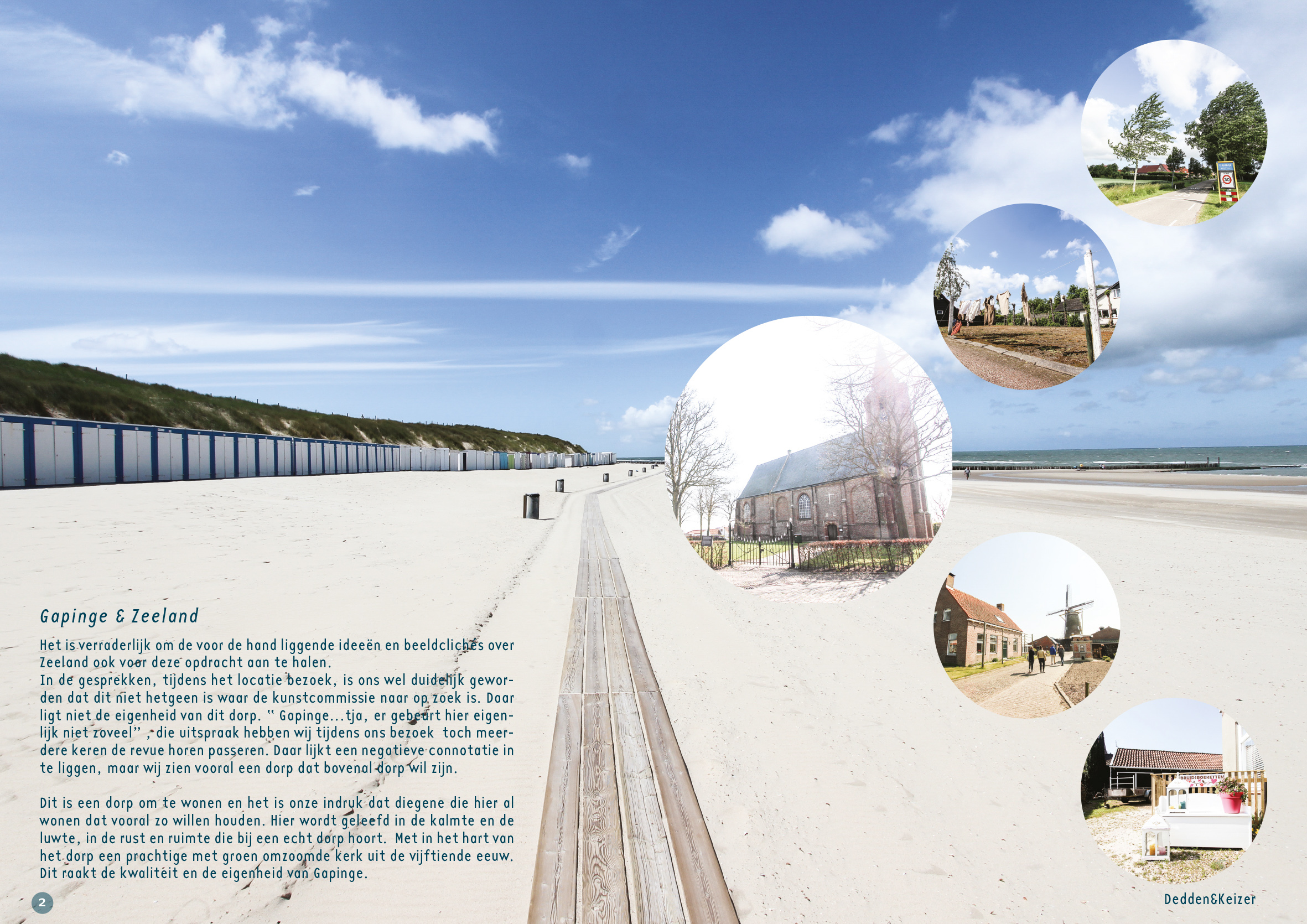 Het is verraderlijk om de voor de hand liggende ideeën en beeldclichés over Zeeland ook voor deze opdracht aan te halen. In de gesprekken, tijdens het locatie bezoek, is ons wel duidelijk geworden dat dit niet hetgeen is waar de kunstcommissie naar op zoek is. Daar ligt niet de eigenheid van dit dorp. “ Gapinge…tja, er gebeurt hier eigenlijk niet zoveel” , die uitspraak hebben wij tijdens ons bezoek meerdere keren de revue horen passeren. Daar lijkt een negatieve connotatie in te liggen, maar wij zien vooral een dorp dat bovenal dorp wil zijn. Dit is een dorp om te wonen en het is onze indruk dat diegene die hier al wonen dat vooral zo willen houden. Hier wordt geleefd in de kalmte en de luwte, in de rust en ruimte die bij een echt dorp hoort.  Met in het hart van het dorp een prachtige met groen omzoomde kerk uit de vijftiende eeuw. Dit raakt de kwaliteit en de eigenheid van Gapinge.