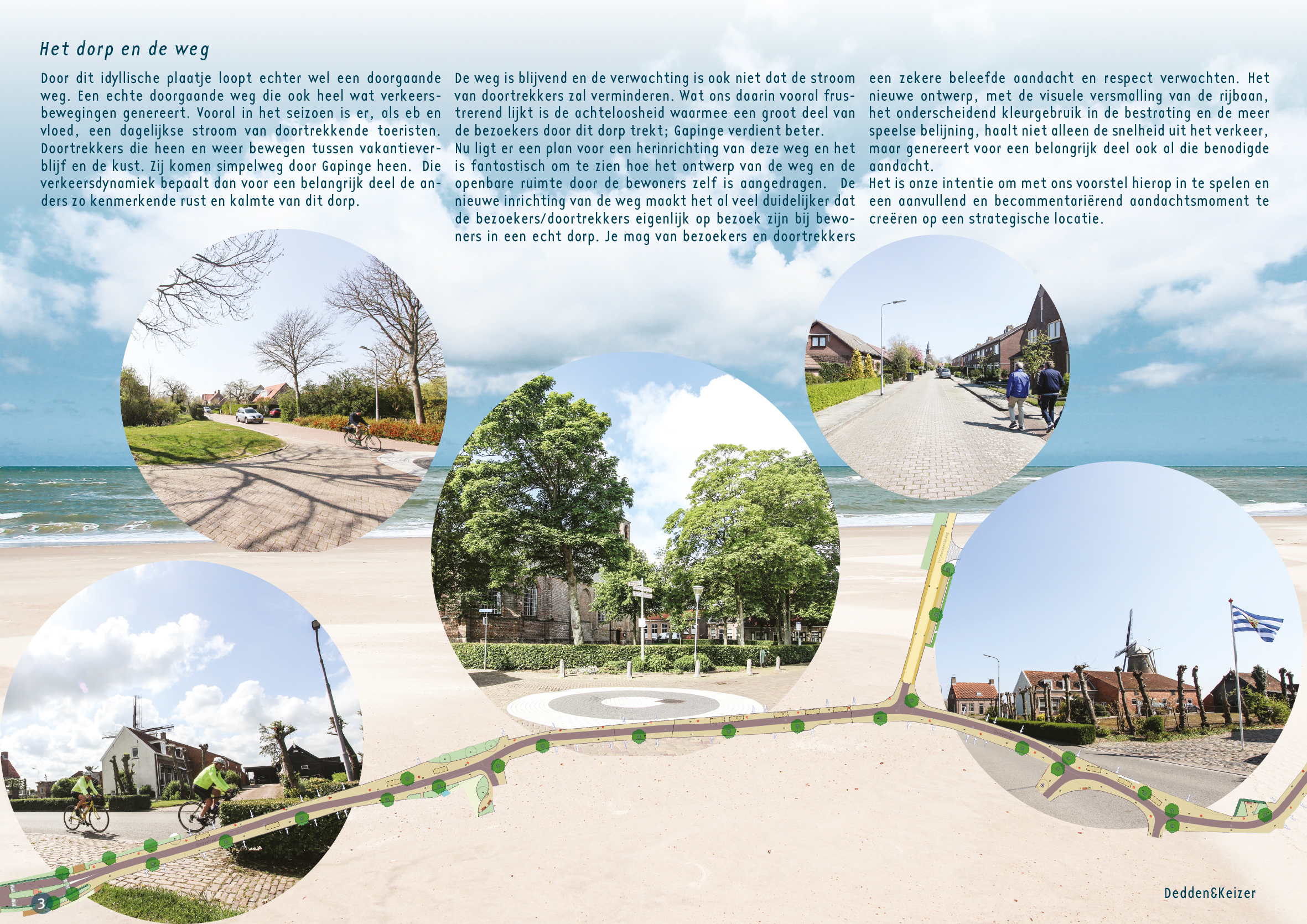 De weg is blijvend en het is ook niet de verwachting dat de stroom van doortrekkers zal verminderen. Wat ons daarin vooral frustrerend lijkt is de achteloosheid waarmee een groot deel van de bezoekers door dit dorp trekt; Gapinge verdient beter. Nu ligt er een plan voor een herinrichting van deze weg en het is fantastisch om te zien hoe het ontwerp van de weg en de openbare ruimte door de bewoners zelf is aangedragen.  De nieuwe inrichting van de weg maakt het al veel duidelijker dat de bezoekers/doortrekkers eigenlijk op bezoek zijn bij bewoners in een echt dorp. Je mag van bezoekers en doortrekkers een zekere beleefde aandacht en respect verwachten. Het nieuwe ontwerp, met de visuele versmalling van de rijbaan, het onderscheidend kleurgebruik in de bestrating en de meer speelse belijning, haalt niet alleen de snelheid uit het verkeer, maar genereert voor een belangrijk deel ook al die benodigde aandacht. Het is onze intentie om met ons voorstel hierop in te spelen en een aanvullend en becommentariërend aandachtsmoment te creëren op een strategische locatie.