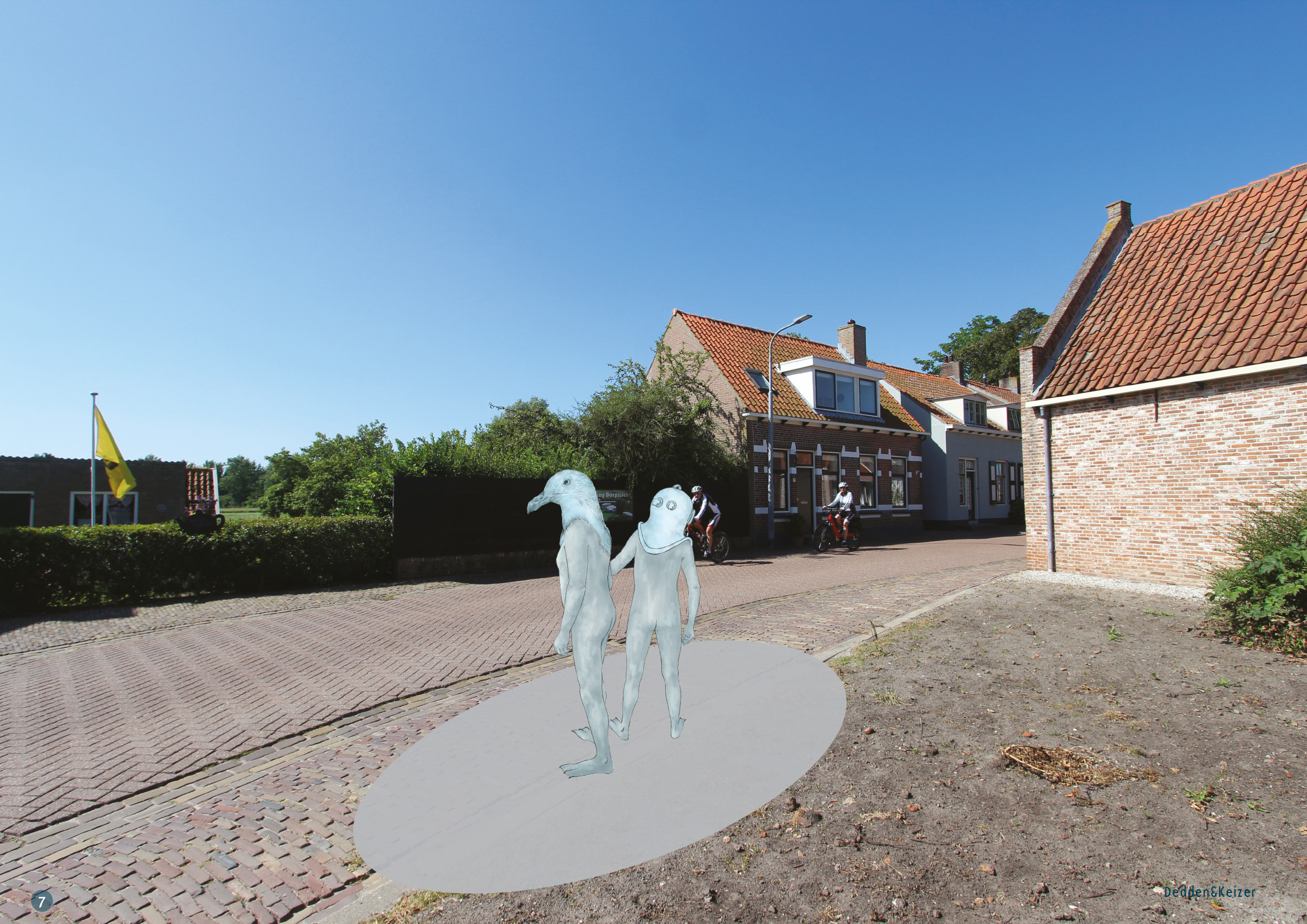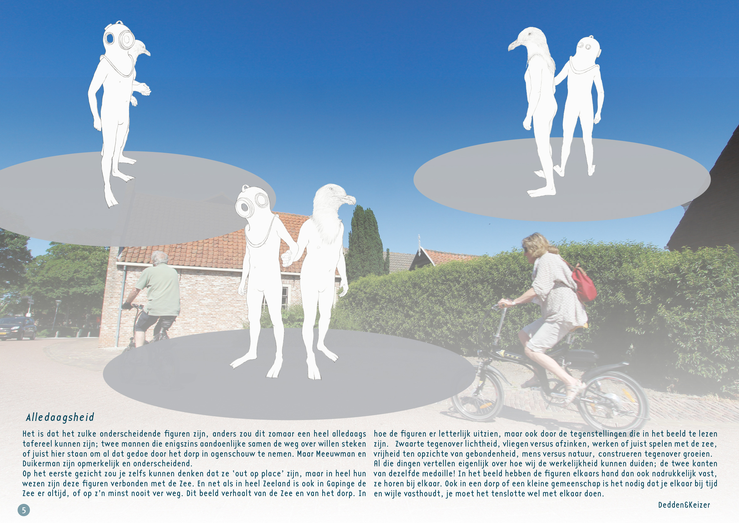 In het beeld is het overgrote deel van het lichaam van deze figuren naturel en die lijven zien er uit zoals je dat kunt verwachten bij al wat oudere mannen. Het is bij de hoofden dat deze figuren opmerkelijk anders zijn. Bij de ene man gaat zijn hoofd schuil onder een authentieke duikershelm, met de zo karakteristieke kijkvensters. Het lijkt er op dat de zwaarte van de duikhelm deze man een beetje parten speelt. Bij de andere figuur is het hoofd volledig getransformeerd tot een meeuwenkop. De  ‘Duikerman’ is door zijn helm, met het beperkte zicht, een beetje onthand en als het ware wat in zichzelf gekeerd. De ‘Meeuwman’ daarentegen kijkt, zoals meeuwen nou eenmaal doen, alert, nieuwsgierig en enigszins brutaal de bocht om. Als twee kameraden staan ze daar hand in hand naast de weg en kijken zo goed en zo kwaad als ze kunnen naar en links en naar rechts. Ze staan erbij en kijken ernaar. De stroom van verkeer is voor hen een schouwspel geworden, waarbij ze de bezoekers zowel tegemoet als wegkijken. En hoewel de focus van de mannen bij het gebeuren op de weg ligt, is het ‘elkaar bij de hand nemen’ als gebaar prominent in het beeld aanwezig. De verkleinende maatvoering van de mannen en juist dit expliciete gebaar, geeft het beeld een zekere kwetsbaarheid. Dat zegt iets over het dorp; in een kleine gemeenschap sta je allemaal dicht bij elkaar en is het vanzelfsprekend en noodzaak dat je elkaar bij tijd en wijle bij de hand neemt.