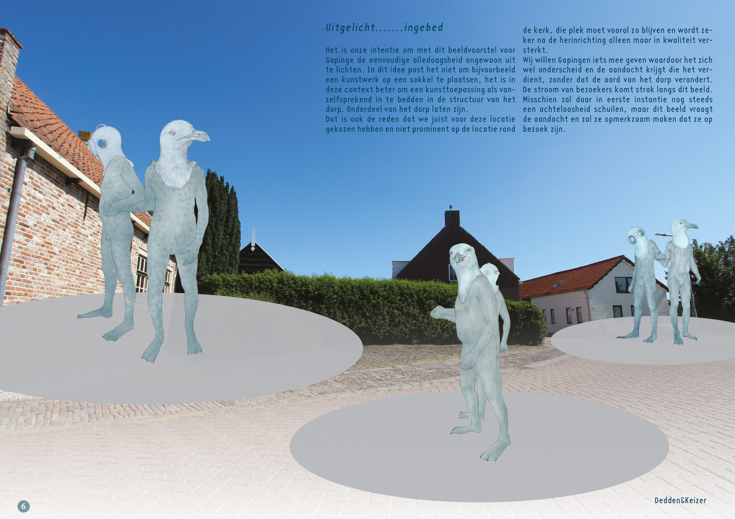 Het is onze intentie om met dit beeldvoorstel voor Gapinge de eenvoudige alledaagsheid ongewoon uit te lichten. In dit idee past het niet om bijvoorbeeld een kunstwerk prominent op een sokkel te plaatsen, daarmee onthecht je een beeld als het ware van zijn omgeving. Het is in deze context beter om een kunsttoepassing als vanzelfsprekend in te bedden in de structuur van het dorp. Onderdeel van het dorp laten zijn. Dat is ook de reden dat we juist voor deze locatie gekozen hebben en niet prominent op de locatie rond de kerk, die plek moet vooral zo blijven en wordt zeker na de herinrichting alleen maar in kwaliteit versterkt.