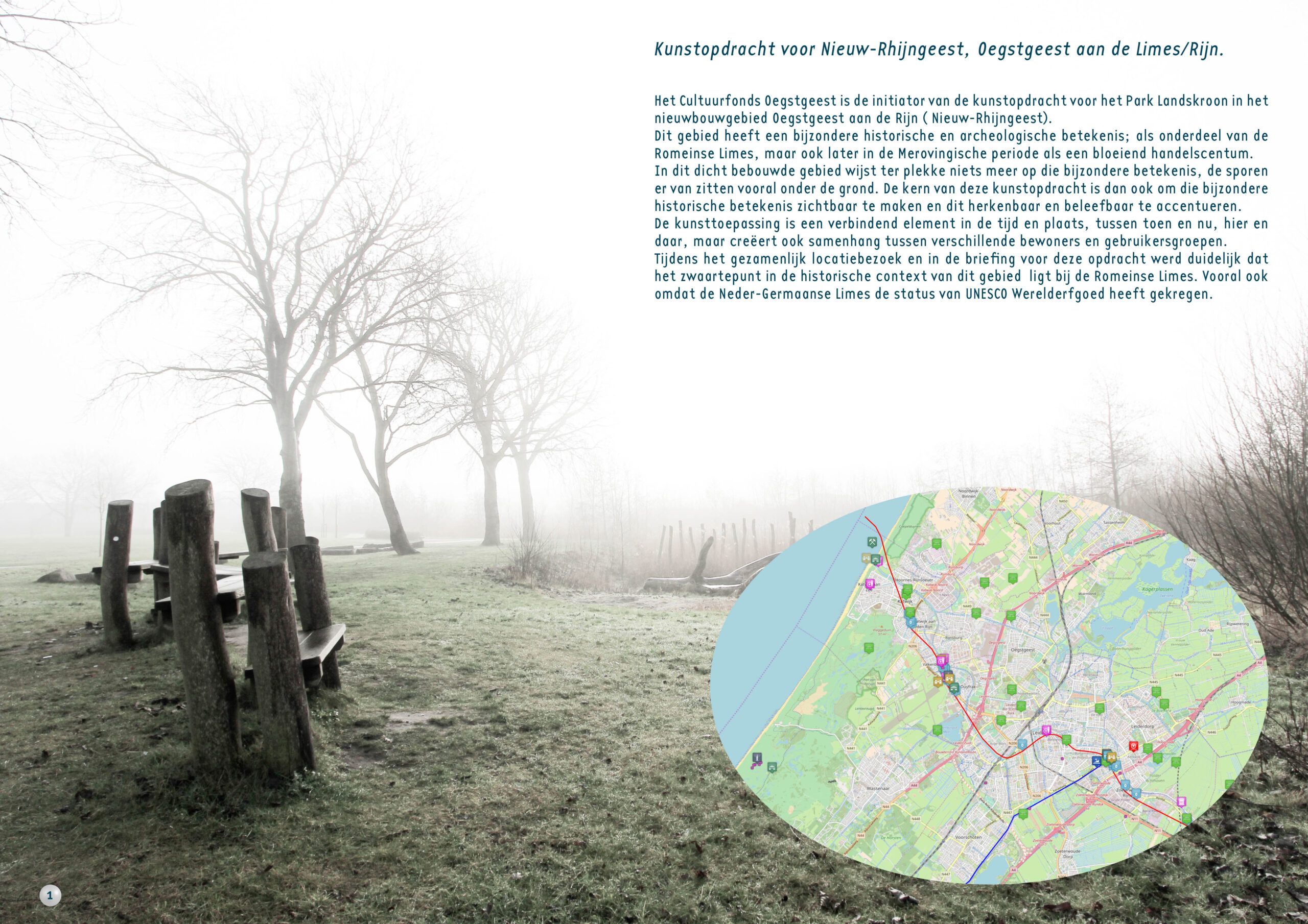 Het Cultuurfonds Oegstgeest is de initiator van de kunstopdracht voor het Park Landskroon in het nieuwbouwgebied Oegstgeest aan de Rijn ( Nieuw-Rhijngeest). Dit gebied heeft een bijzondere historische en archeologische betekenis; als onderdeel van de Romeinse Limes, maar ook later in de Merovingische periode als een bloeiend handelscentum. In dit dicht bebouwde gebied wijst ter plekke niets meer op die bijzondere betekenis, de sporen er van zitten vooral onder de grond. De kern van deze kunstopdracht is dan ook om die bijzondere historische betekenis zichtbaar te maken en dit herkenbaar en beleefbaar te accentueren. De kunsttoepassing is een verbindend element in de tijd en plaats, tussen toen en nu, hier en daar, maar creëert ook samenhang tussen verschillende bewoners en gebruikersgroepen. Tijdens het gezamenlijk locatiebezoek en in de briefing voor deze opdracht werd duidelijk dat het zwaartepunt in de historische context van dit gebied ligt bij de Romeinse Limes. Vooral ook omdat de Neder-Germaanse Limes de status van UNESCO Werelderfgoed heeft gekregen.