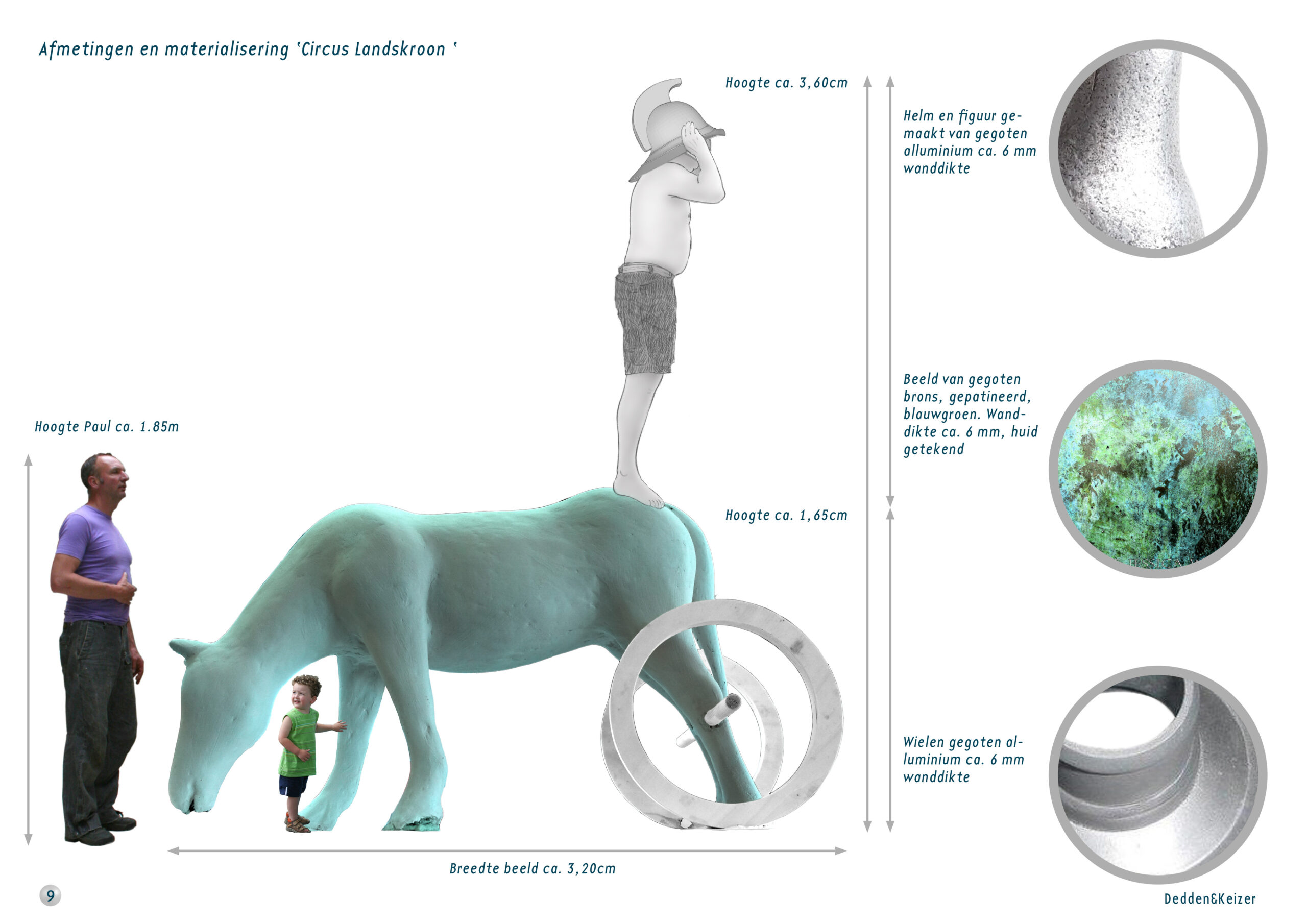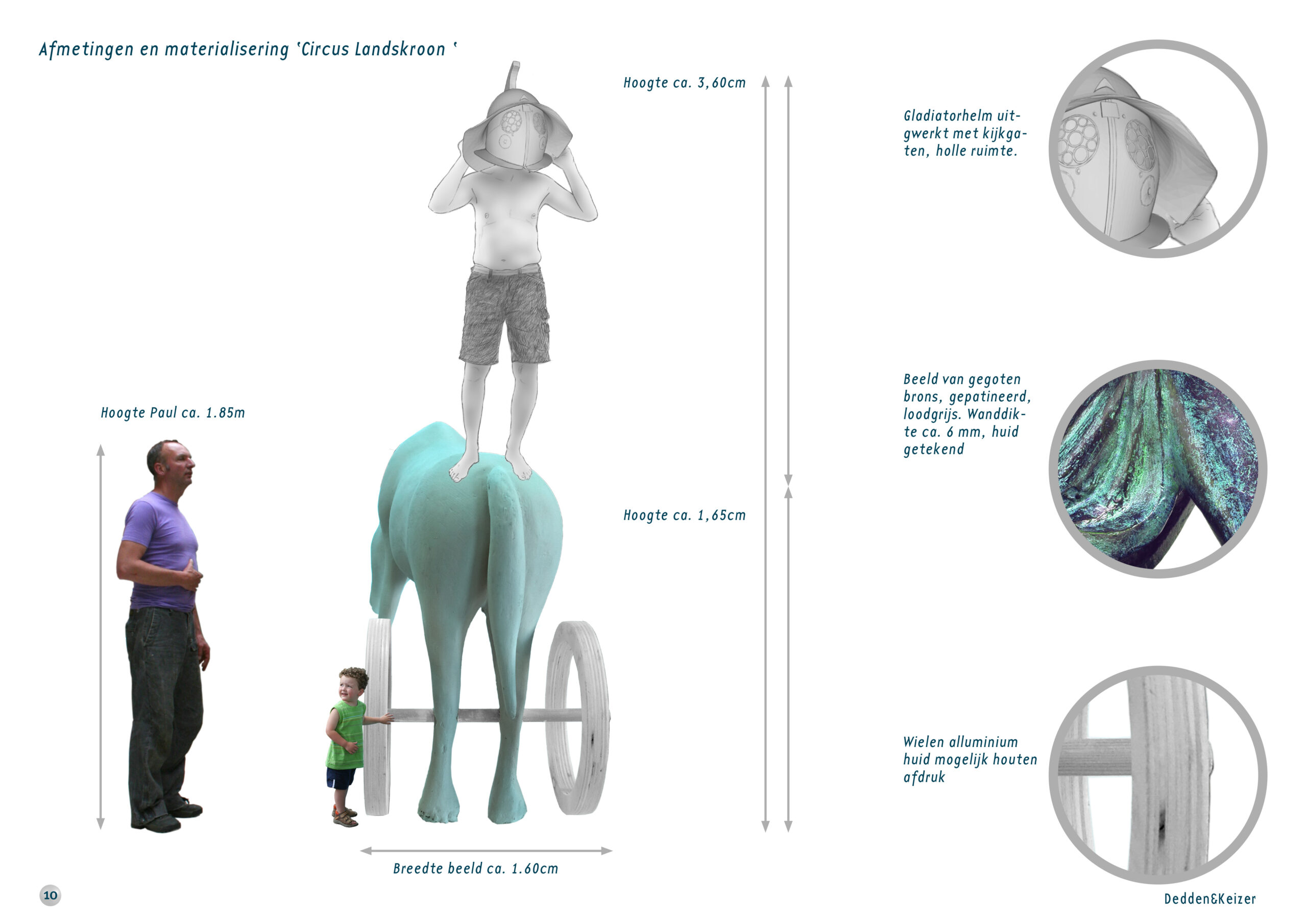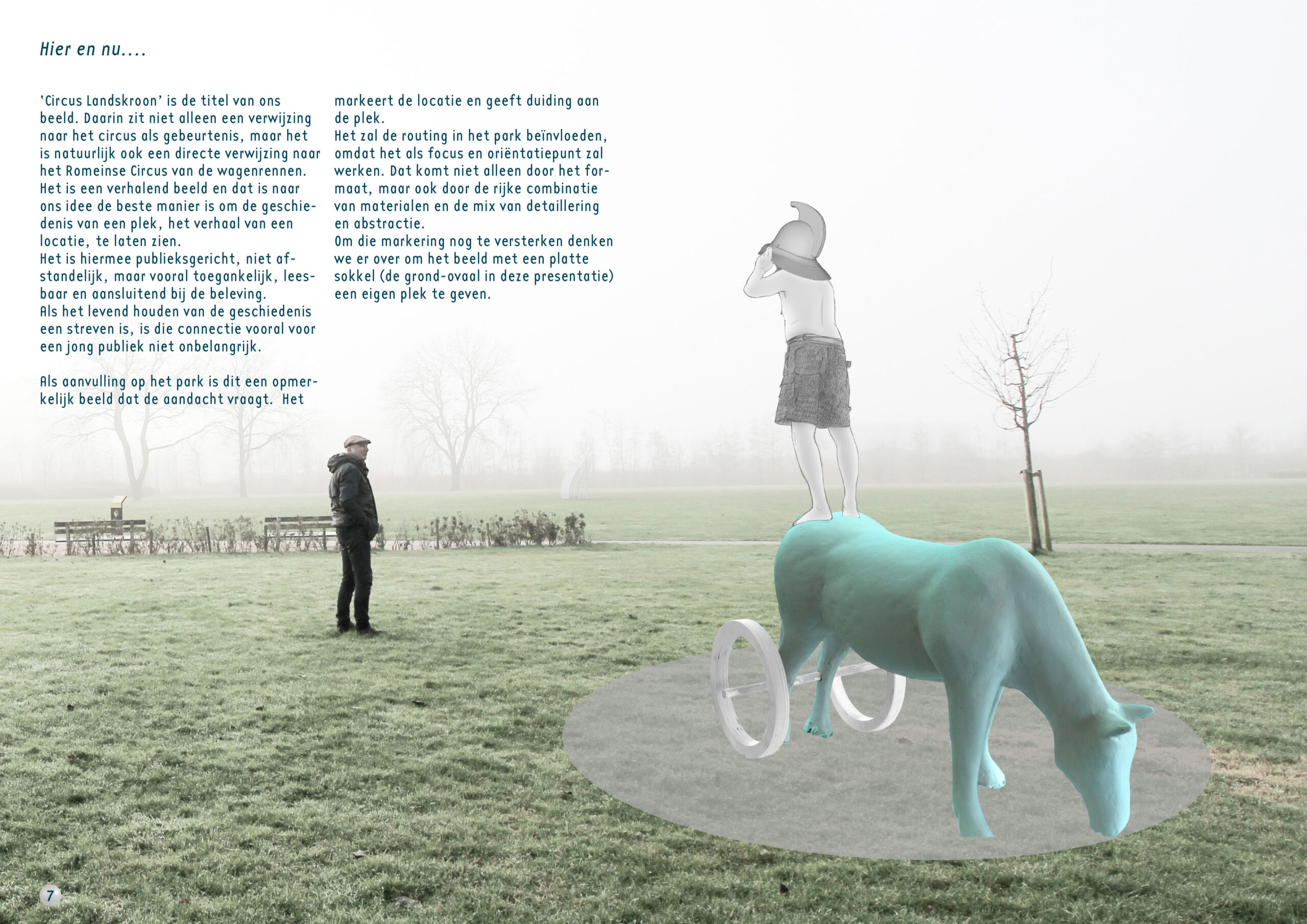 ‘Circus Landskroon’ is de titel van ons beeld. Daarin zit niet alleen een verwijzing naar het circus als gebeurtenis, maar het is natuurlijk ook een directe verwijzing naar het Romeinse Circus van de wagenrennen. Het is een verhalend beeld en dat is naar ons idee de beste manier is om de geschiedenis van een plek, het verhaal van een locatie, te laten zien. Het is hiermee publieksgericht, niet afstandelijk, maar vooral toegankelijk, leesbaar en aansluitend bij de beleving. Als het levend houden van de geschiedenis een streven is, is die connectie vooral voor een jong publiek niet onbelangrijk. Als aanvulling op het park is dit een opmerkelijk beeld dat de aandacht vraagt. Het markeert de locatie en geeft duiding aan de plek. Het zal de routing in het park beïnvloeden, omdat het als focus en oriëntatiepunt zal werken. Dat komt niet alleen door het formaat, maar ook door de rijke combinatie van materialen en de mix van detaillering en abstractie. Om die markering nog te versterken denken we er over om het beeld met een platte sokkel (de grond-ovaal in deze presentatie) een eigen plek te geven.
