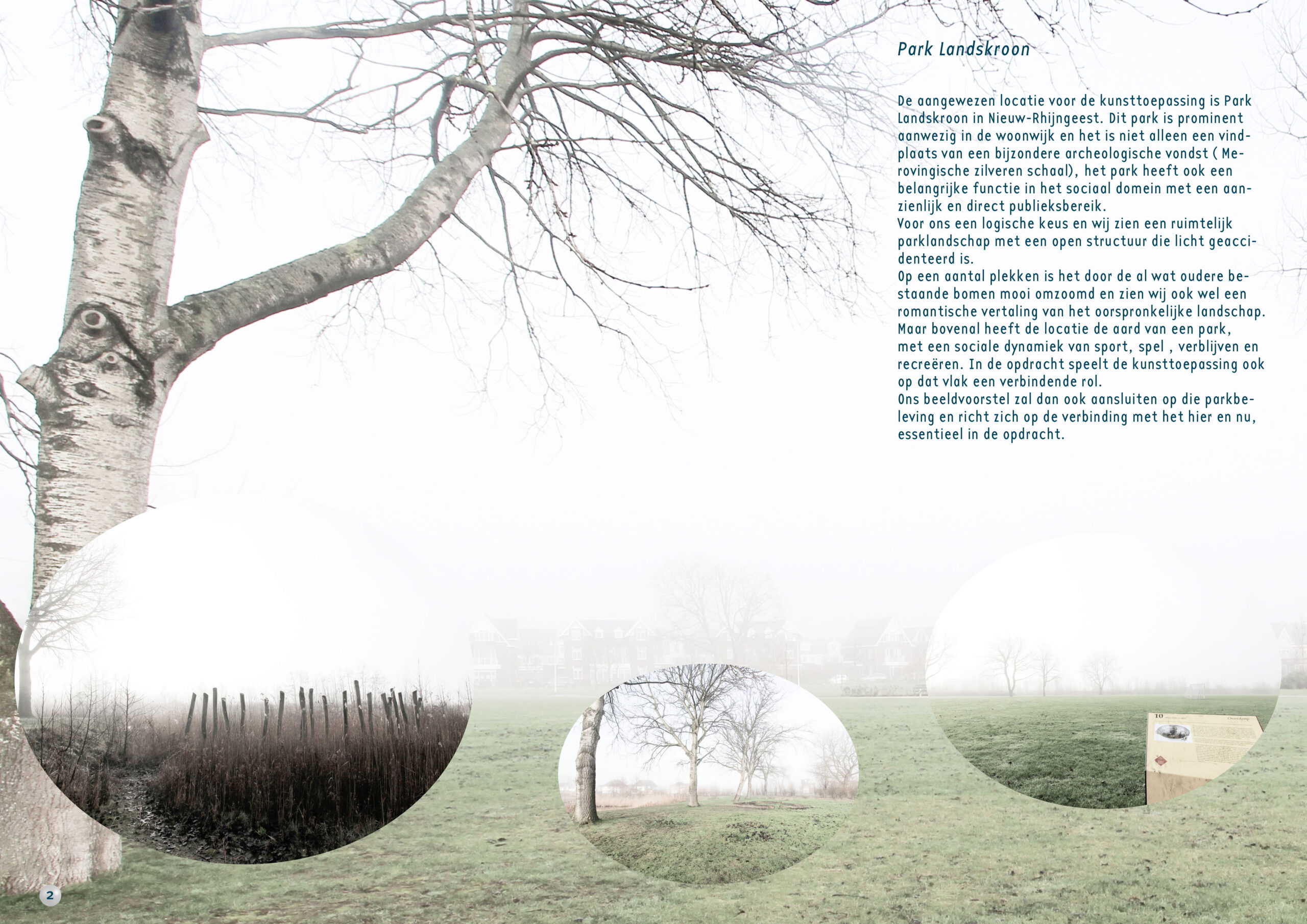 De aangewezen locatie voor de kunsttoepassing is Park Landskroon in Nieuw-Rhijngeest. Dit park is prominent aanwezig in de woonwijk en het is niet alleen een vindplaats van een bijzondere archeologische vondst ( Merovingische zilveren schaal), het park heeft ook een belangrijke functie in het sociaal domein met een aanzienlijk en direct publieksbereik. Voor ons een logische keus en wij zien een ruimtelijk parklandschap met een open structuur die licht geaccidenteerd is. Op een aantal plekken is het door de al wat oudere bestaande bomen mooi omzoomd en zien wij ook wel een romantische vertaling van het oorspronkelijke landschap. Maar bovenal heeft de locatie de aard van een park, met een sociale dynamiek van sport, spel , verblijven en recreëren. In de opdracht speelt de kunsttoepassing ook op dat vlak een verbindende rol. Ons beeldvoorstel zal dan ook aansluiten op die parkbeleving en richt zich op de verbinding met het hier en nu, essentieel in de opdracht.