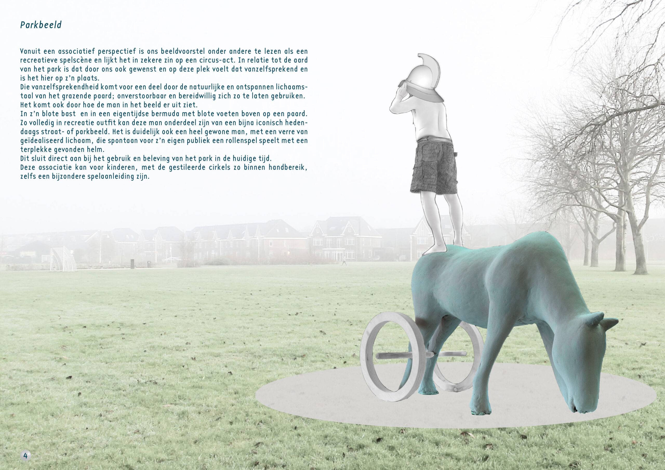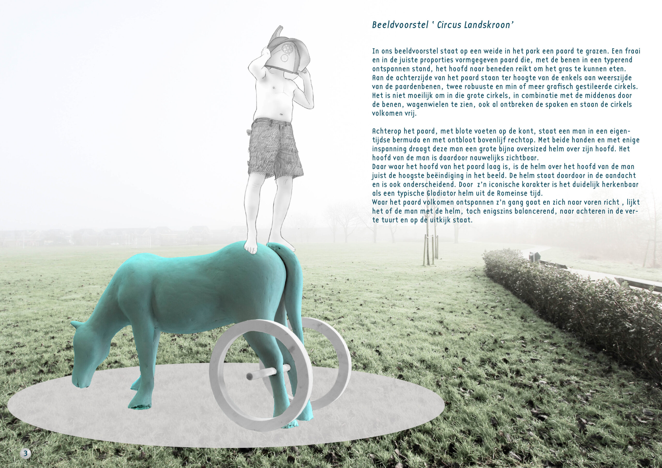 In ons beeldvoorstel staat op een weide in het park een paard te grazen. Een fraai en in de juiste proporties vormgegeven paard die, met de benen in een typerend ontspannen stand, het hoofd naar beneden reikt om het gras te kunnen eten. Aan de achterzijde van het paard staan ter hoogte van de enkels aan weerszijde van de paardenbenen, twee robuuste en min of meer grafisch gestileerde cirkels. Het is niet moeilijk om in die grote cirkels, in combinatie met de middenas door de benen, wagenwielen te zien, ook al ontbreken de spaken en staan de cirkels volkomen vrij. Achterop het paard, met blote voeten op de kont, staat een man in een eigentijdse bermuda en met ontbloot bovenlijf rechtop. Met beide handen en met enige inspanning draagt deze man een grote bijna oversized helm over zijn hoofd. Het hoofd van de man is daardoor nauwelijks zichtbaar. Daar waar het hoofd van het paard laag is, is de helm over het hoofd van de man juist de hoogste beëindiging in het beeld. De helm staat daardoor in de aandacht en is ook onderscheidend. Door z’n iconische karakter is het duidelijk herkenbaar als een typische Gladiator helm uit de Romeinse tijd. Waar het paard volkomen ontspannen z’n gang gaat en zich naar voren richt , lijkt het of de man met de helm, toch enigszins balancerend, naar achteren in de verte tuurt en op de uitkijk staat.