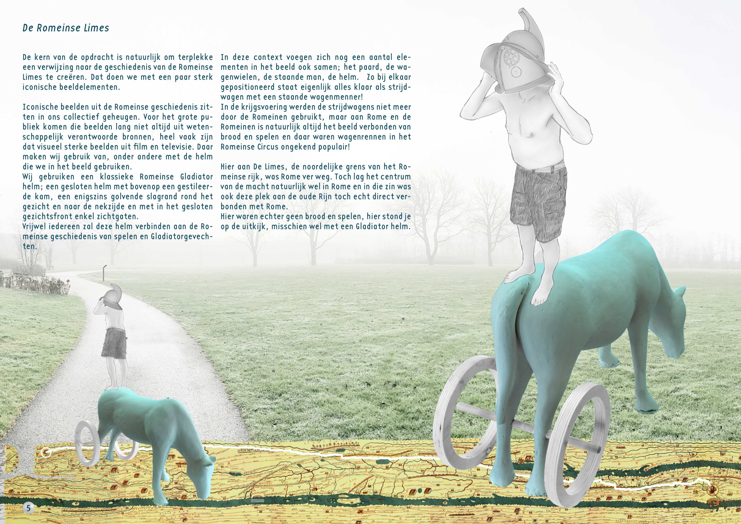 De kern van de opdracht is natuurlijk om terplekke een verwijzing naar de geschiedenis van de Romeinse Limes te creëren. Dat doen we met een paar sterk iconische beeldelementen. Iconische beelden uit de Romeinse geschiedenis zitten in ons collectief geheugen. Voor het grote publiek komen die beelden lang niet altijd uit wetenschappelijk verantwoorde bronnen, heel vaak zijn dat visueel sterke beelden uit film en televisie. Daar maken wij gebruik van, onder andere met de helm die we in het beeld gebruiken. Wij gebruiken een klassieke Romeinse Gladiator helm; een gesloten helm met bovenop een gestileerde kam, een enigszins golvende slagrand rond het gezicht en naar de nekzijde en met in het gesloten gezichtsfront enkel zichtgaten.Vrijwel iedereen zal deze helm verbinden aan de Romeinse geschiedenis van spelen en Gladiatorgevechten. In deze context voegen zich nog een aantal elementen in het beeld ook samen; het paard, de wagenwielen, de staande man, de helm. Zo bij elkaar gepositioneerd staat eigenlijk alles klaar als strijdwagen met een staande wagenmenner! In de krijgsvoering werden de strijdwagens niet meer door de Romeinen gebruikt, maar aan Rome en de Romeinen is natuurlijk altijd het beeld verbonden van brood en spelen en daar waren wagenrennen in het Romeinse Circus ongekend populair! Hier aan De Limes, de noordelijke grens van het Romeinse rijk, was Rome ver weg. Toch lag het centrum van de macht natuurlijk wel in Rome en in die zin was ook deze plek aan de oude Rijn toch echt direct verbonden met Rome. Hier waren echter geen brood en spelen, hier stond je op de uitkijk, misschien wel met een Gladiator helm.