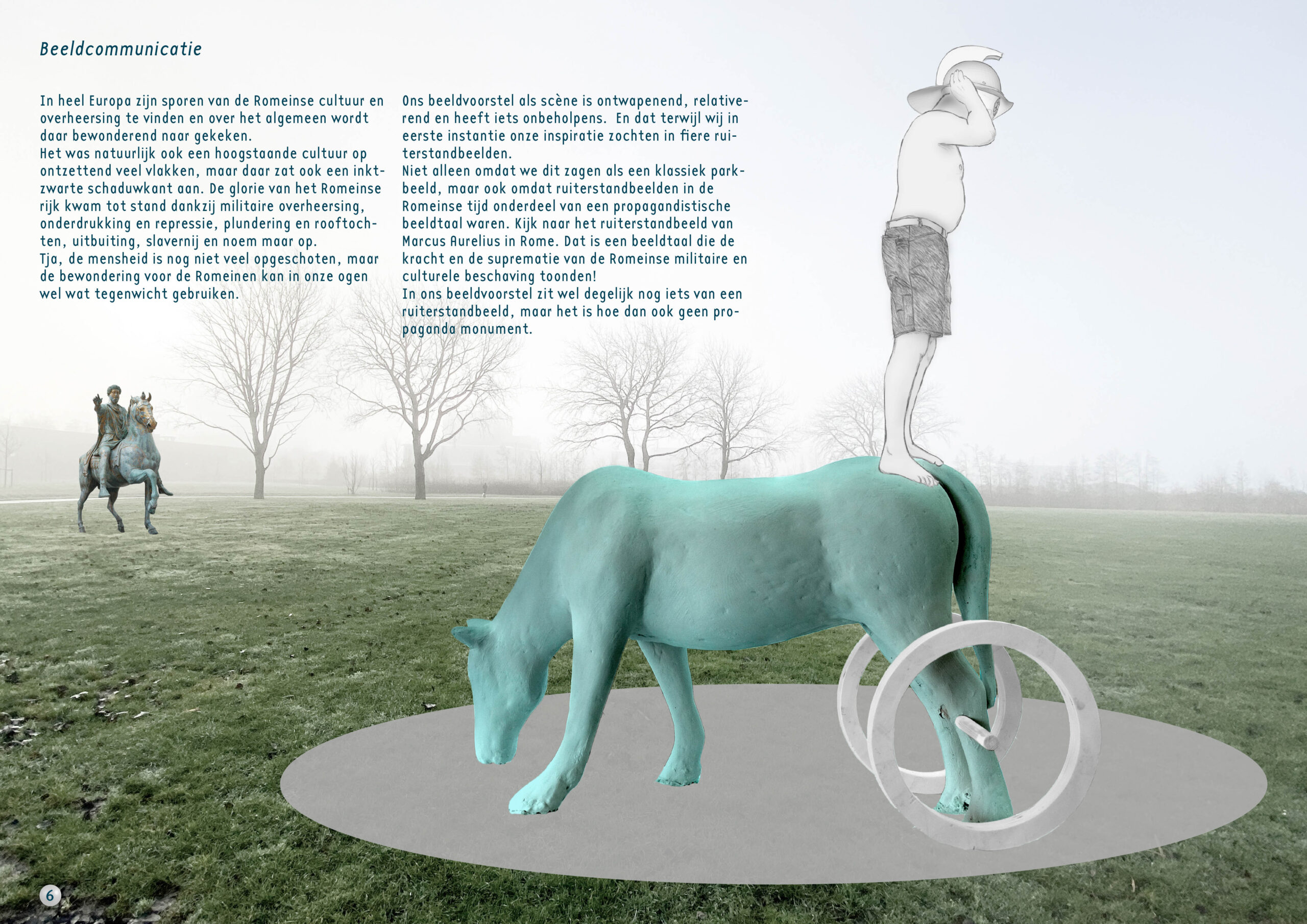 In heel Europa zijn sporen van de Romeinse cultuur en overheersing te vinden en over het algemeen wordt daar bewonderend naar gekeken. Het was natuurlijk ook een hoogstaande cultuur op ontzettend veel vlakken, maar daar zat ook een inktzwarte schaduwkant aan. De glorie van het Romeinse rijk kwam tot stand dankzij militaire overheersing, onderdrukking en repressie, plundering en rooftochten, uitbuiting, slavernij en noem maar op. Tja, de mensheid is nog niet veel opgeschoten, maar de bewondering voor de Romeinen kan in onze ogen wel wat tegenwicht gebruiken. Ons beeldvoorstel als scène is ontwapenend, relativerend en heeft iets onbeholpens. En dat terwijl wij in eerste instantie onze inspiratie zochten in fiere ruiterstandbeelden. Niet alleen omdat we dit zagen als een klassiek parkbeeld, maar ook omdat ruiterstandbeelden in de Romeinse tijd onderdeel van een propagandistische beeldtaal waren. Kijk naar het ruiterstandbeeld van Marcus Aurelius in Rome. Dat is een beeldtaal die de kracht en de suprematie van de Romeinse militaire en culturele beschaving toonden! In ons beeldvoorstel zit wel degelijk nog iets van een ruiterstandbeeld, maar het is hoe dan ook geen propaganda monument.