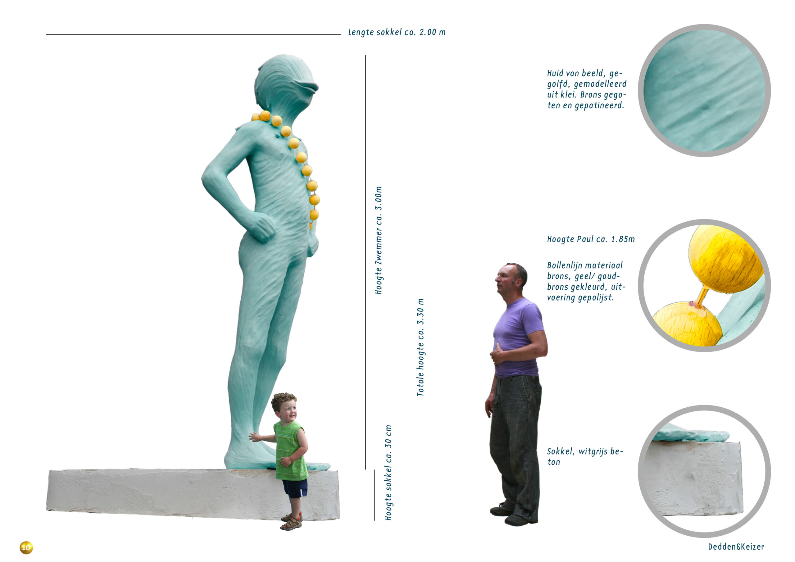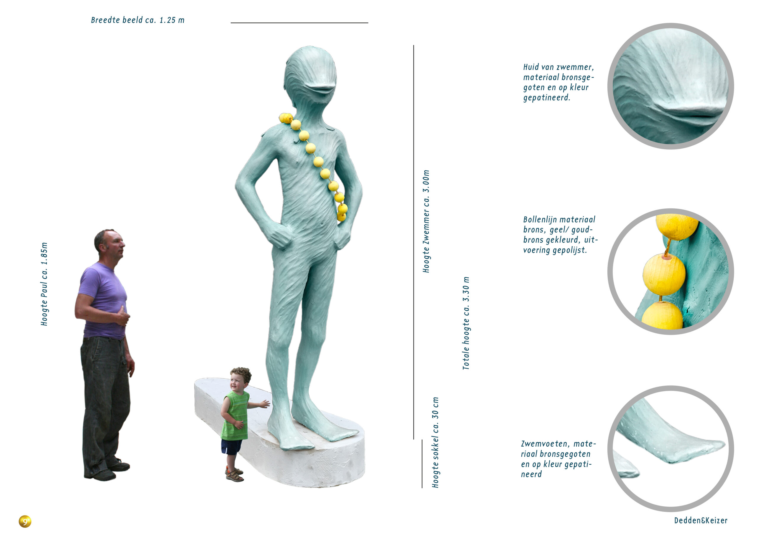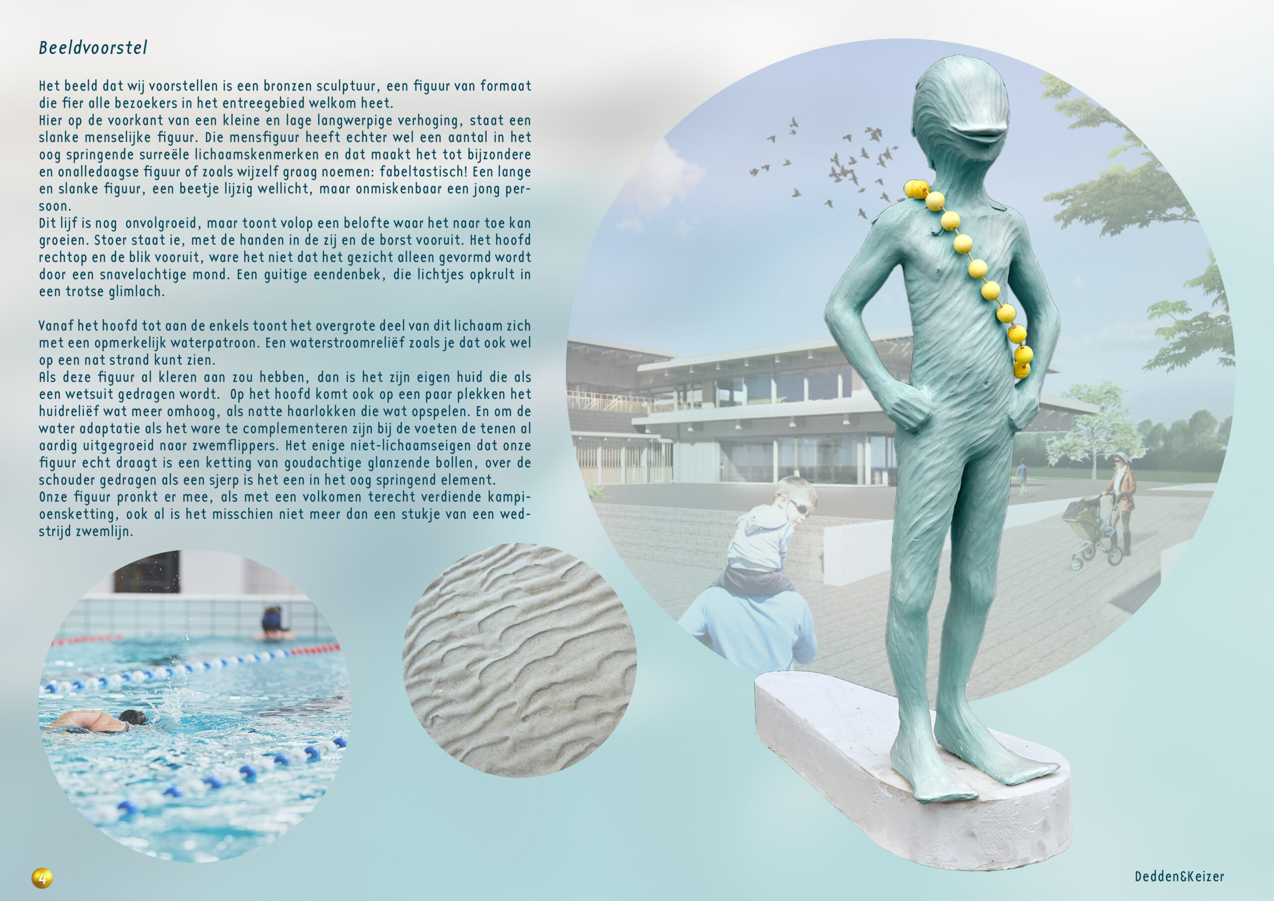 Het beeld dat wij voorstellen is een bronzen sculptuur, een figuur van formaat die fier alle bezoekers in het entreegebied welkom heet. Hier op de voorkant van een kleine en lage langwerpige verhoging, staat een slanke menselijke figuur. Die mensfiguur heeft echter wel een aantal in het oog springende surreële lichaamskenmerken en dat maakt het tot bijzondere en onalledaagse figuur of zoals wijzelf graag noemen: fabeltastisch! Een lange en slanke figuur, een beetje lijzig wellicht, maar onmiskenbaar een jong persoon. Dit lijf is nog onvolgroeid, maar toont volop een belofte waar het naar toe kan groeien. Stoer staat ie, met de handen in de zij en de borst vooruit. Het hoofd rechtop en de blik vooruit, ware het niet dat het gezicht alleen gevormd wordt door een snavelachtige mond. Een guitige eendenbek, die lichtjes opkrult in een trotse glimlach. Vanaf het hoofd tot aan de enkels toont het overgrote deel van dit lichaam zich met een opmerkelijk waterpatroon. Een waterstroomreliëf zoals je dat ook wel op een nat strand kunt zien. Als deze figuur al kleren aan zou hebben, dan is het zijn eigen huid die als een wetsuit gedragen wordt. Op het hoofd komt ook op een paar plekken het huidreliëf wat meer omhoog, als natte haarlokken die wat opspelen. En om de water adaptatie als het ware te complementeren zijn bij de voeten de tenen al aardig uitgegroeid naar zwemflippers. Het enige niet-lichaamseigen dat onze figuur echt draagt is een ketting van goudachtige glanzende bollen, over de schouder gedragen als een sjerp is het een in het oog springend element. Onze figuur pronkt er mee, als met een volkomen terecht verdiende kampioensketting, ook al is het misschien niet meer dan een stukje van een wedstrijd zwemlijn.