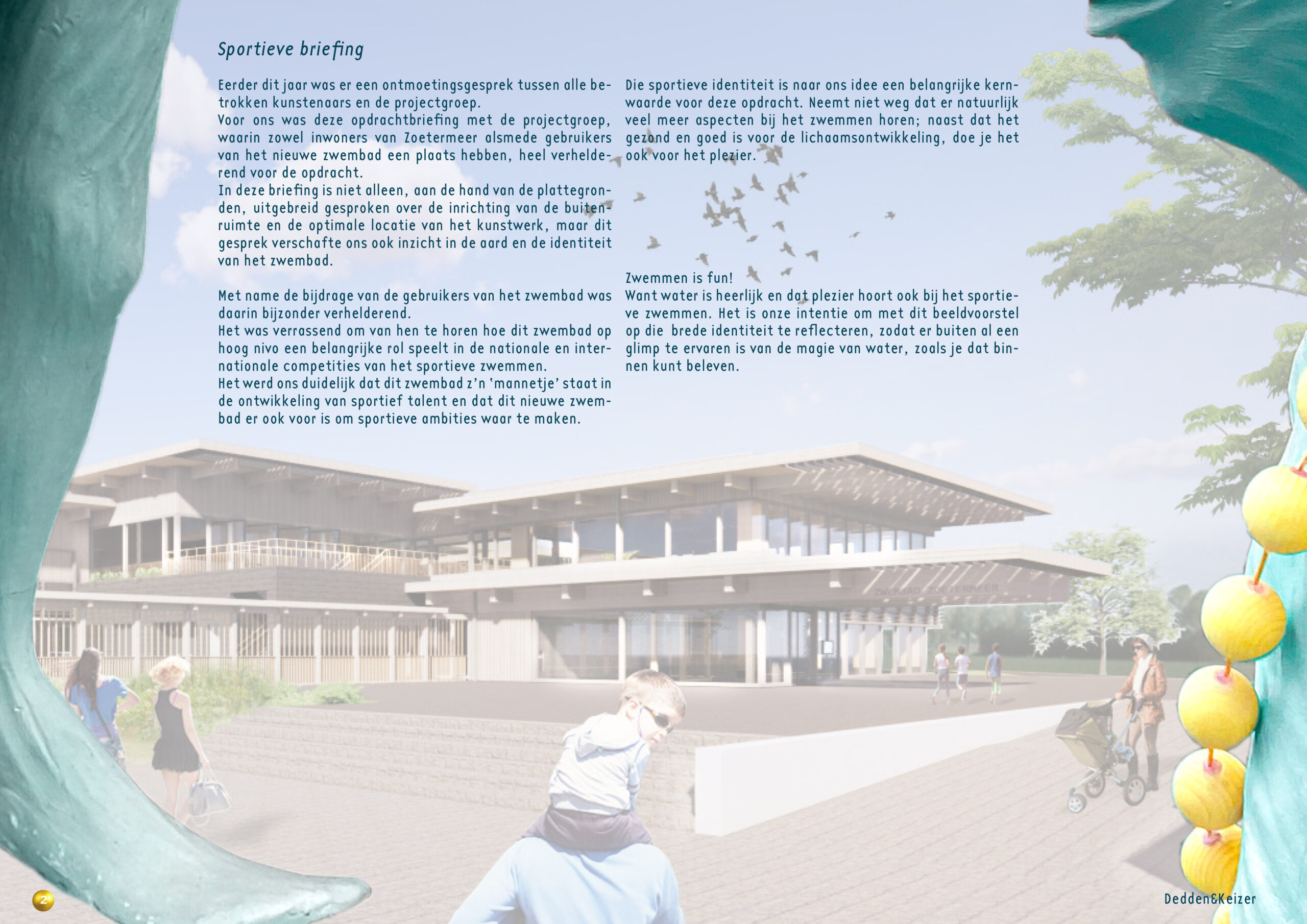 Eerder dit jaar was er een ontmoetingsgesprek tussen alle betrokken kunstenaars en de projectgroep. Voor ons was deze opdrachtbriefing met de projectgroep, waarin zowel inwoners van Zoetermeer alsmede gebruikers van het nieuwe zwembad een plaats hebben, heel verhelderend voor de opdracht. In deze briefing is niet alleen, aan de hand van de plattegronden, uitgebreid gesproken over de inrichting van de buitenruimte en de optimale locatie van het kunstwerk, maar dit gesprek verschafte ons ook inzicht in de aard en de identiteit van het zwembad. Met name de bijdrage van de gebruikers van het zwembad was daarin bijzonder verhelderend. Het was verrassend om van hen te horen hoe dit zwembad op hoog nivo een belangrijke rol speelt in de nationale en internationale competities van het sportieve zwemmen. Het werd ons duidelijk dat dit zwembad z’n ‘mannetje’ staat in de ontwikkeling van sportief talent en dat dit nieuwe zwembad er ook voor is om sportieve ambities waar te maken. Die sportieve identiteit is naar ons idee een belangrijke kernwaarde voor deze opdracht. Neemt niet weg dat er natuurlijk veel meer aspecten bij het zwemmen horen; naast dat het gezond en goed is voor de lichaamsontwikkeling, doe je het ook voor het plezier.