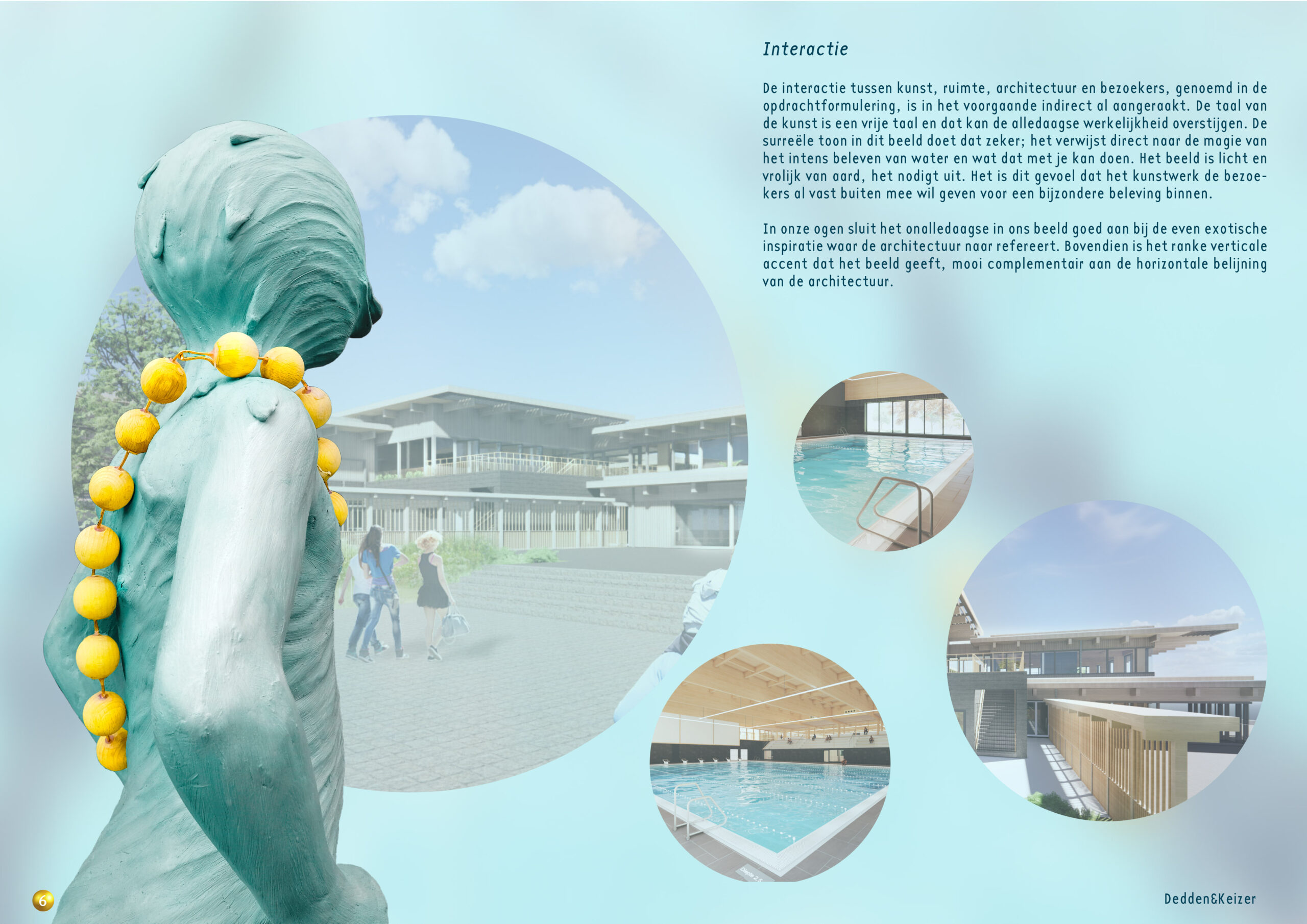 Zoals gezegd neemt dit zwembad, zeker op het sportieve vlak, een bijzondere positie in. De uitzonderlijkheid op dat vlak speelt zich vooral binnen af, maar ook het gebouw zelf is zeker voor een zwembad opmerkelijk te noemen. Dat de inspiratie voor de architectuur gevonden is bij Japanse badhuizen, dat zie je vooral terug in de horizontale belijning, de paviljoenachtige opbouw en de overstekken. Dat geeft het gebouw een zekere exotische uitstraling. Deze beide aspecten maken dit zwembad onderscheidend en onalledaags. Ons beeldvoorstel kan daar niet op achterblijven en het is ons gelukkig eigen om met onze beelden een onalledaagse werkelijkheid aan te raken. Dat is ook wat wij met ons voorstel beogen, om met verbeelding en fantasie de magie van het water, de fun van zwemmen en de aandacht voor het sportieve aspect van zwemmen te weerspiegelen. Wij willen in het entreegebied één enkel focus en aandachtspunt creëren. Niet alleen passend binnen de opdrachtformulering, maar in onze ogen vraagt het entreegebied daar ook om. De locatie voor het kunstwerk waar over gesproken is, is in dat opzicht ook een strategisch en effectieve positie met voldoende attentiewaarde.