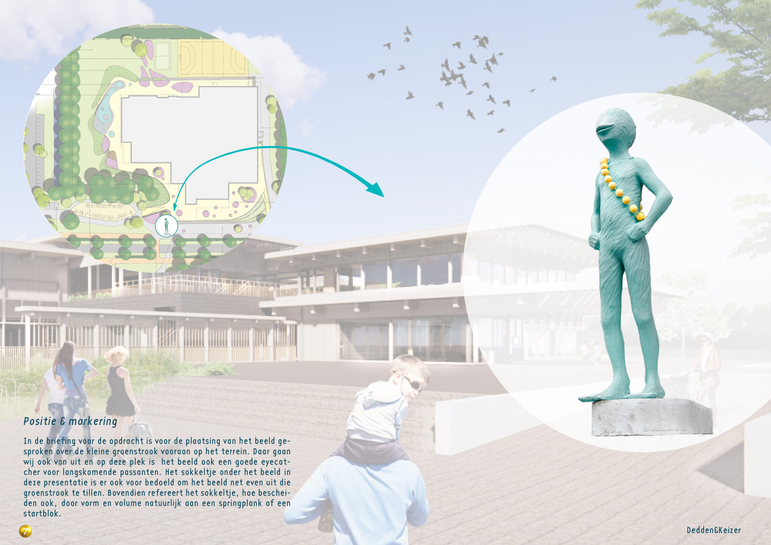 In de briefing voor de opdracht is voor de plaatsing van het beeld gesproken over de kleine groenstrook vooraan op het terrein. Daar gaan wij ook van uit en op deze plek is het beeld ook een goede eyecatcher voor langskomende passanten. Het sokkeltje onder het beeld in deze presentatie is er ook voor bedoeld om het beeld net even uit die groenstrook te tillen. Bovendien refereert het sokkeltje, hoe bescheiden ook, door vorm en volume natuurlijk aan een springplank of een startblok.