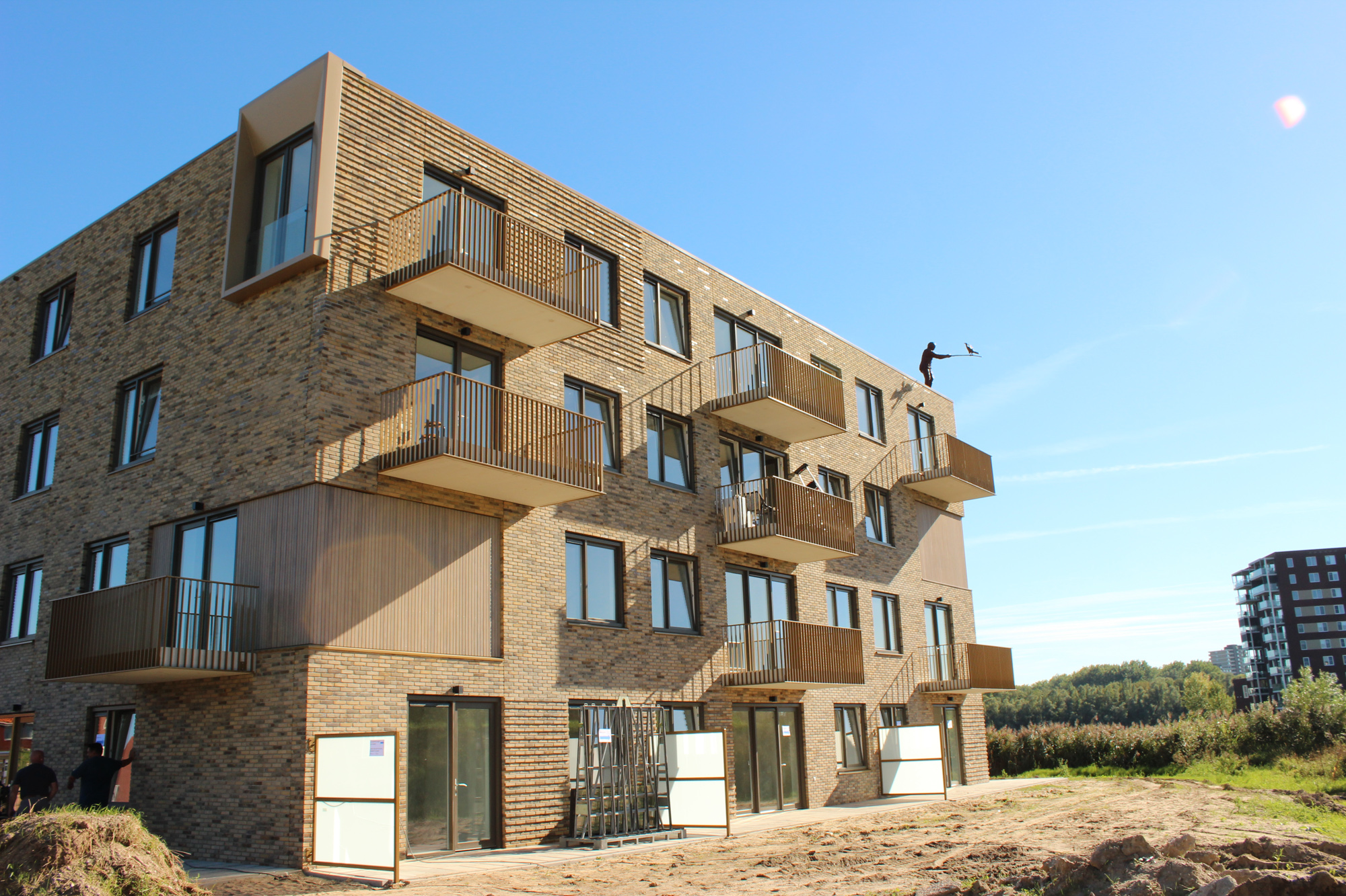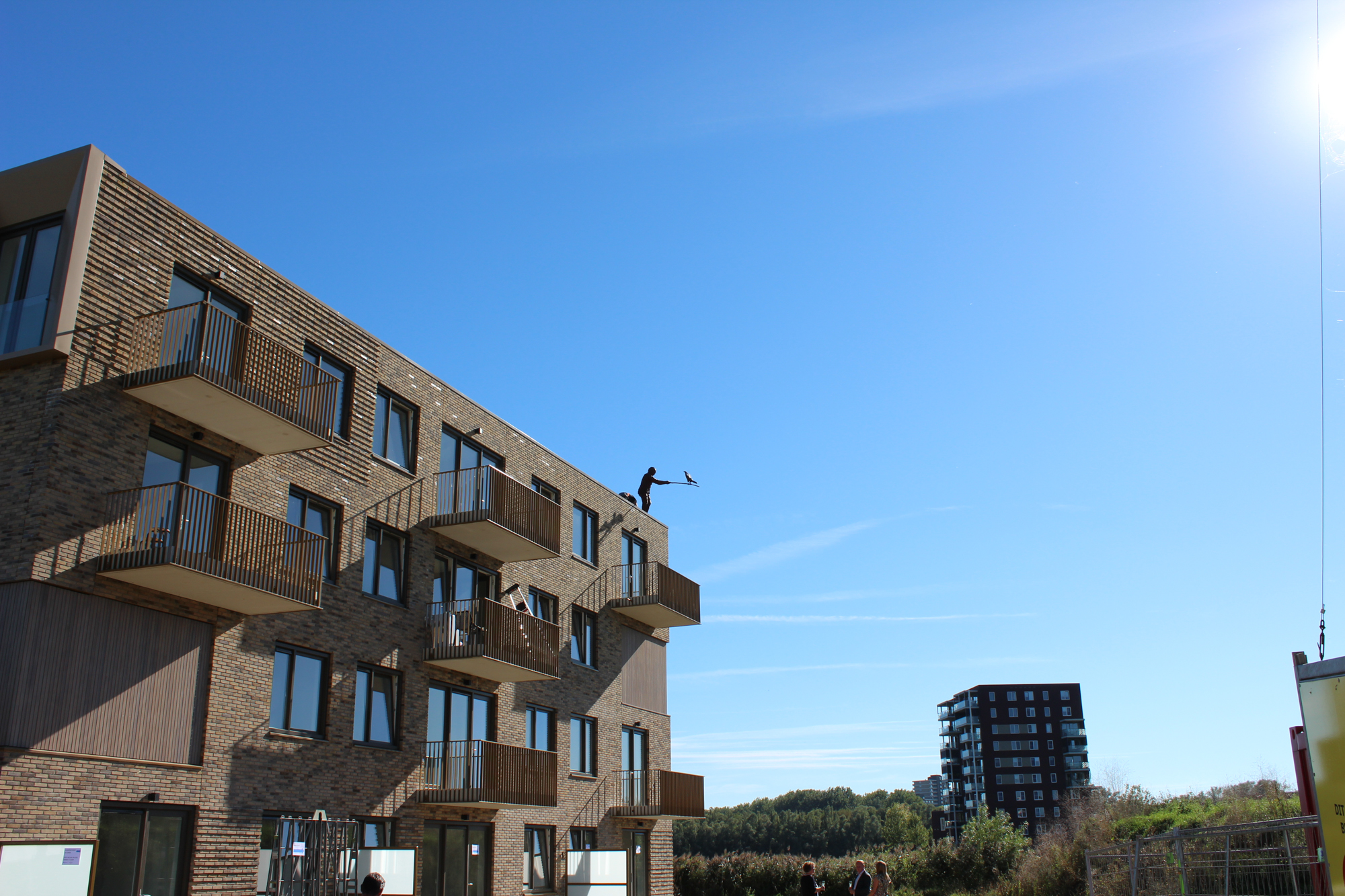 Dit brengt ons eigenlijk ook bij Malburgen zelf. Wij hadden in het voorgaande traject een kennismaking en een ontmoeting met een aantal betrokken bewoners uit de wijk. Wij dachten verhalen op te halen, maar kwamen met iets anders terug. Namelijk met de logica en het besef dat in deze wijk, die zo divers is en uit zoveel nationaliteiten is samengesteld, het ontzettend belangrijk is om het sociaal bindend vermogen in de wijk in stand te houden. Dat het in de wijk zelf eigenlijk ook draait om het verbinden, de balans en het evenwicht. In de beeldvisie hebben wij gezegd dat wij in ons beeld graag een menselijk gebaar zien dat de aandacht vraagt en krijgt. Het gebaar dat in ons beeld te zien is, is dan weliswaar tussen een man en een vogel, maar het verhaalt wel over toenadering en het naar elkaar reiken. En ook in het beeld zie je dat het iets van elkaar vraagt; het kost aandacht en moeite en het vraagt ook om de wil elkaar te ontmoeten. Nu is dit beeld geen pamflet of een oproep, maar we hopen wel dat de intentie die uit dit beeld spreekt herkenbaar is.