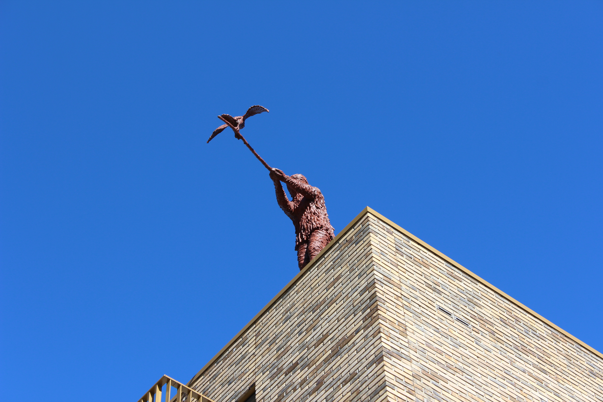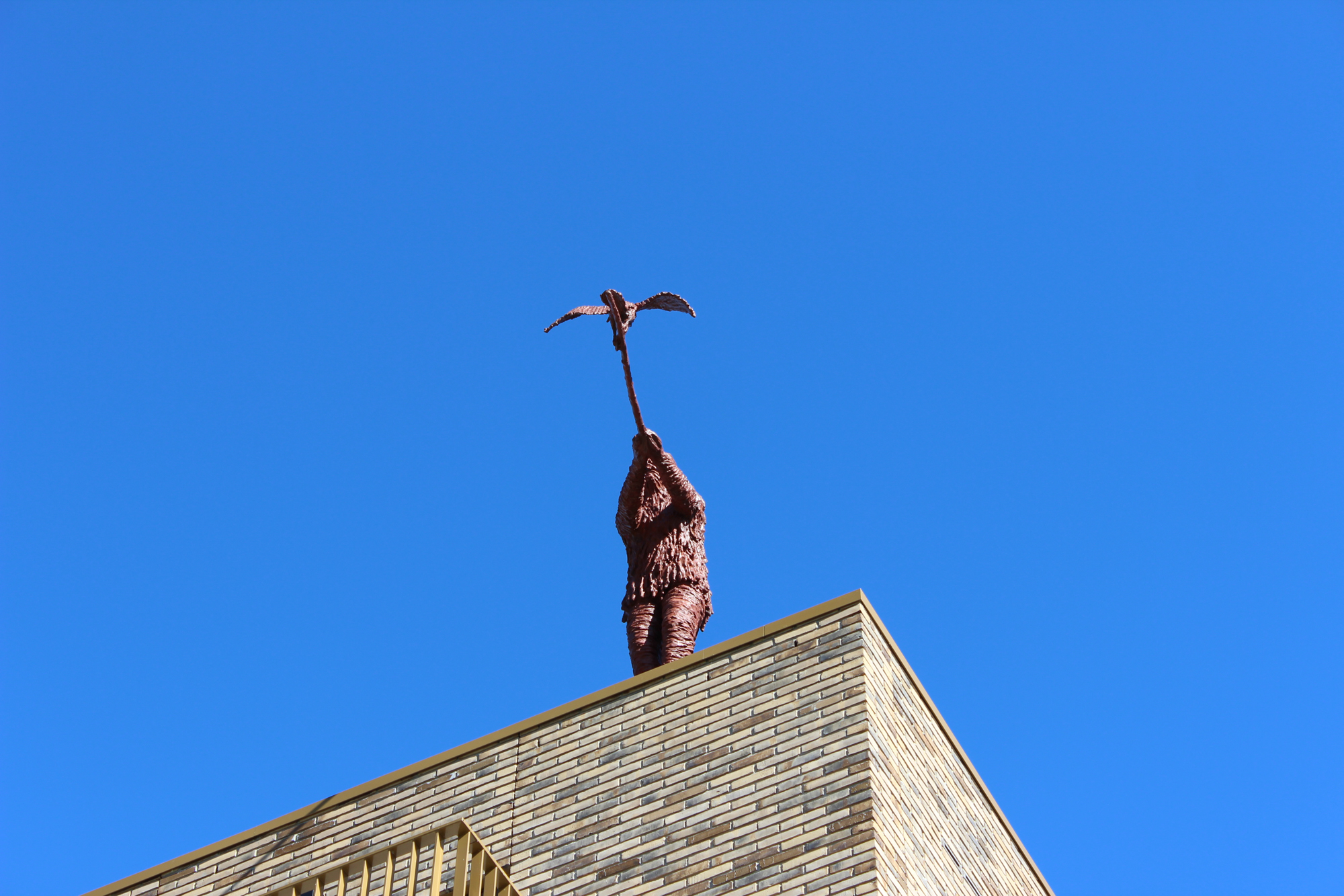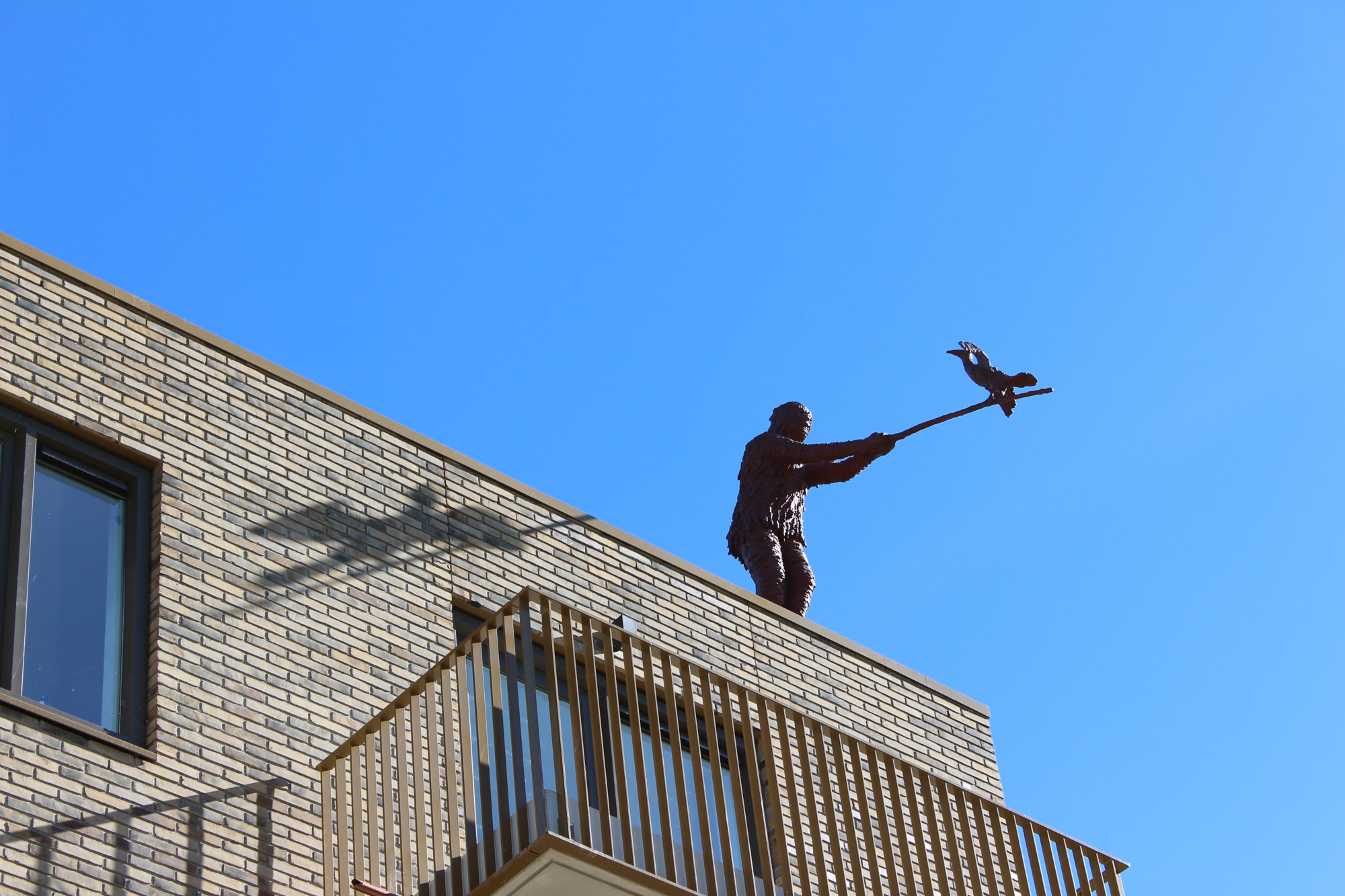 Het kunstwerk dat wij voorstellen is een bronzen sculptuur waarin in een tweetal ‘acteurs’ figureren; een manfiguur en een aalscholver. De man staat niet alleen recht op de daklijst, maar ook nog een echt op het randje. Zijn armen zijn naar voren gestrekt en in zijn houding lijkt hij daardoor een beetje naar voren te neigen. Met beide handen houdt hij stevig een tak vast die een flink stuk vooruit steekt. Op het einde van die tak zit een aalscholver in de typerende houding voor het drogen van de vleugels. Man en vogel zijn volkomen op elkaar gericht, ze kijken elkaar aan! Er is een zichtbare wederzijdse aandacht en dat maakt het contact tussen beide intens en direct. Sterker nog; de manfiguur heeft zich zó vereenzelvigd met de vogel dat daardoor z’n hele lichaam gehuld is in een verenhuid. Niet dat er letterlijk veren zichtbaar zijn; de huid is daar vooral een sculpturale impressie van. Een huid met streken en vegen, met diepte en gelaagdheid. Deze figuur staat niet alleen hoog, maar ook volop in de wind. De indruk van dynamiek en beweging die dat in een los verenpakket oplevert; vooral dat is zichtbaar in deze huid. Dit gaat verder dan een man met een pak van veren. Het lijkt er sterk op dat de manfiguur zich met heel zijn wezen de identiteit van de vogel probeert eigen te maken. Over het gehele beeld is een gelijkelijk verdeelde kleurstelling aangebracht. Een overwegend rood patina, maar met in de diepere delen in het huidreliëf een donkerder kleur. Deze enkele kleurtoon over het geheel benadrukt sterk de intentie tot eenwording die uit de figuren spreekt.