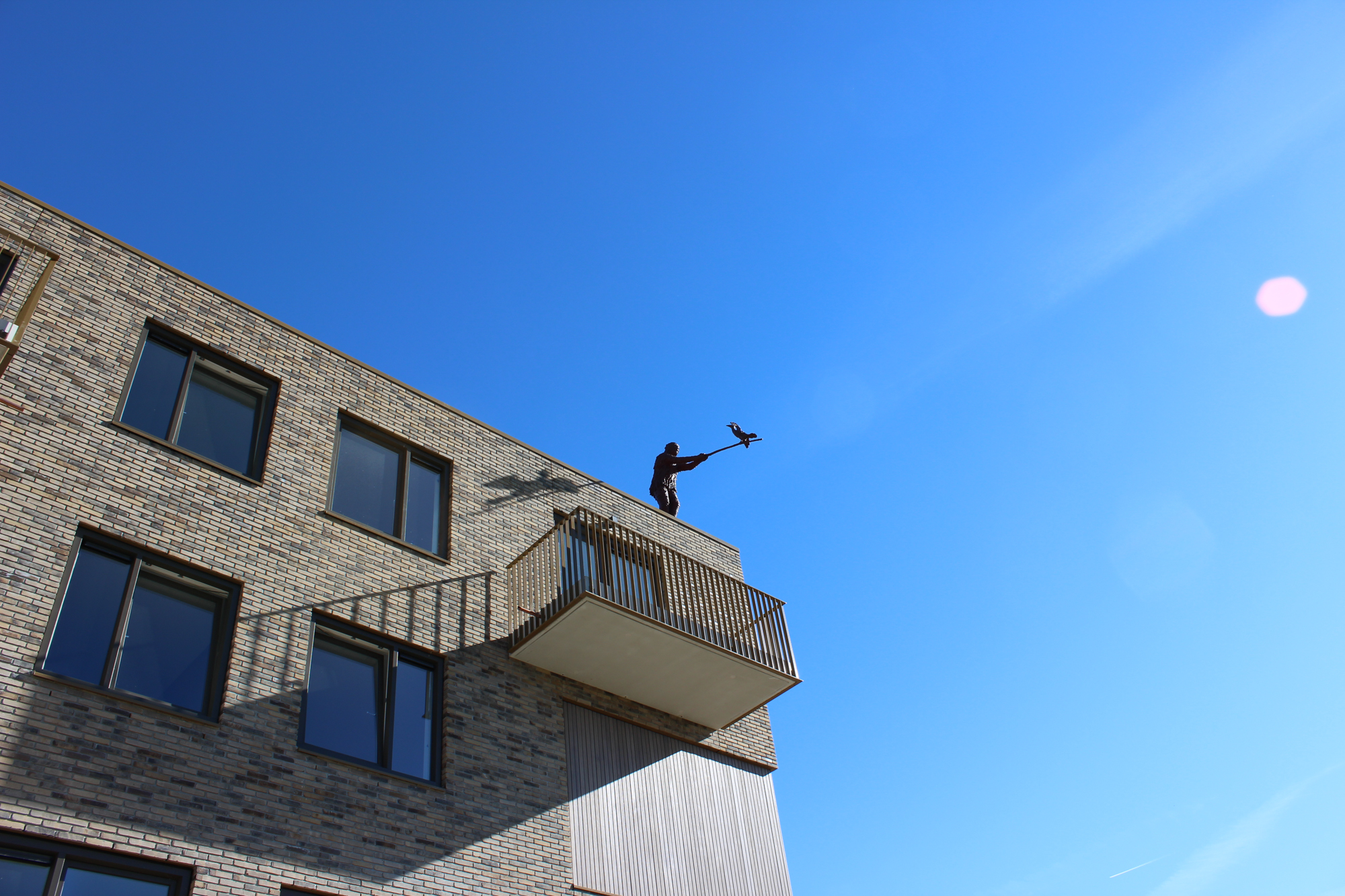 De noordwest gevel van ‘De Kijkers’ is eigenlijk de kopse kant en het begin van het nieuwbouwproject als geheel. Hoewel ons beeldvoorstel in zeker zin bescheiden is, want binnen het budget, zijn we er van overtuigd dat ons voorstel een maximale attentie waarde heeft. Door het heldere silhouet, de contrasterende kleur en de positie die het inneemt presenteert het zich als vanzelf. Het gebouw als zodanig biedt in deze een echt podium voor dit beeld. Als je de noordwest-gevel in z’n geheel als een schilderij ziet, dan valt natuurlijk al snel de focus op iets dat zich nèt buiten het kader van het schilderij bevind. Hoe bescheiden ook, met alleen de lucht als achtergrond, staat dit beeld eigenlijk altijd in het licht.