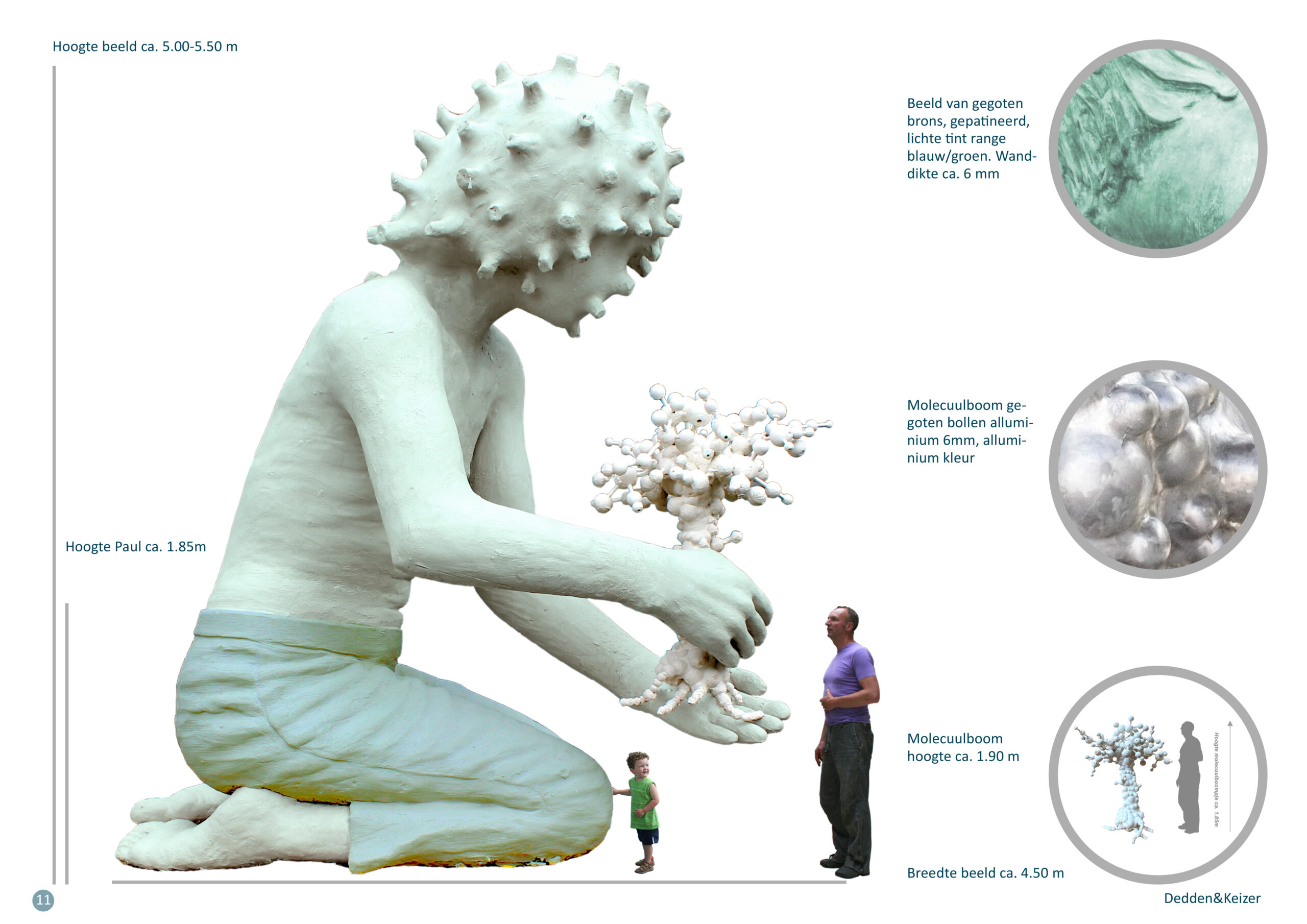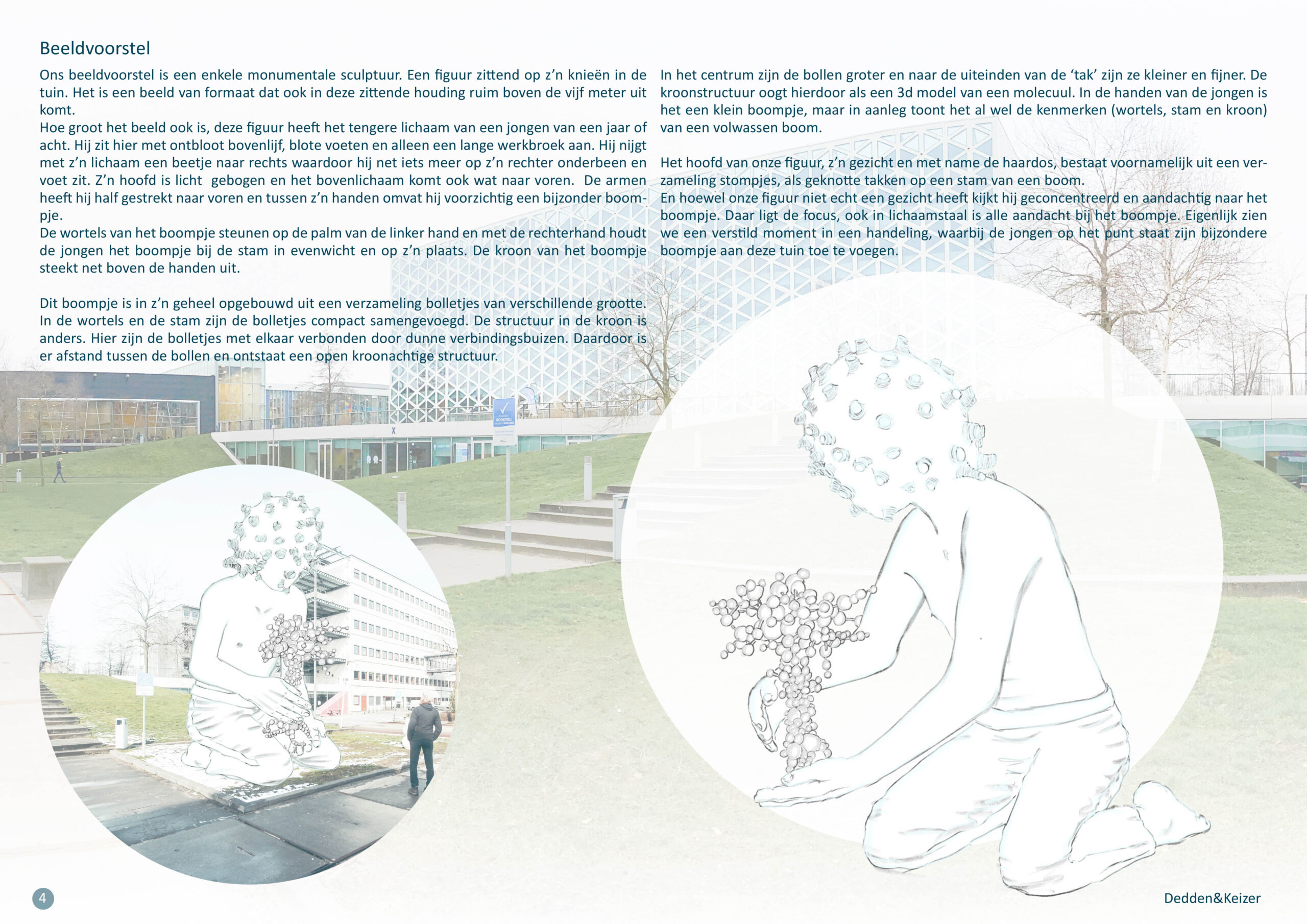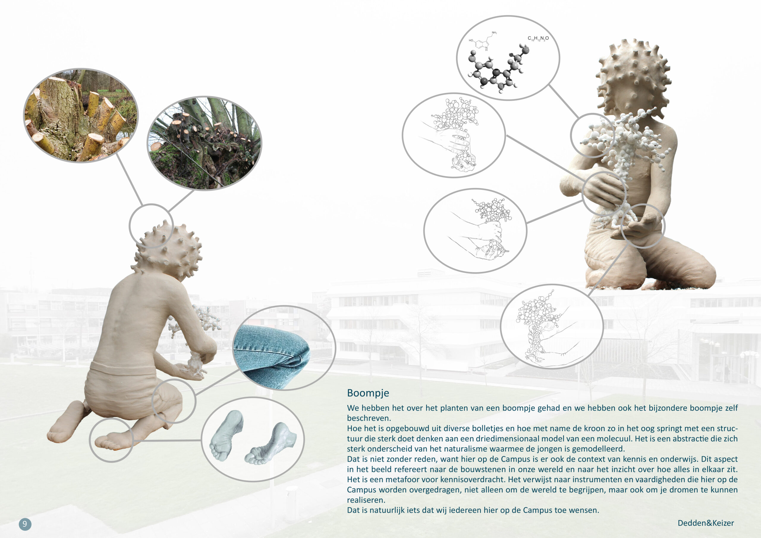 In het centrum zijn de bollen groter en naar de uiteinden van de ‘tak’ zijn ze kleiner en fijner. De kroonstructuur oogt hierdoor als een 3d model van een molecuul. In de handen van de jongen is het een klein boompje, maar in aanleg toont het al wel de kenmerken (wortels, stam en kroon) van een volwassen boom.