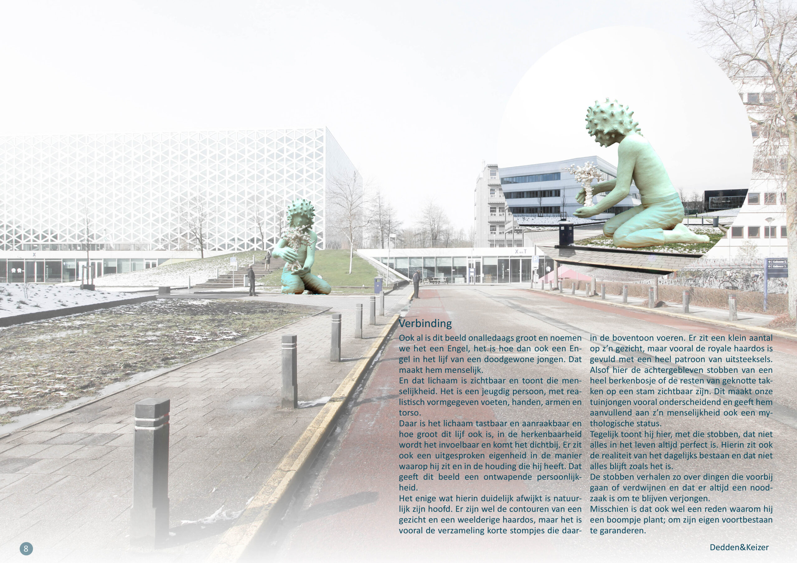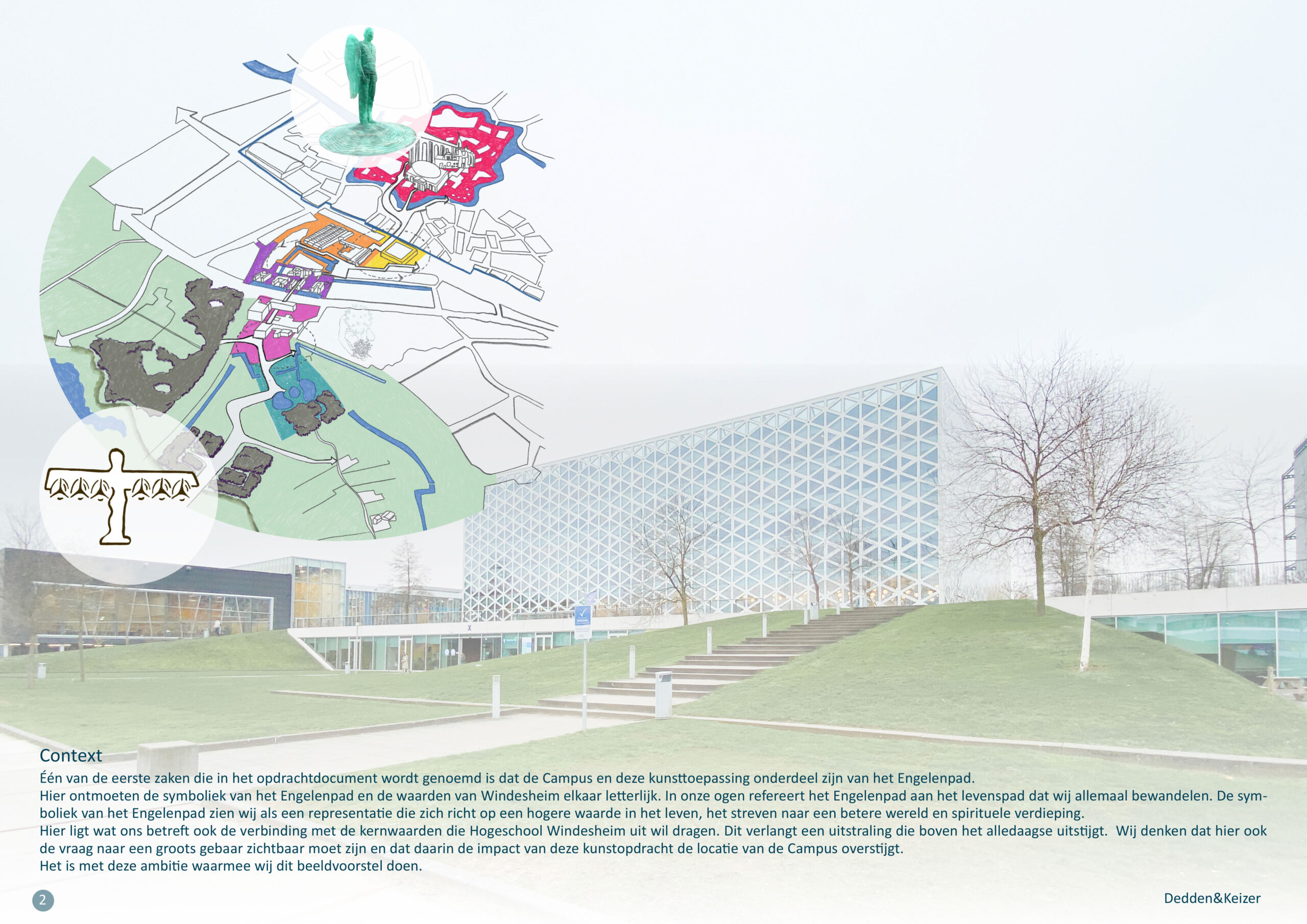 een veelzijdige vraagstelling, omdat er in onze ogen niet een enkel aspect is die de boventoon voert, maar meerdere aspecten een rol spelen op verschillende niveau’s.Wat er speelt is onder andere – het Engelenpad – de ontwikkeling van de stad en de verbining met de IJssel – de identiteit van de Hogeschool Windesheim (waar zij voor staan en wat zij uit willen dragen) – de locatie zelf en hoe de kunsttoepassing aan kan sluiten bijn de individuele beleving van studenten, mede- werkers en bezoekers. Met het beeldvoorstel dat wij hier presenteren denken wij antwoord te geven op al die aspecten.