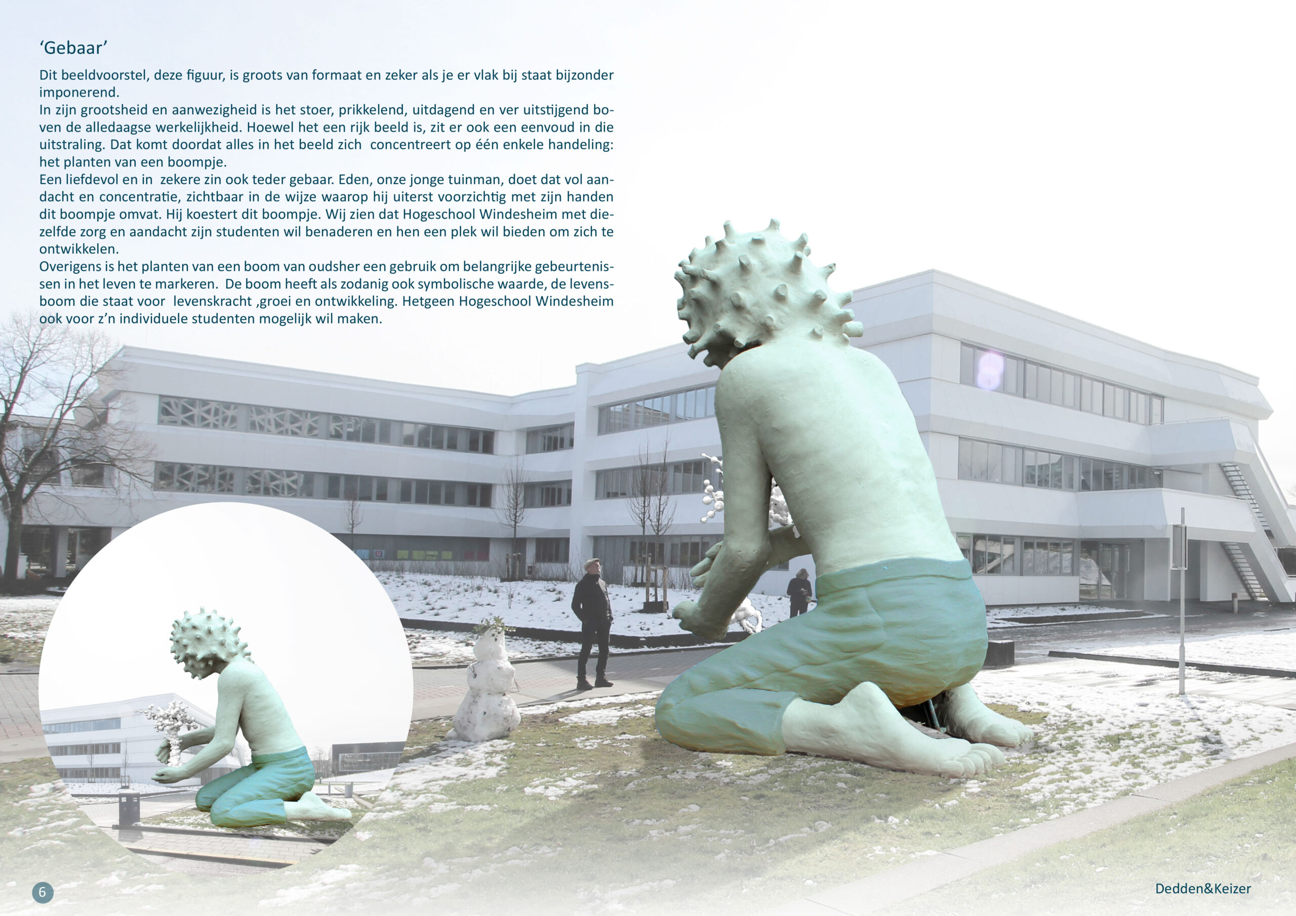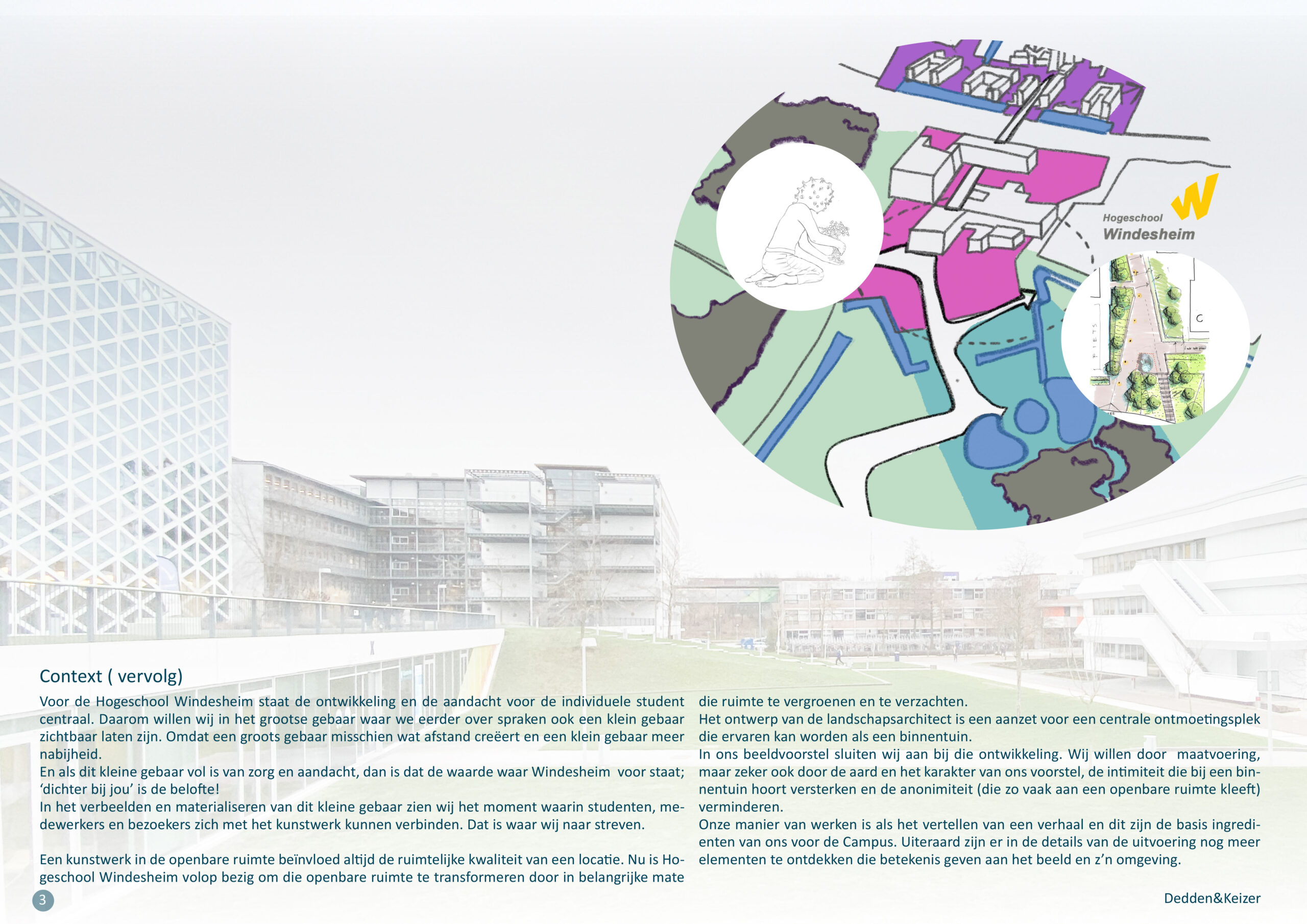 In het verbeelden en materialiseren van dit kleine gebaar zien wij het moment waarin studenten, me- dewerkers en bezoekers zich met het kunstwerk kunnen verbinden. Dat is waar wij naar streven.Een kunstwerk in de openbare ruimte beïnvloed altijd de ruimtelijke kwaliteit van een locatie. Nu is Hogeschool Windesheim volop bezig om die openbare ruimte te transformeren door in belangrijke matedie ruimte te vergroenen en te verzachten.