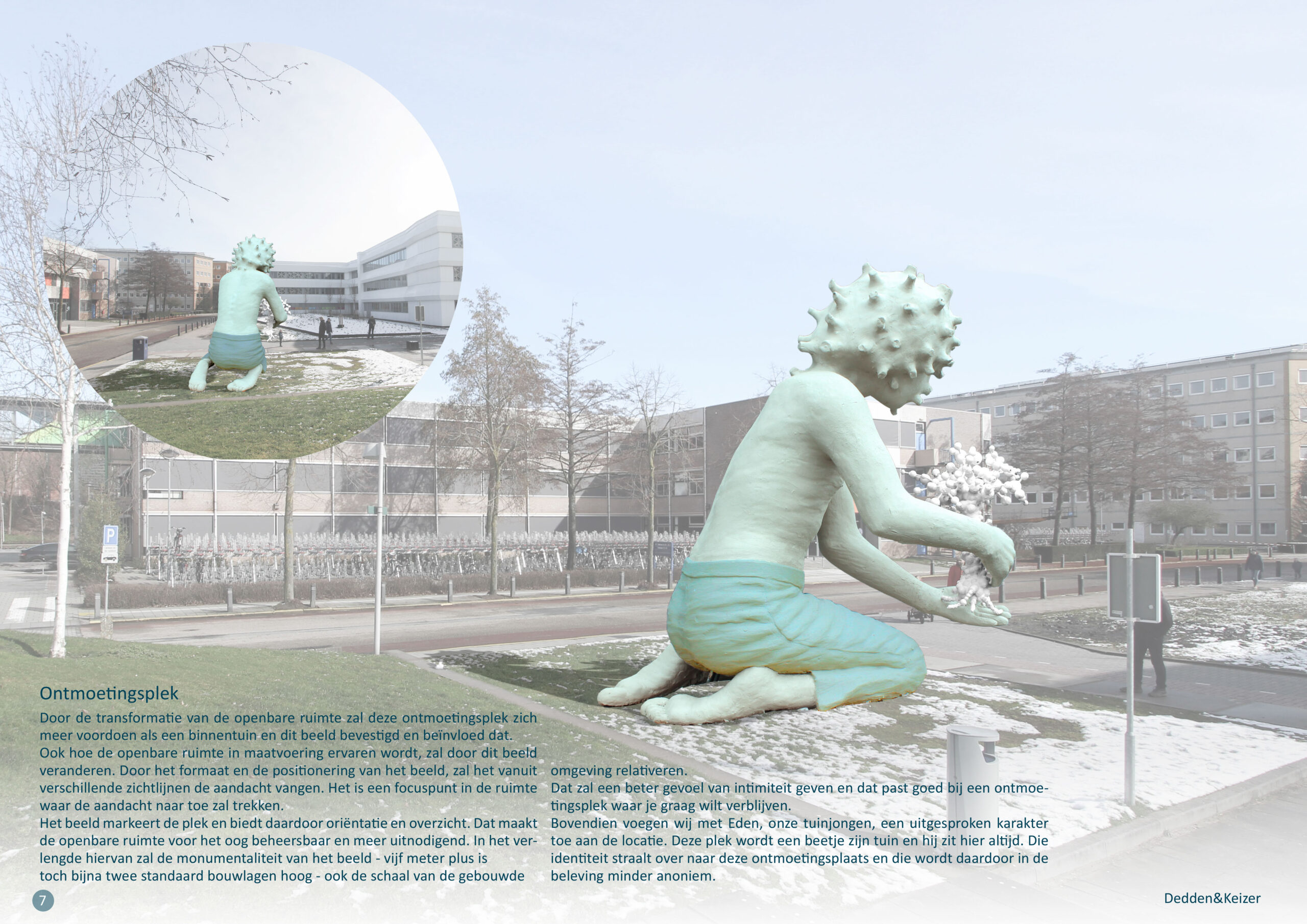 Door de transformatie van de openbare ruimte zal deze ontmoetingsplek zich meer voordoen als een binnentuin en dit beeld bevestigd en beïnvloed dat. Ook hoe de openbare ruimte in maatvoering ervaren wordt, zal door dit beeld veranderen. Door het formaat en de positionering van het beeld, zal het vanuit verschillende zichtlijnen de aandacht vangen. Het is een focuspunt in de ruimte waar de aandacht naar toe zal trekken.