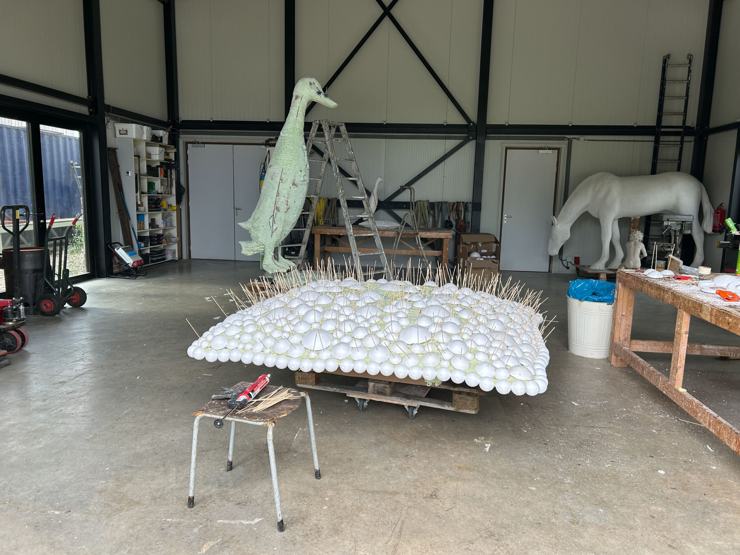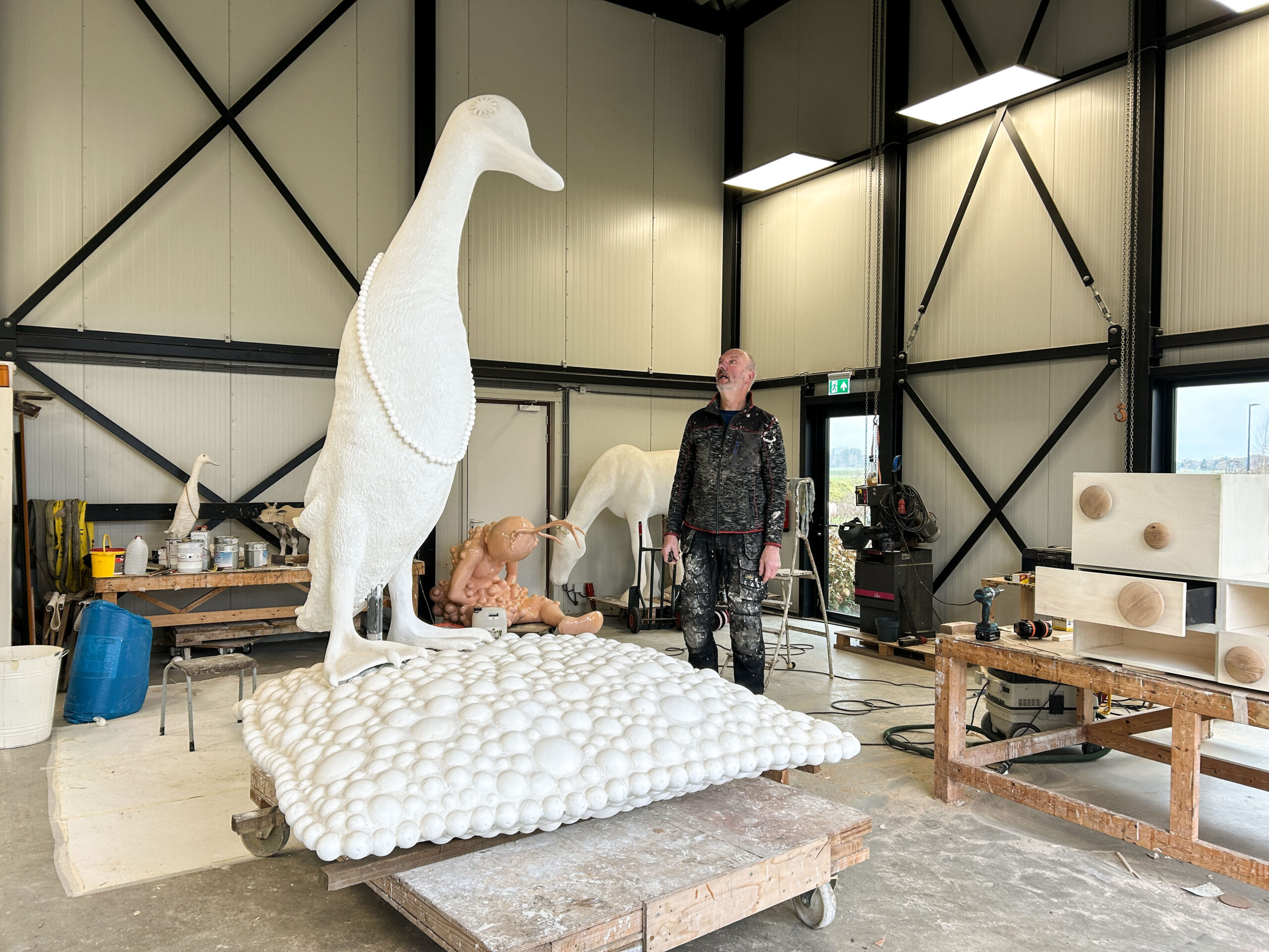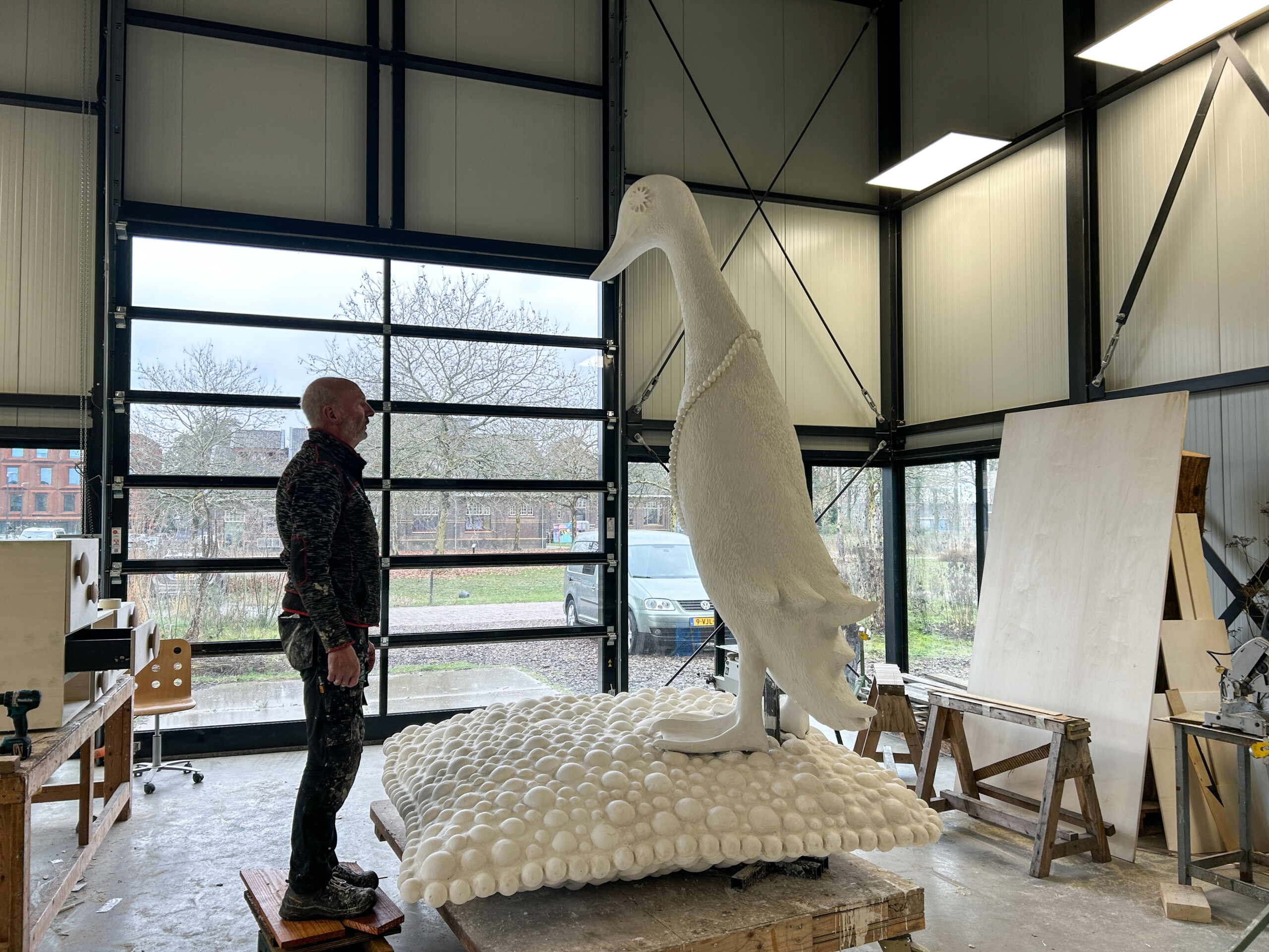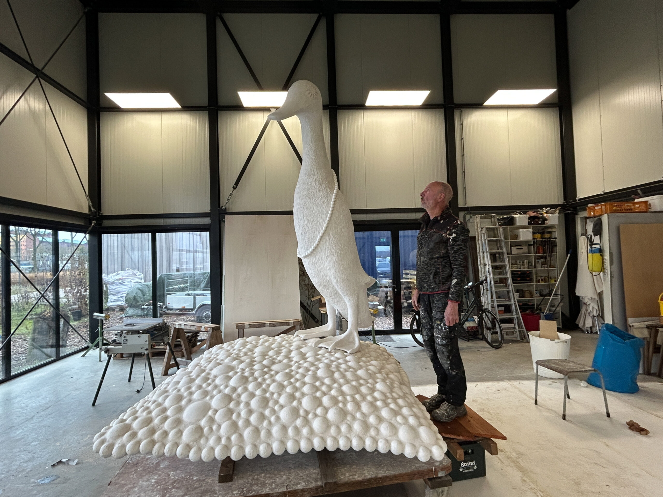 Ons beeldvoorstel is een gecombineerde sculptuur, waarin een rechtopstaande ranke bronzen loopeend parmantig op een huiselijk ogend bolletjeskussen van aluminium staat. De basis van onze sculptuur is een zilverkleurig rechthoekig kussen van aluminium, dat met een formaat van 2 bij 2 meter vergelijkbaar is met een riant tweepersoons slaapbed. Het gehele kussen is samengesteld uit individuele bolletjes van verschillend formaat. Er is een lichte bolling en glooiing in het kussen en die welving komt op de vier zijden bij elkaar in een horizontale zoom. Die zoom is op zich ook is samengesteld uit bolletjes, alleen beduidend kleiner van formaat en strak gerangschikt in een rand. Het kussen ligt vlak op de grond, waarbij je onder de rand maar een deel van de onderzijde van het kussen ziet.