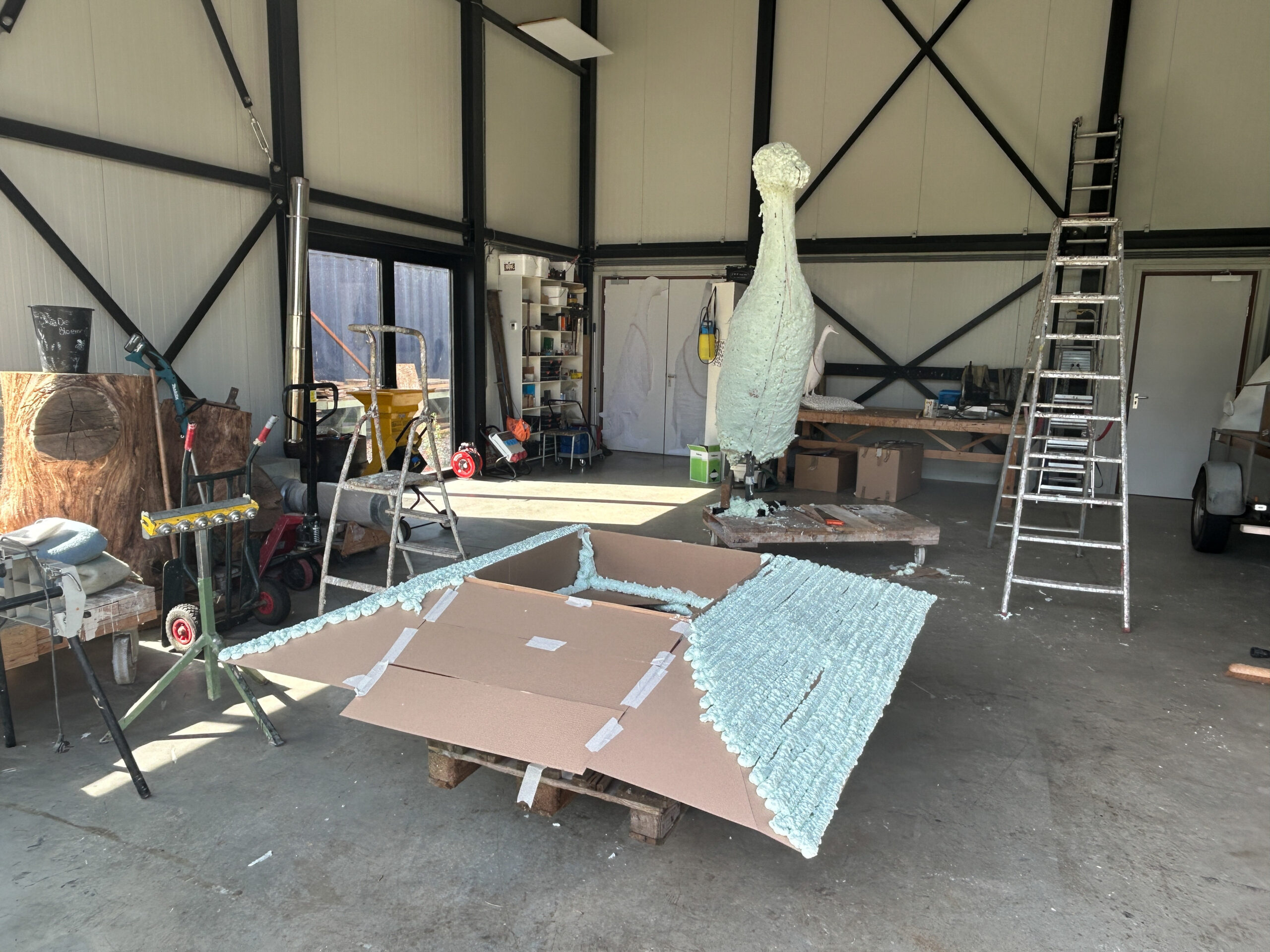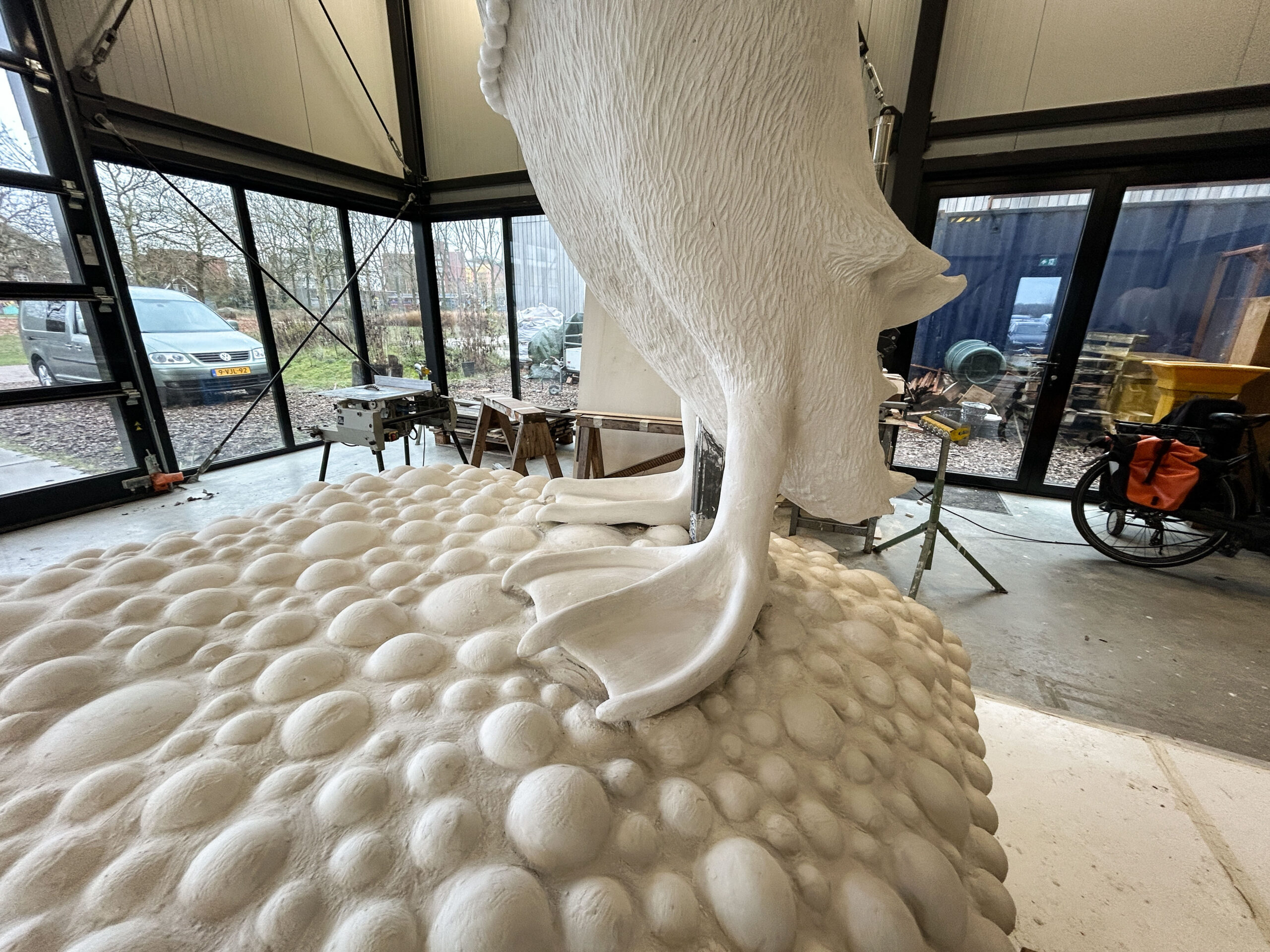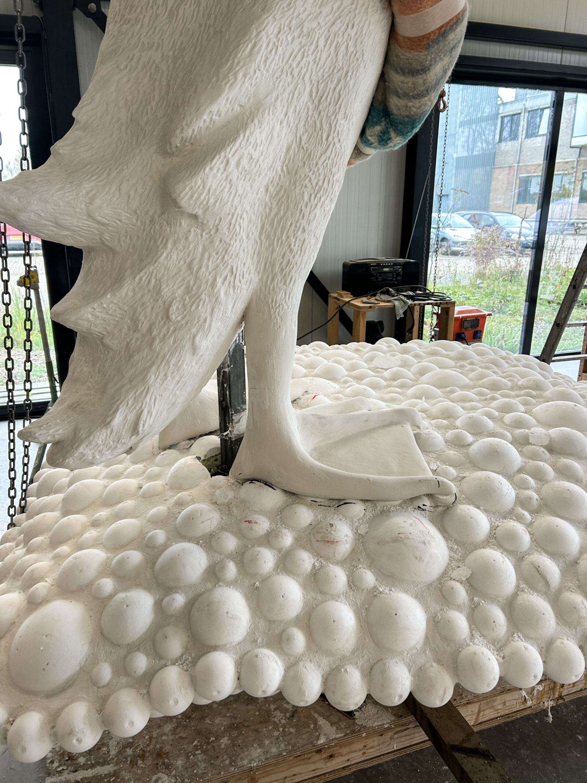 Ons beeldvoorstel is een gecombineerde sculptuur, waarin een rechtopstaande ranke bronzen loopeend parmantig op een huiselijk ogend bolletjeskussen van aluminium staat. De basis van onze sculptuur is een zilverkleurig rechthoekig kussen van aluminium, dat met een formaat van 2 bij 2 meter vergelijkbaar is met een riant tweepersoons slaapbed. Het gehele kussen is samengesteld uit individuele bolletjes van verschillend formaat. Er is een lichte bolling en glooiing in het kussen en die welving komt op de vier zijden bij elkaar in een horizontale zoom. Die zoom is op zich ook is samengesteld uit bolletjes, alleen beduidend kleiner van formaat en strak gerangschikt in een rand. Het kussen ligt vlak op de grond, waarbij je onder de rand maar een deel van de onderzijde van het kussen ziet.