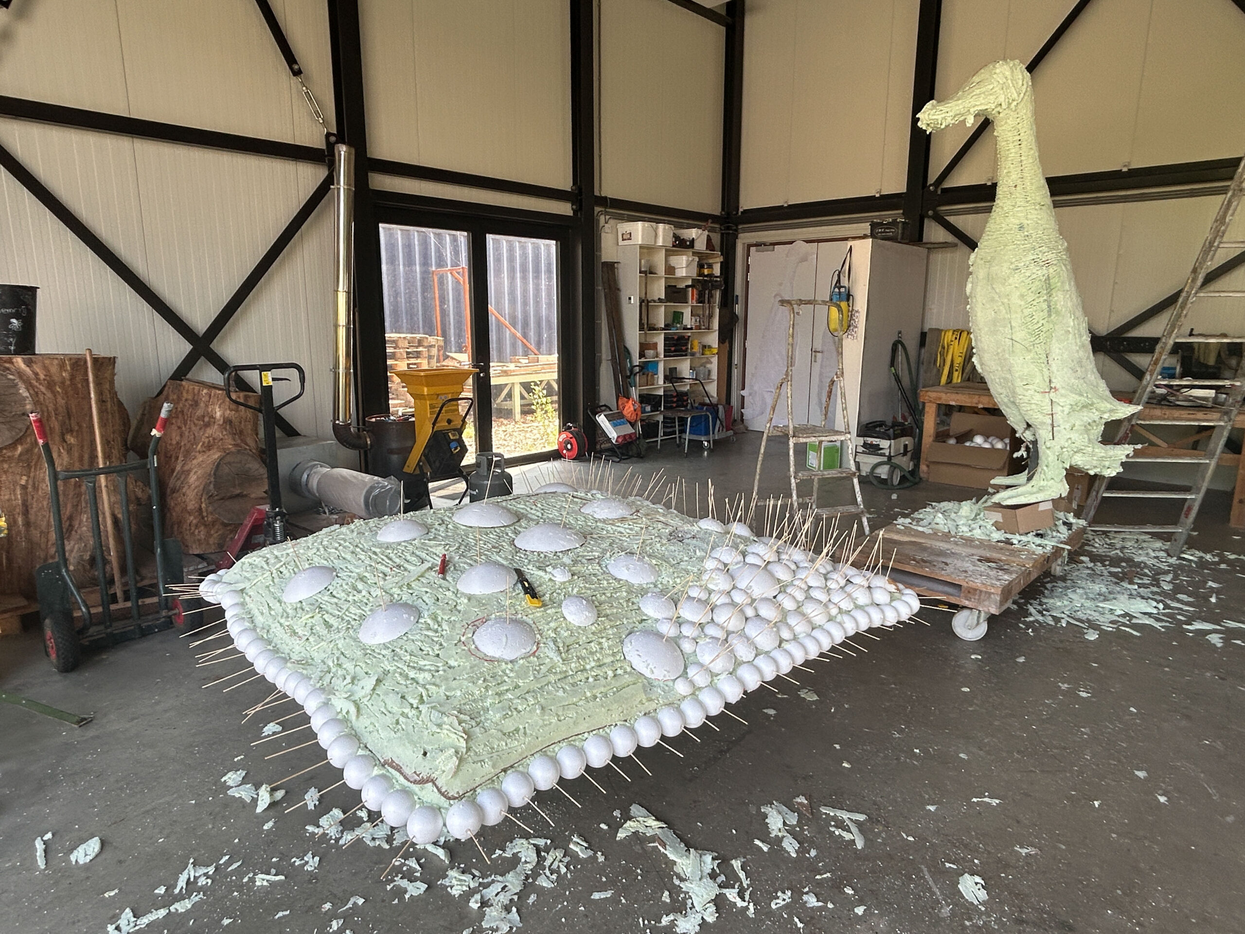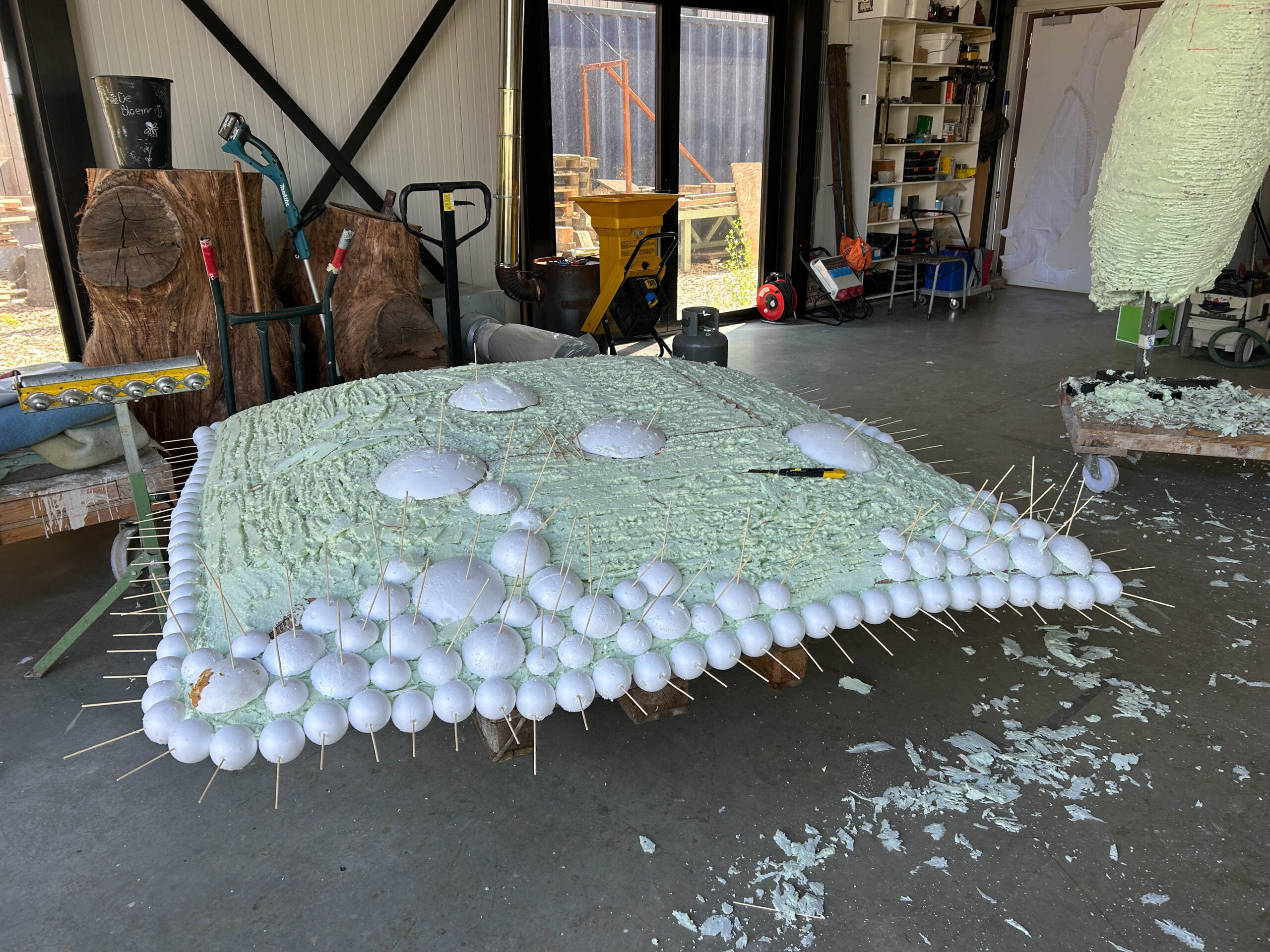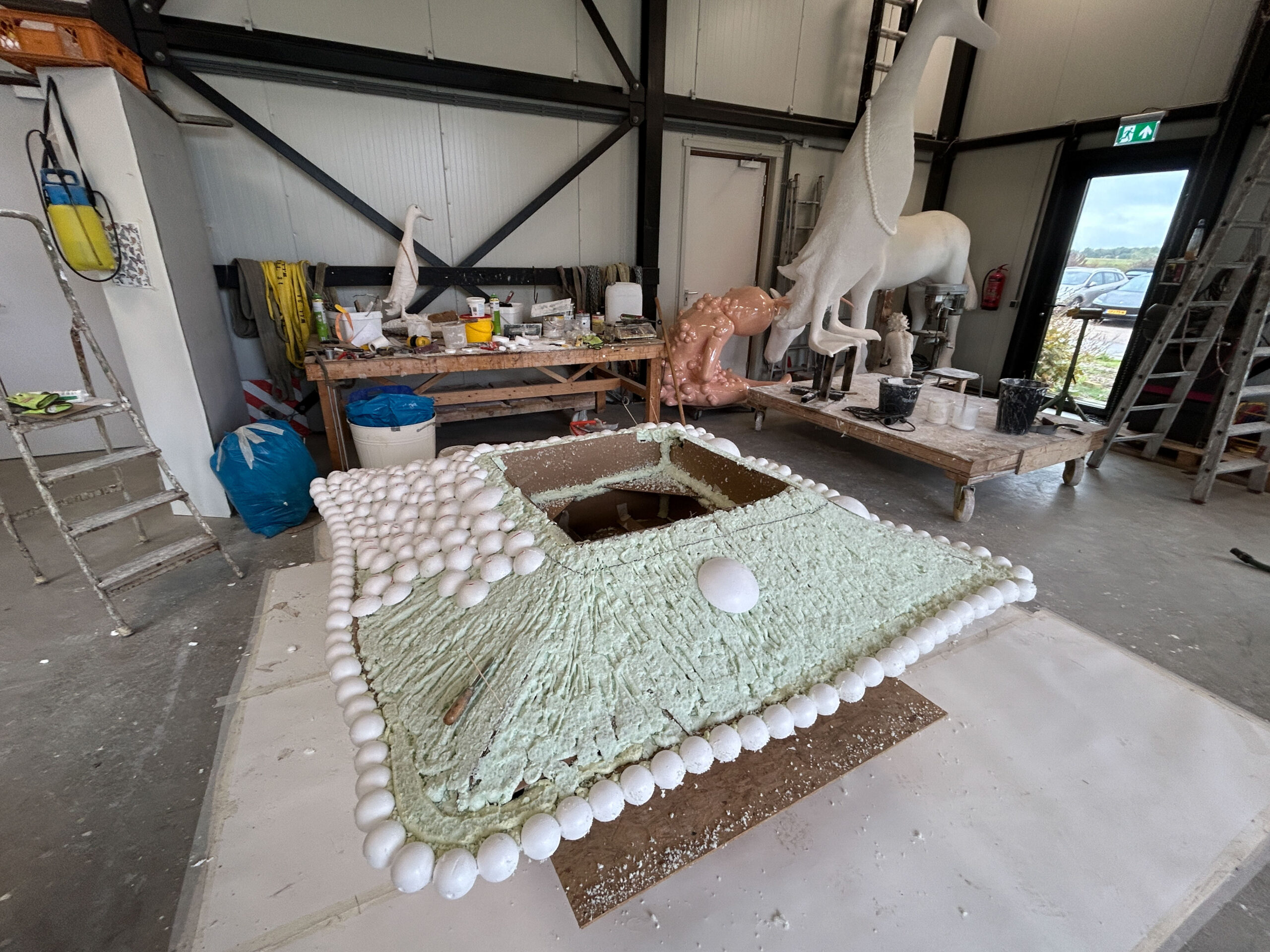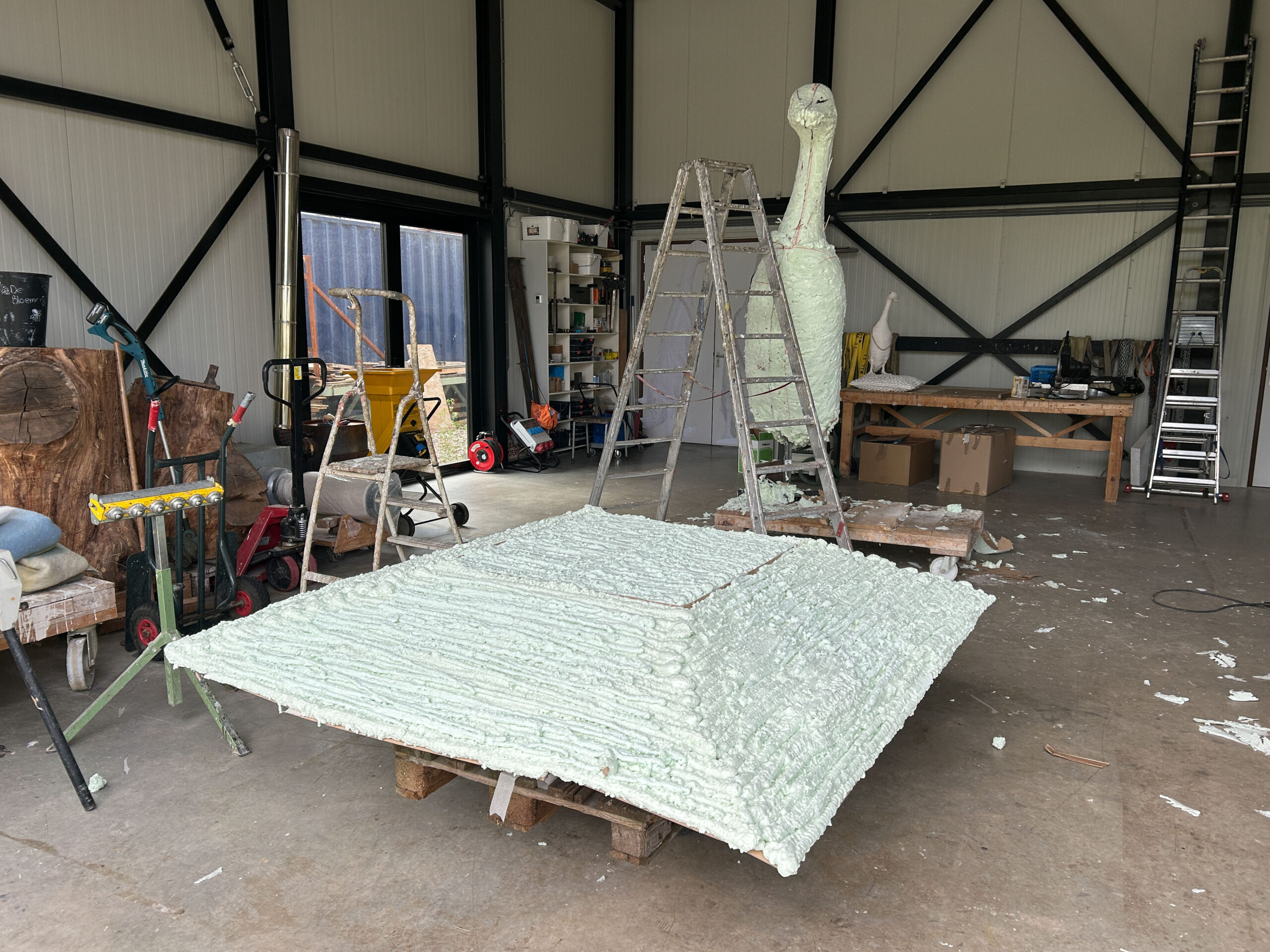 Ons beeldvoorstel is een gecombineerde sculptuur, waarin een rechtopstaande ranke bronzen loopeend parmantig op een huiselijk ogend bolletjeskussen van aluminium staat. De basis van onze sculptuur is een zilverkleurig rechthoekig kussen van aluminium, dat met een formaat van 2 bij 2 meter vergelijkbaar is met een riant tweepersoons slaapbed. Het gehele kussen is samengesteld uit individuele bolletjes van verschillend formaat. Er is een lichte bolling en glooiing in het kussen en die welving komt op de vier zijden bij elkaar in een horizontale zoom. Die zoom is op zich ook is samengesteld uit bolletjes, alleen beduidend kleiner van formaat en strak gerangschikt in een rand. Het kussen ligt vlak op de grond, waarbij je onder de rand maar een deel van de onderzijde van het kussen ziet.
