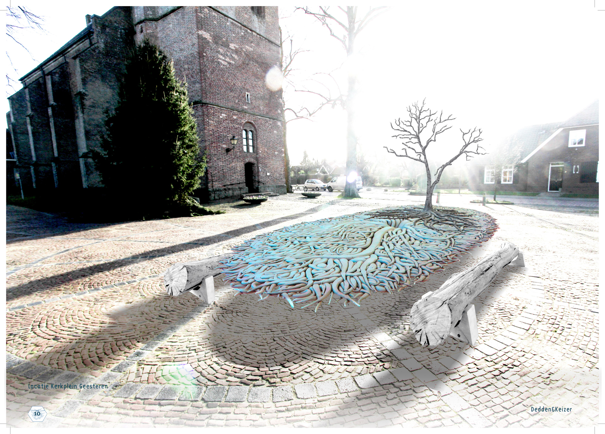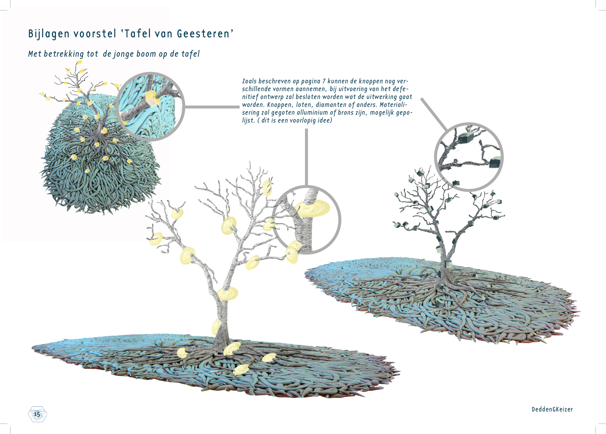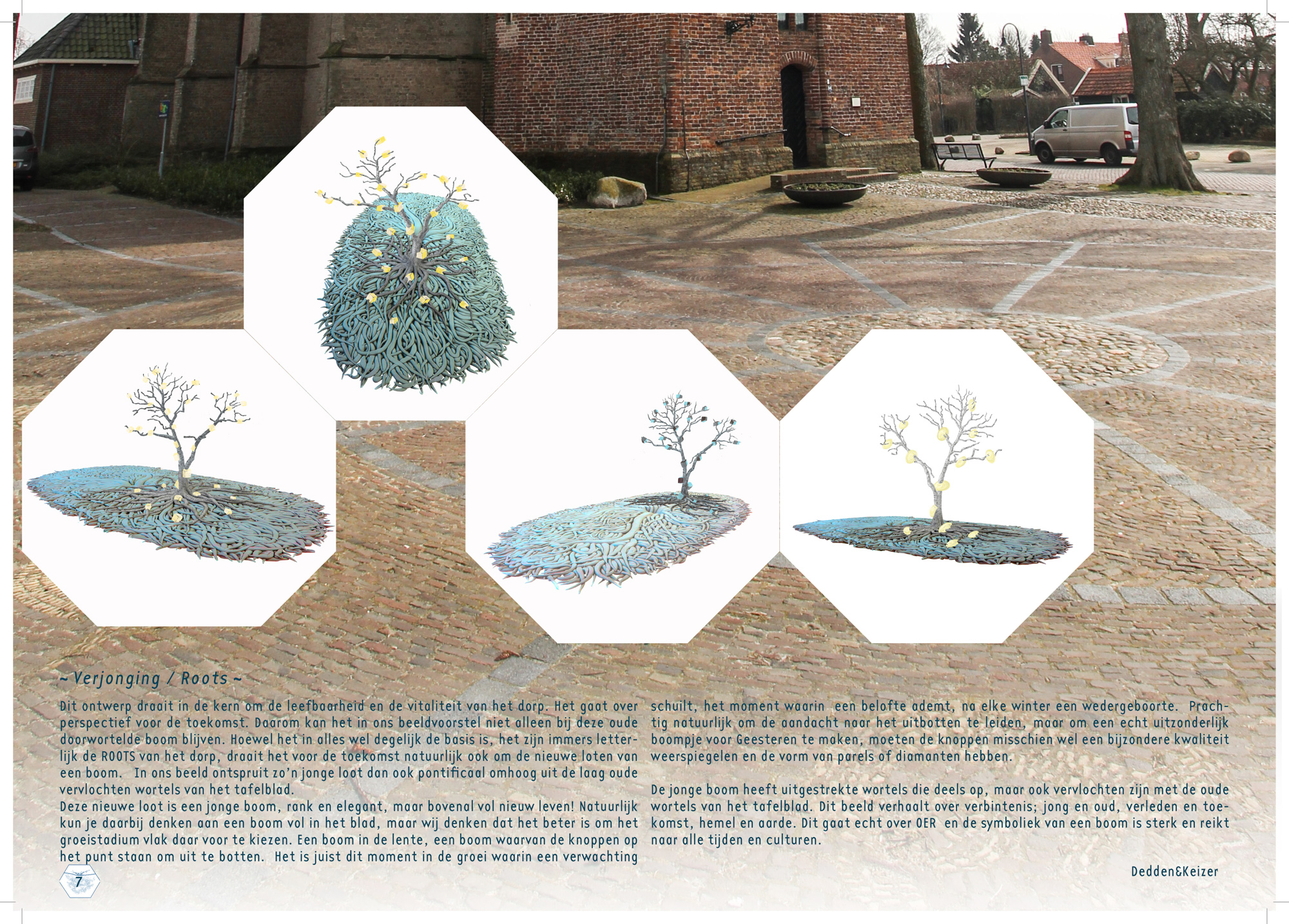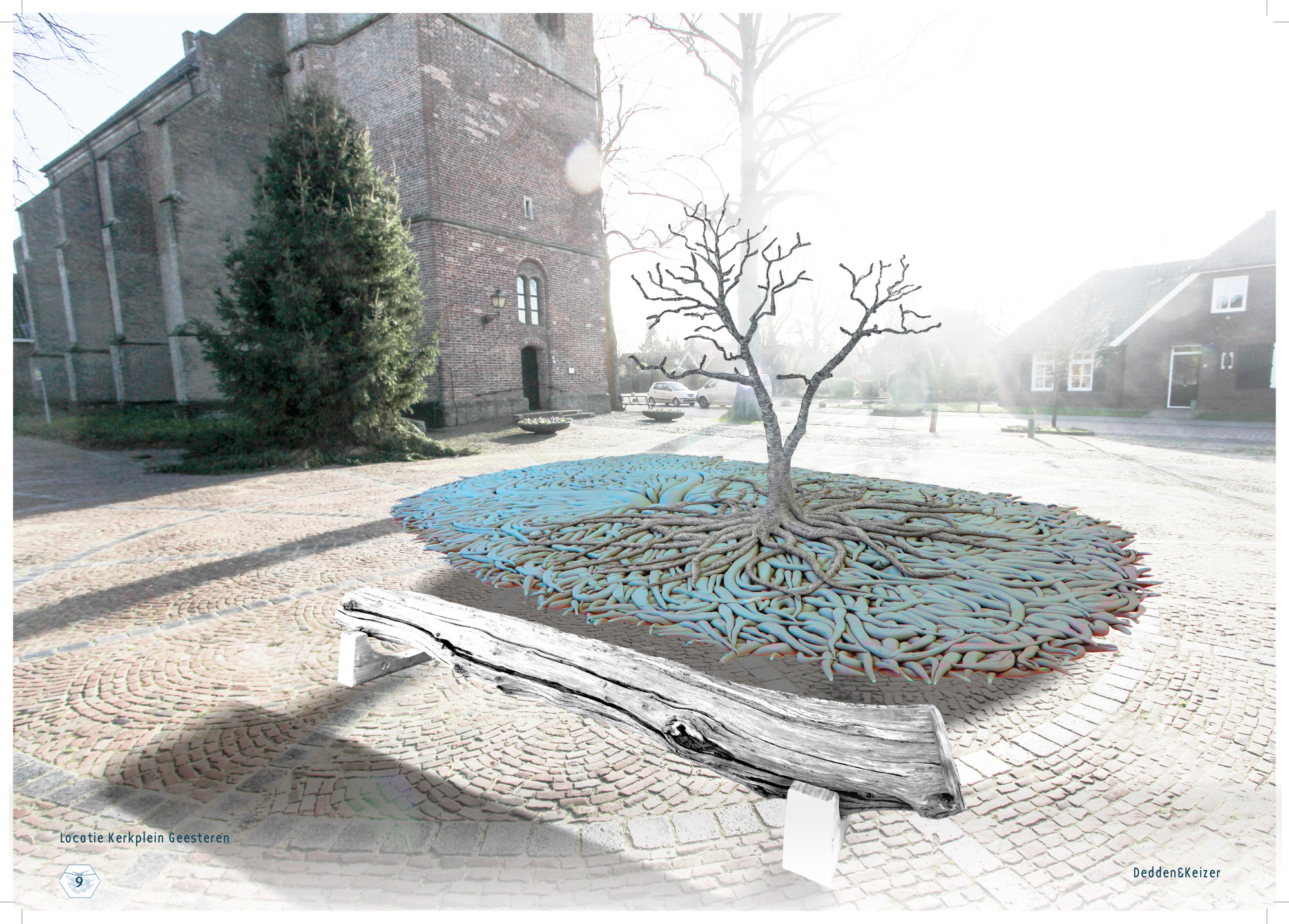 Wat we gaan doen is de boel op z’n kop zetten, letterlijk dus. We gaan op het plein een boom op z’n kop zetten en dat betekend dat de kroon onder de grond zit en de wortels boven de grond staan. Van het wortelstelsel gaan we een tafelblad samenstellen van zo’n 10/12 m² waar je ook daadwerkelijk aan kunt zitten en deze staat op een onderstam die leidt naar de kroon onder het plein. Op het tafelblad zelf, dus op de wortels groeit een nieuwe loot, een jonge boom. Beetje zoals een berk in de lente, jong, pril, transparant. Hoe precies de vorm gaat worden gaan we de komende maanden bepalen, zijn we nog niet over uit….. nou ja en zo nog wat zaken dus….