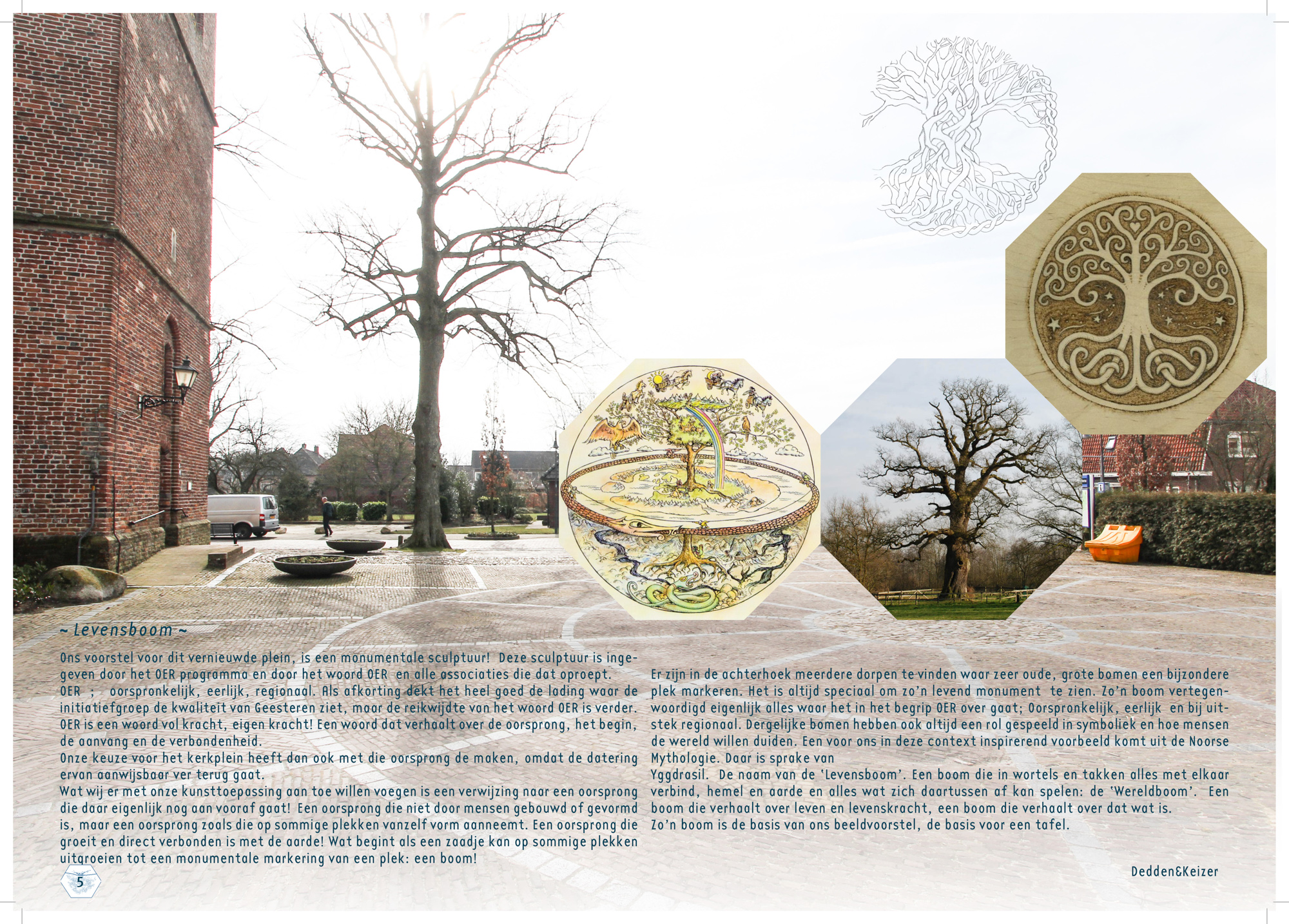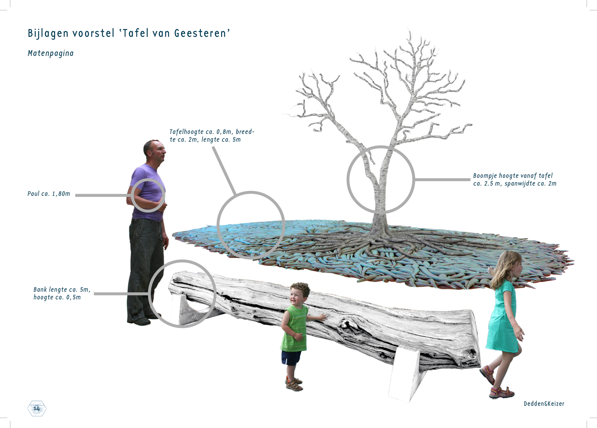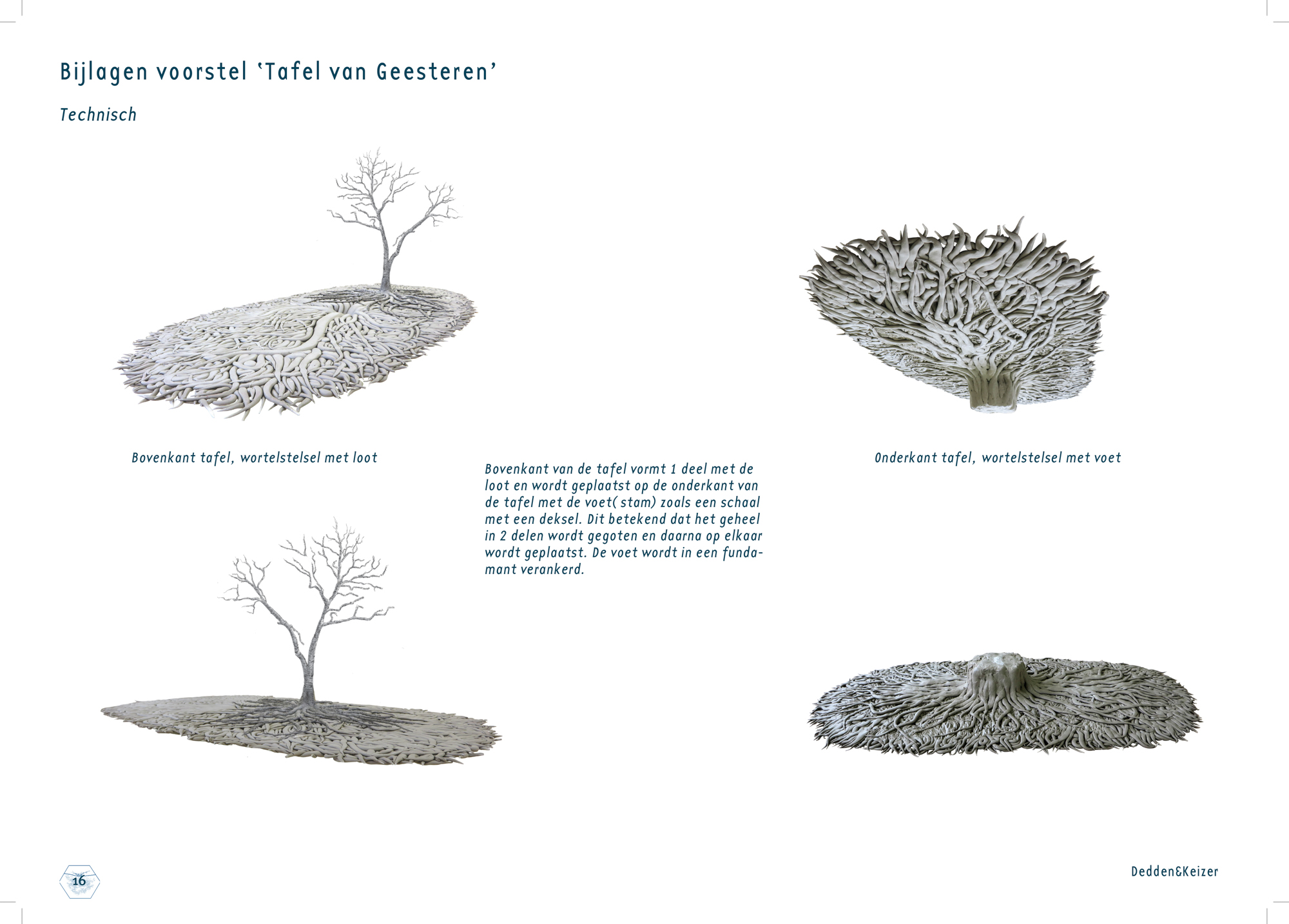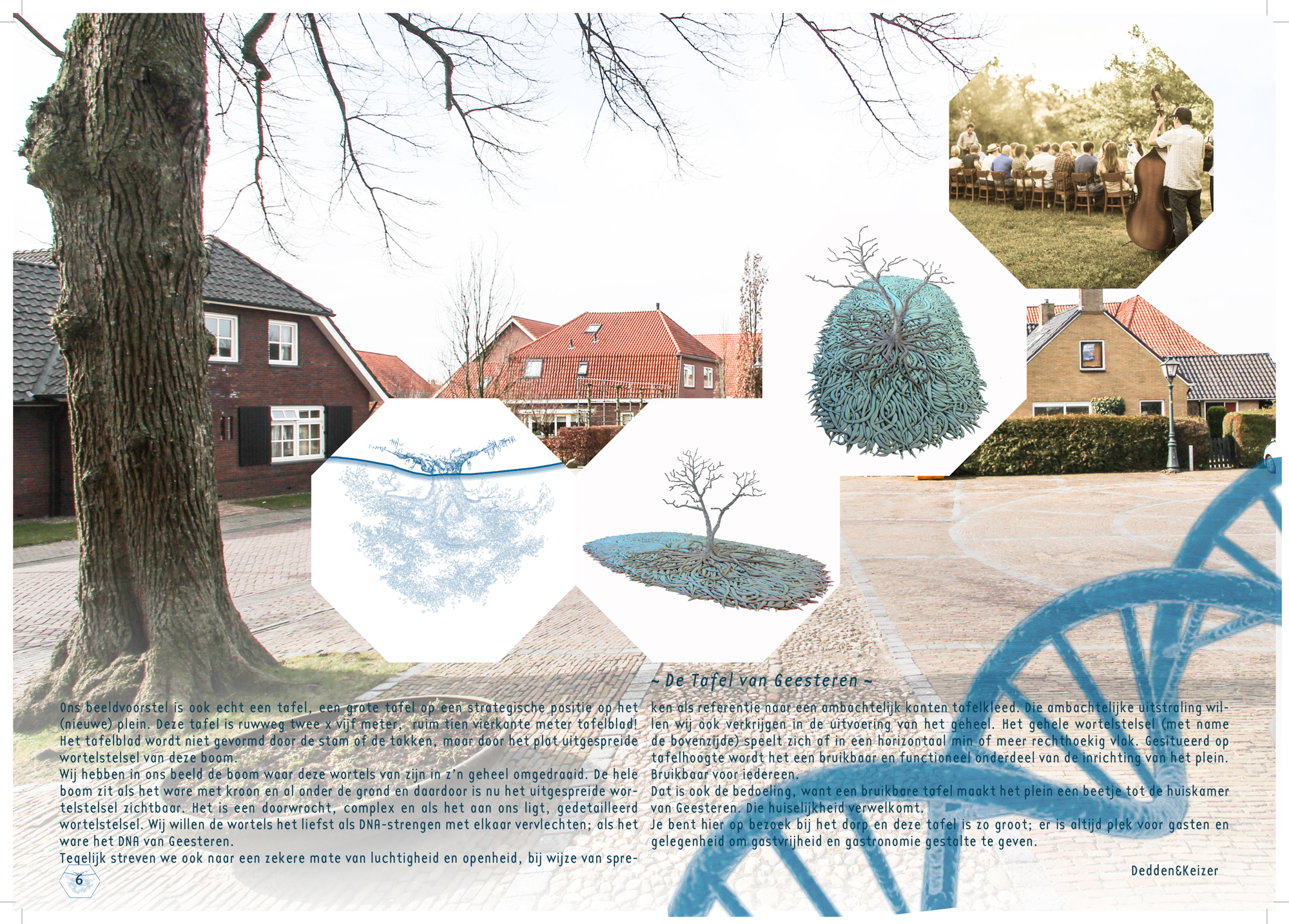 Wat we gaan doen is de boel op z’n kop zetten, letterlijk dus. We gaan op het plein een boom op z’n kop zetten en dat betekend dat de kroon onder de grond zit en de wortels boven de grond staan. Van het wortelstelsel gaan we een tafelblad samenstellen van zo’n 10/12 m² waar je ook daadwerkelijk aan kunt zitten en deze staat op een onderstam die leidt naar de kroon onder het plein. Op het tafelblad zelf, dus op de wortels groeit een nieuwe loot, een jonge boom. Beetje zoals een berk in de lente, jong, pril, transparant. Hoe precies de vorm gaat worden gaan we de komende maanden bepalen, zijn we nog niet over uit….. nou ja en zo nog wat zaken dus….