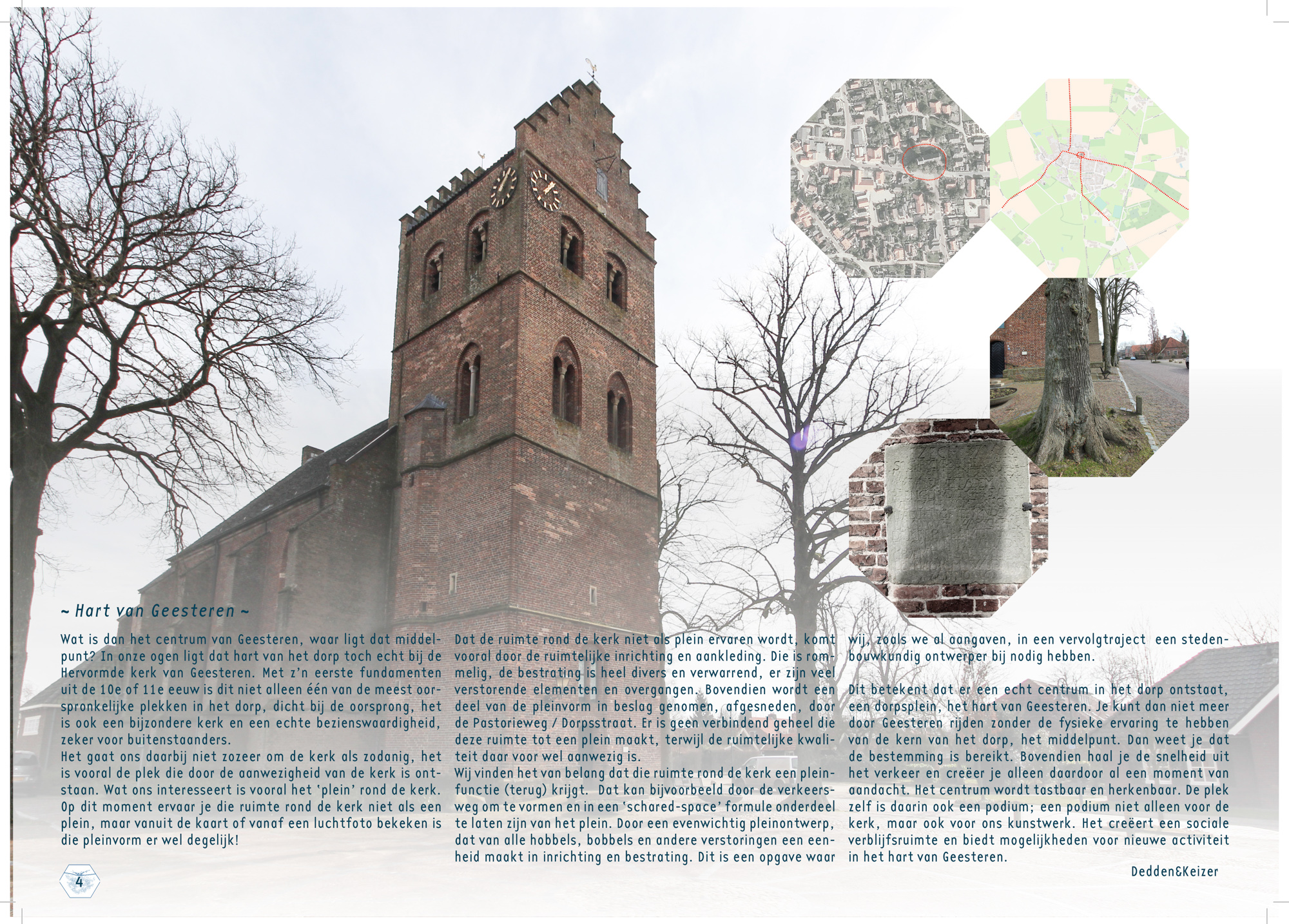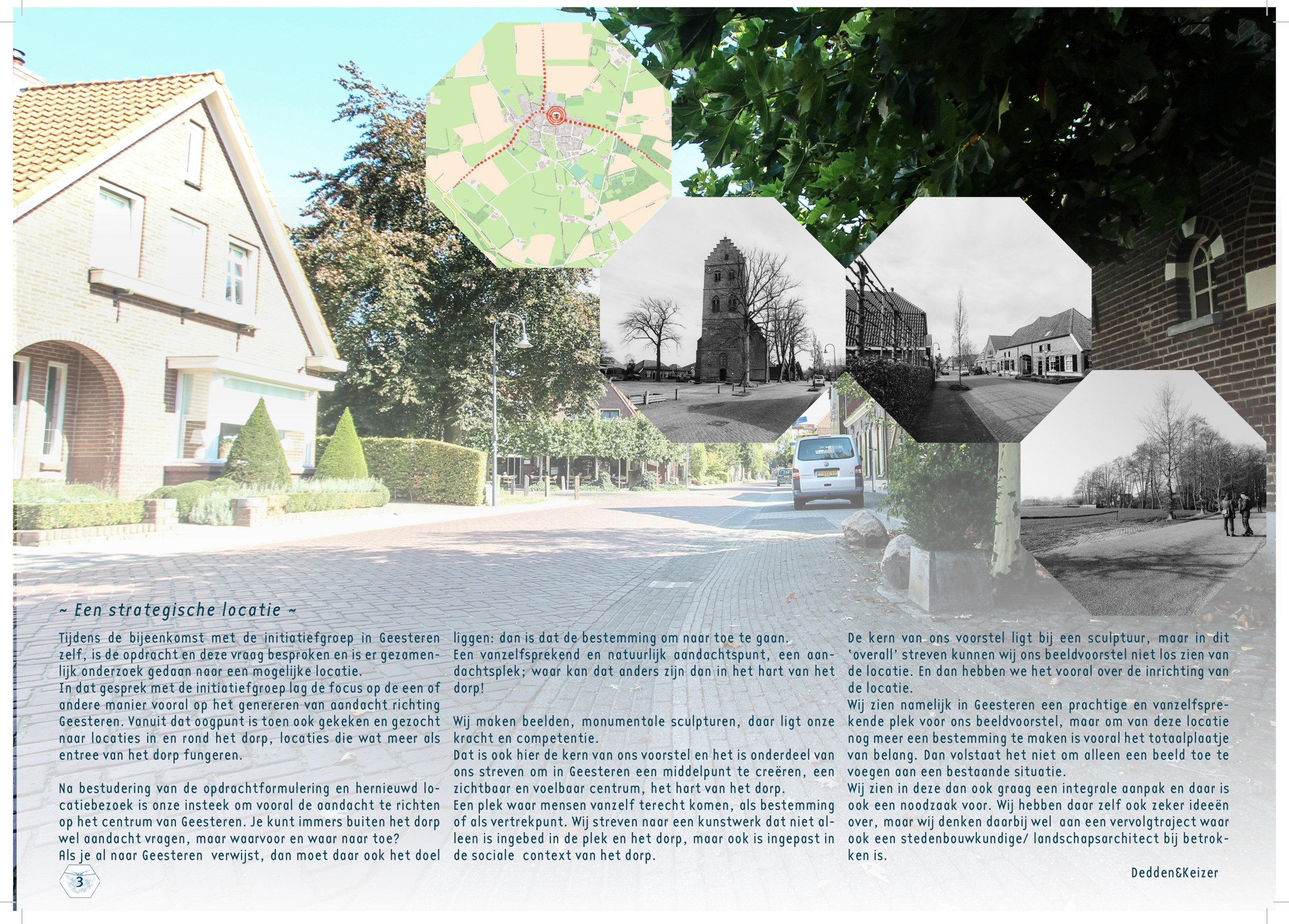 Het idee is om met een creatieve ingreep in de buitenruimte te verwijzen naar deze actieve en dynamische bedrijvigheid van de dorpskern Geesteren. Het liefst ziet men een aansprekend object of een spraakmakende ingreep op een strategisch uitgekiende plek, die als informatie- en vertrekpunt voor fiets- en wandelroutes gaat fungeren.