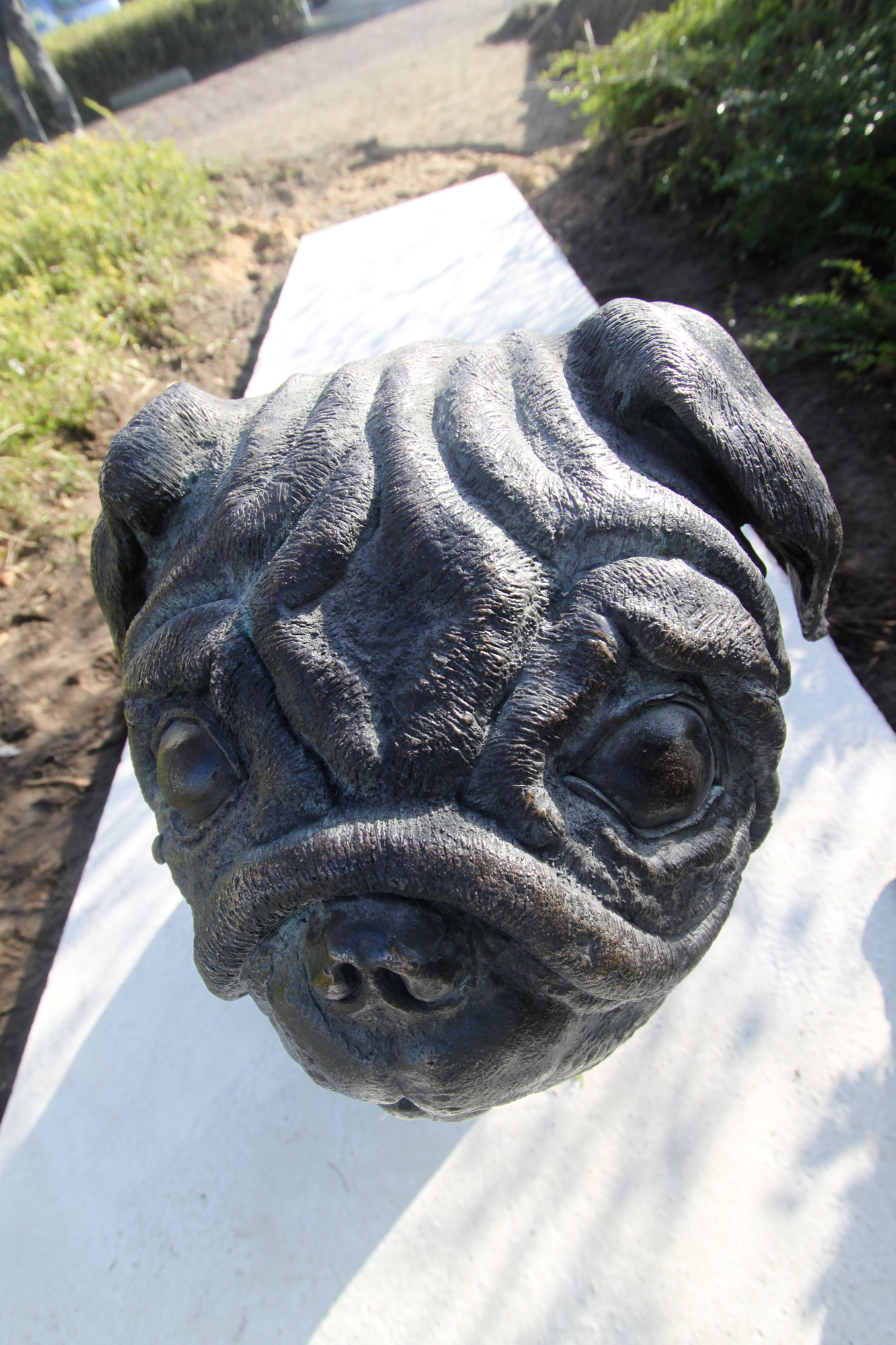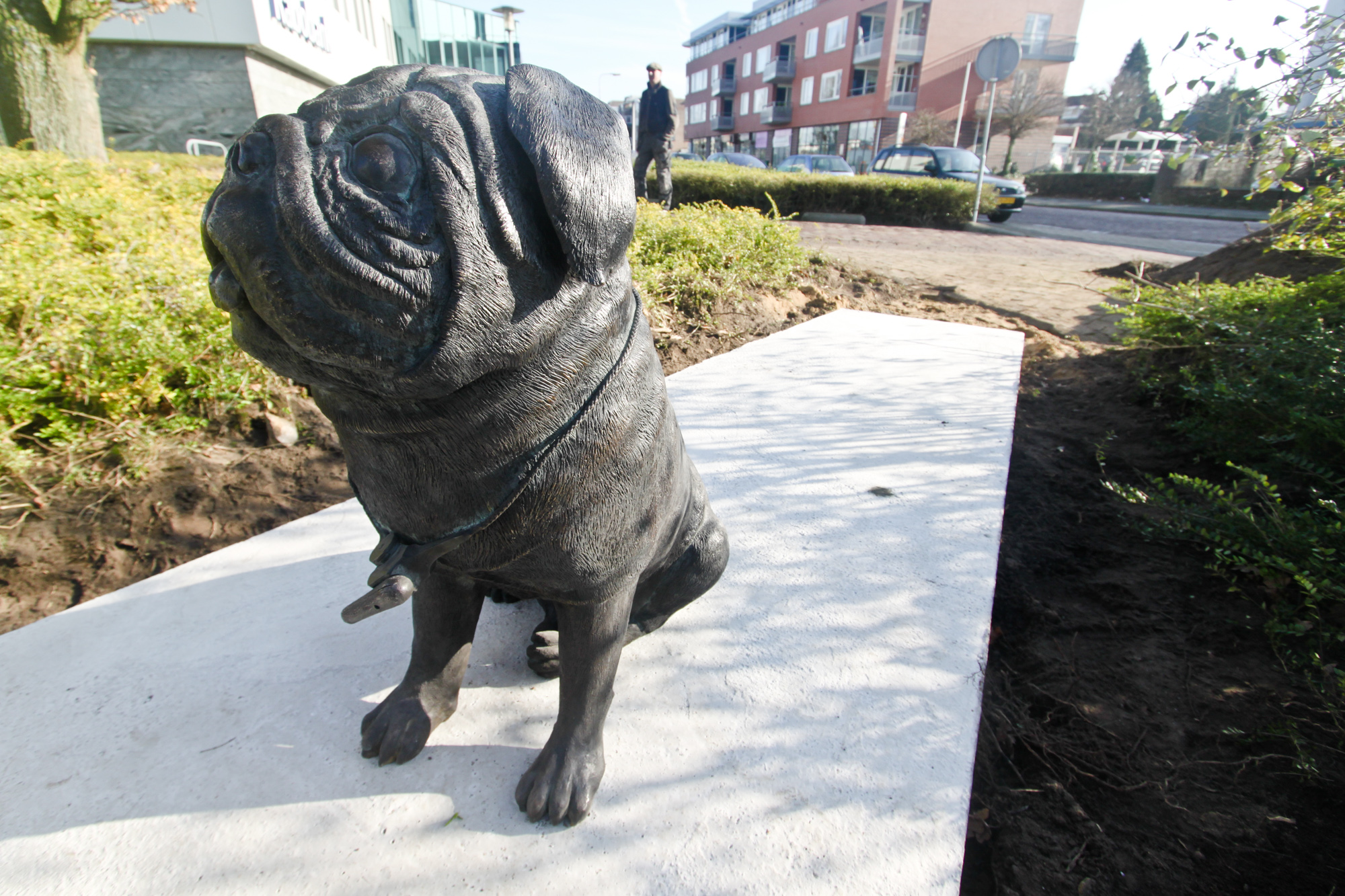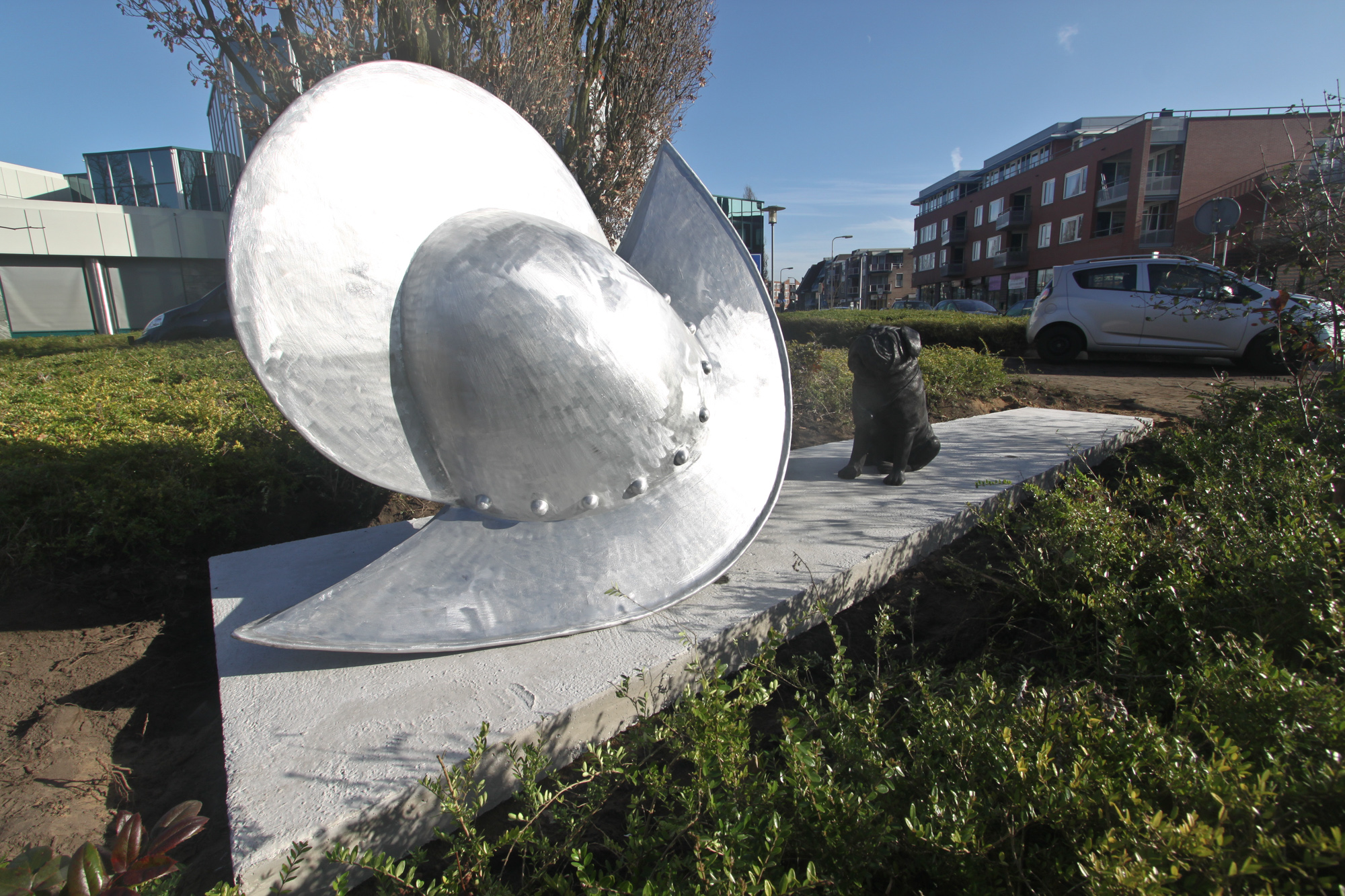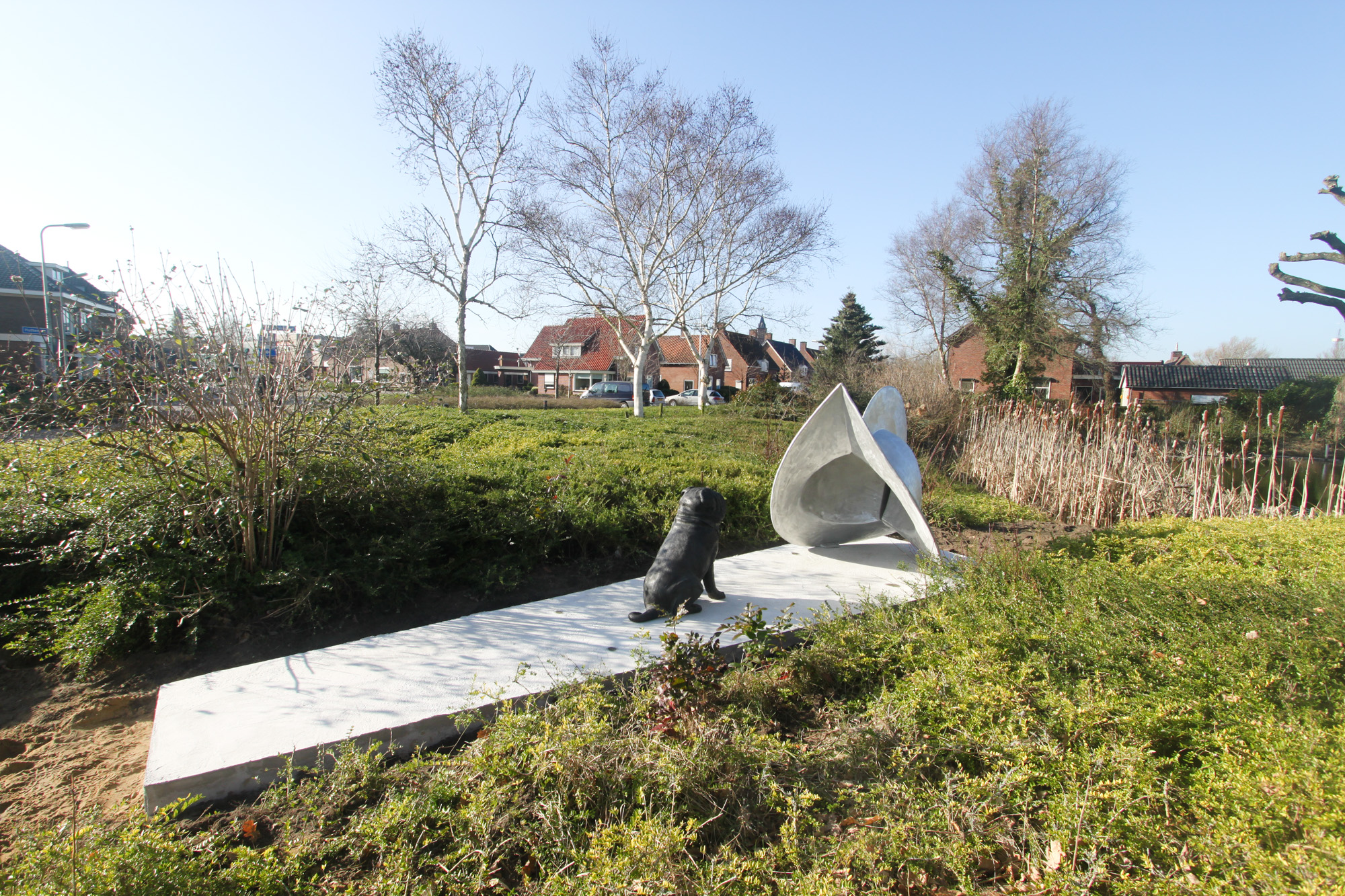 Yes we let the dog out ! Afgelopen vrijdag hebben we Pompey uitgelaten in Rijssen , in de achtertuin van de RABO Bank in het centrum bij de Munsterkolk . Jammer genoeg was het ook gelijk natte hond , want het openingswoord van Sjoerd Cusveller over de Canon van Overijssel , de samenwerking met het Kunstenlab ,de IJsselacademie en het beeld in Rijssen werd uitgesproken in een steeds regenachtiger parkje . Maar niet geklaagd want we hadden een geweldige dag bij het plaatsen de woensdag hiervoor en daar hebben we nog een paar fantastische plaatjes geschoten . Voor meer info over het werk volg het witte konijn hiernaast .