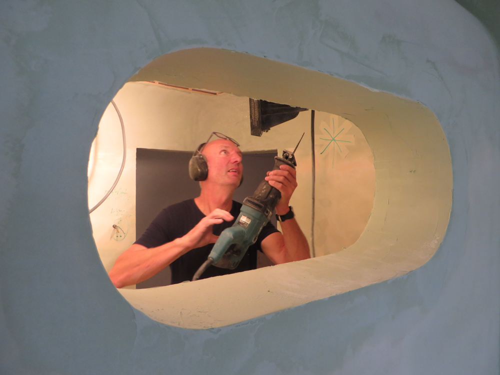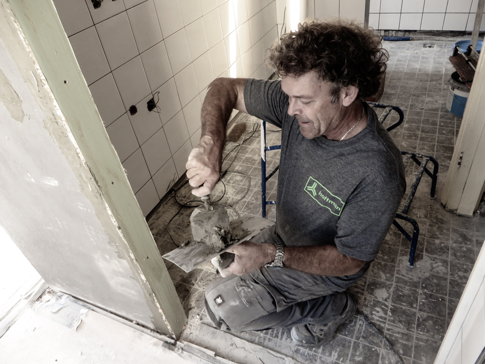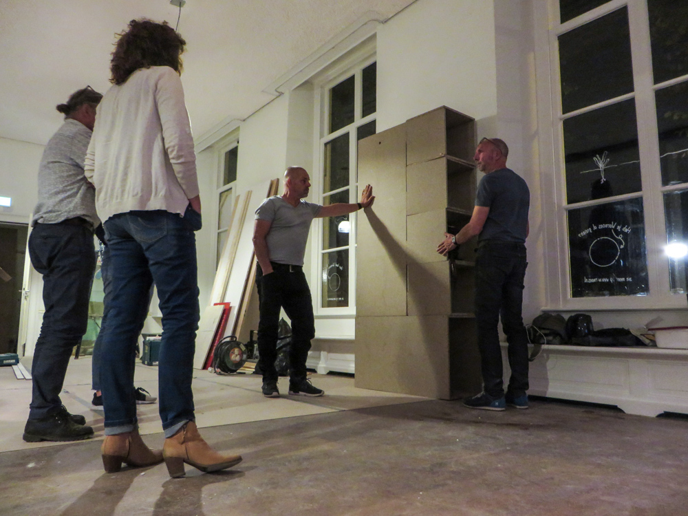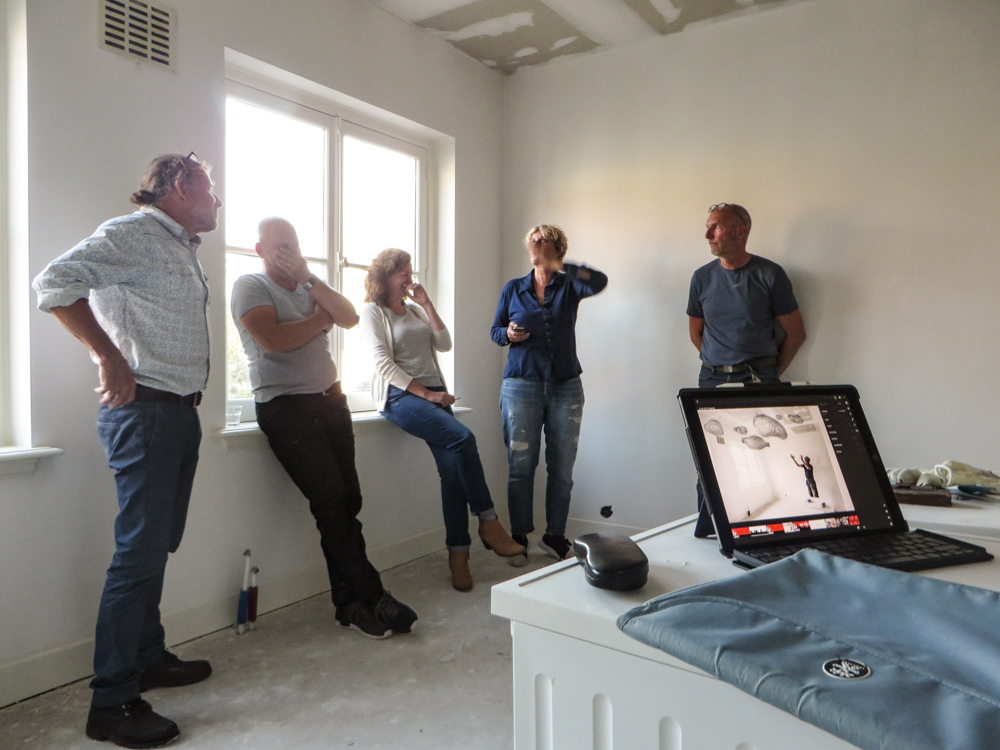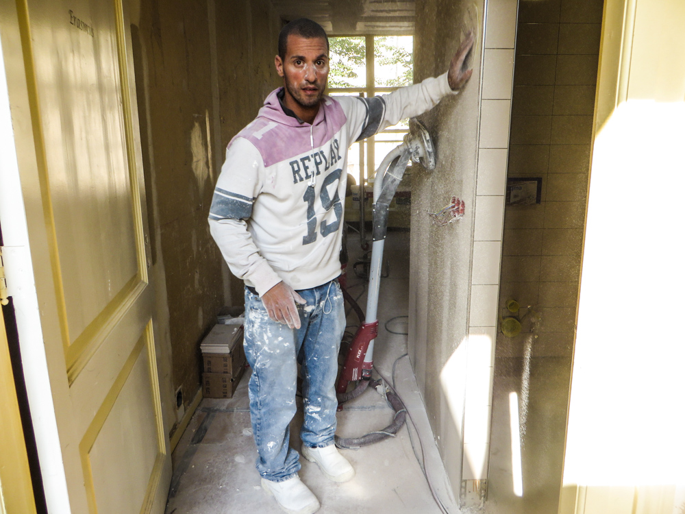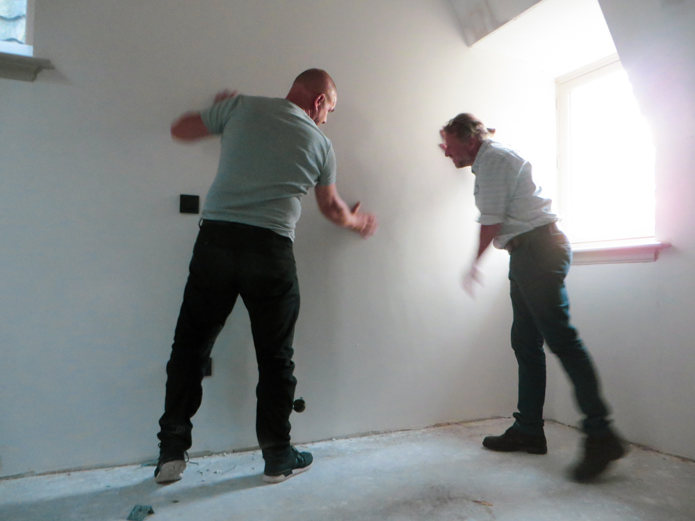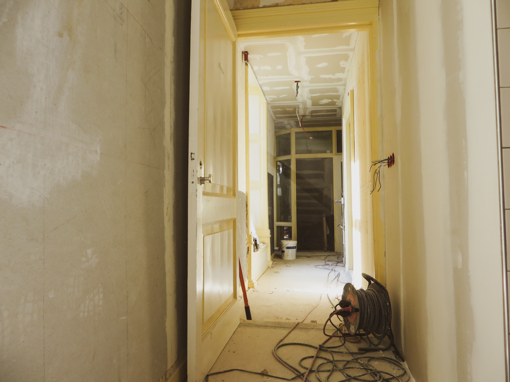 En dan krijg je de totale bouw en zo is het…….. Af en toe lijkt het alsof er een bunkerbom is ingeslagen in de 2 bovenste verdiepingen van de Latijnse School en waar de mannen van Krause en Hoffman, gewapend met troffel, emmer en striptang zich kranig verweren tegen opdringend stof en chaos. Maar gelukkig liggen er zandzakken voor de deur en gips, panlatten, rollen steenwol en restjes koffie met poeiermelk ( want ja bouwvakkers Hè ) Tenslotte moet je er gewoon even doorheen kijken, hier een muurtje , daar nog een kleine 350 vierkante meter stucwerk, 50 brandmelders, 265 stekkerdozen, een hectoliter muurverf RAl 9003, nog steeds de 3 Slowaken die het uitstekend met elkaar kunnen vinden, de installateur die spontaan een Burn-out krijgt na de 34e rookmelding en niet te vergeten het volkomen stressloze optreden van de kersverse hotelexploiteurs R & A. Uiteindelijk gaat het natuurlijk briljant allemaal, want langzaam beginnen zich uit die wolk van stof de contouren af te tekenen van dit spikplinternieuwe Stadshotel in the heart of the City. 2e verdieping heeft de bouwaanval uitstekend doorstaan en lijkt bijna klaar om ingericht te worden, 1e verdieping moet nog wat puin geruimd worden, voordat daar ook de vloertjes ingetimmerd zijn. Maar zet je X-Ray ogen op en je ziet opeens licht en elegantie ontstaan, daar waar vroeger een dikke bruine saus door het gebouw heen liep de deur uit, het Grote Kerkhof op. Jawohl wir haben es gewusst, daaronder die dikke muren klopt een warmbloedig hart. To be continued……